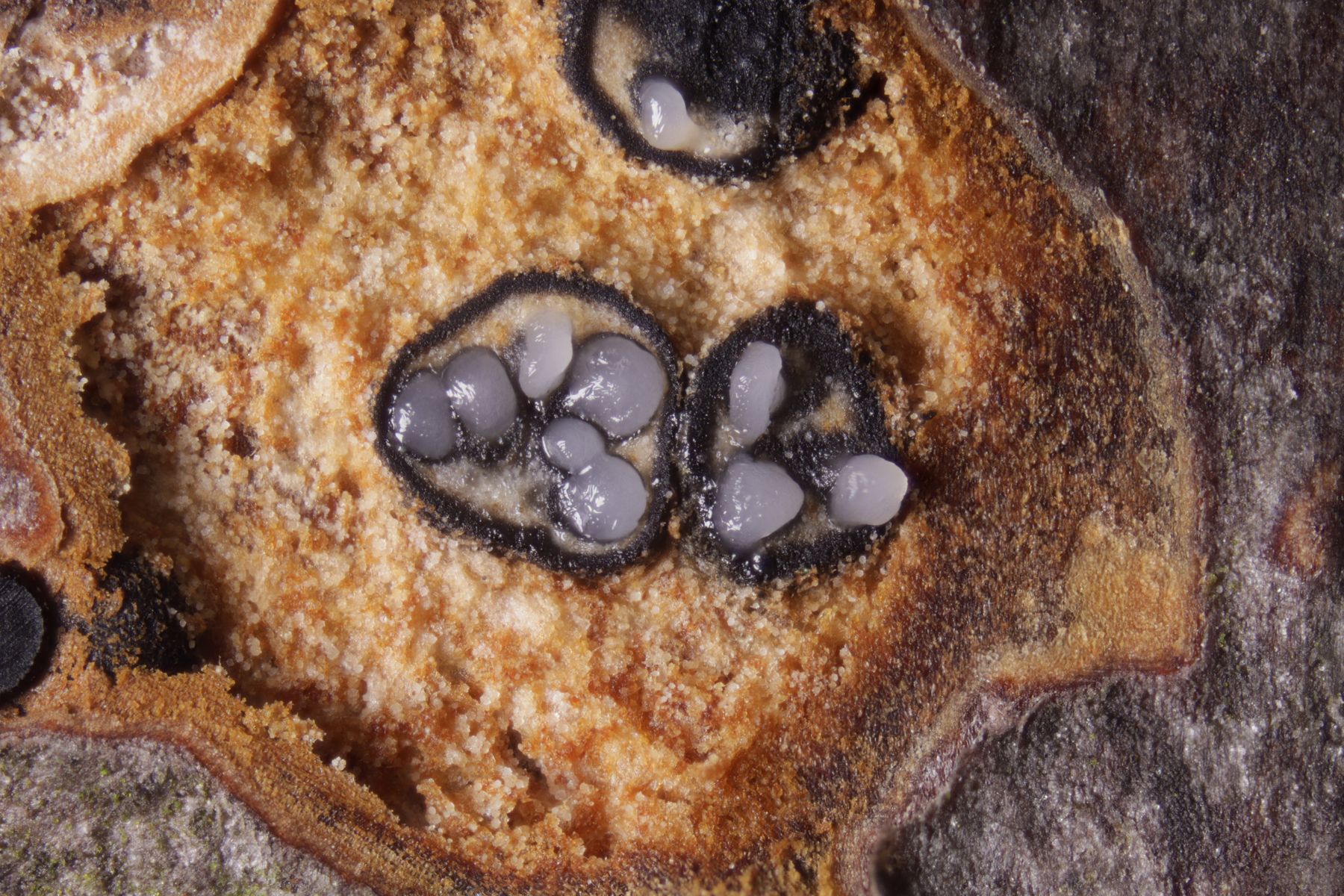 zu dem schwarzen Knubbel habe ich leider keine Idee. Das sieht mir aber auch eher nach Konidien als nach Ascosporen aus....da schmeißt man das eh lieber schnell weg