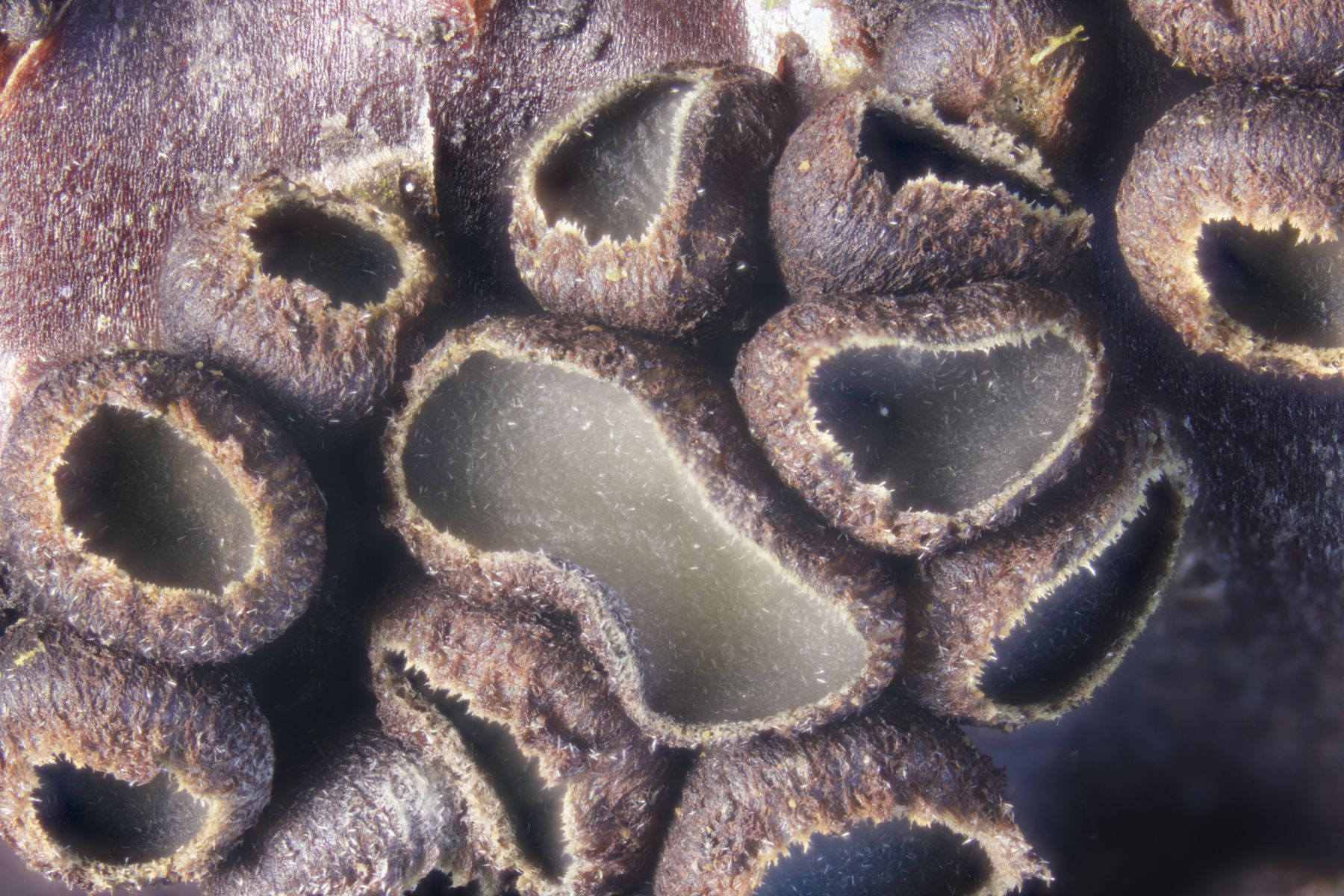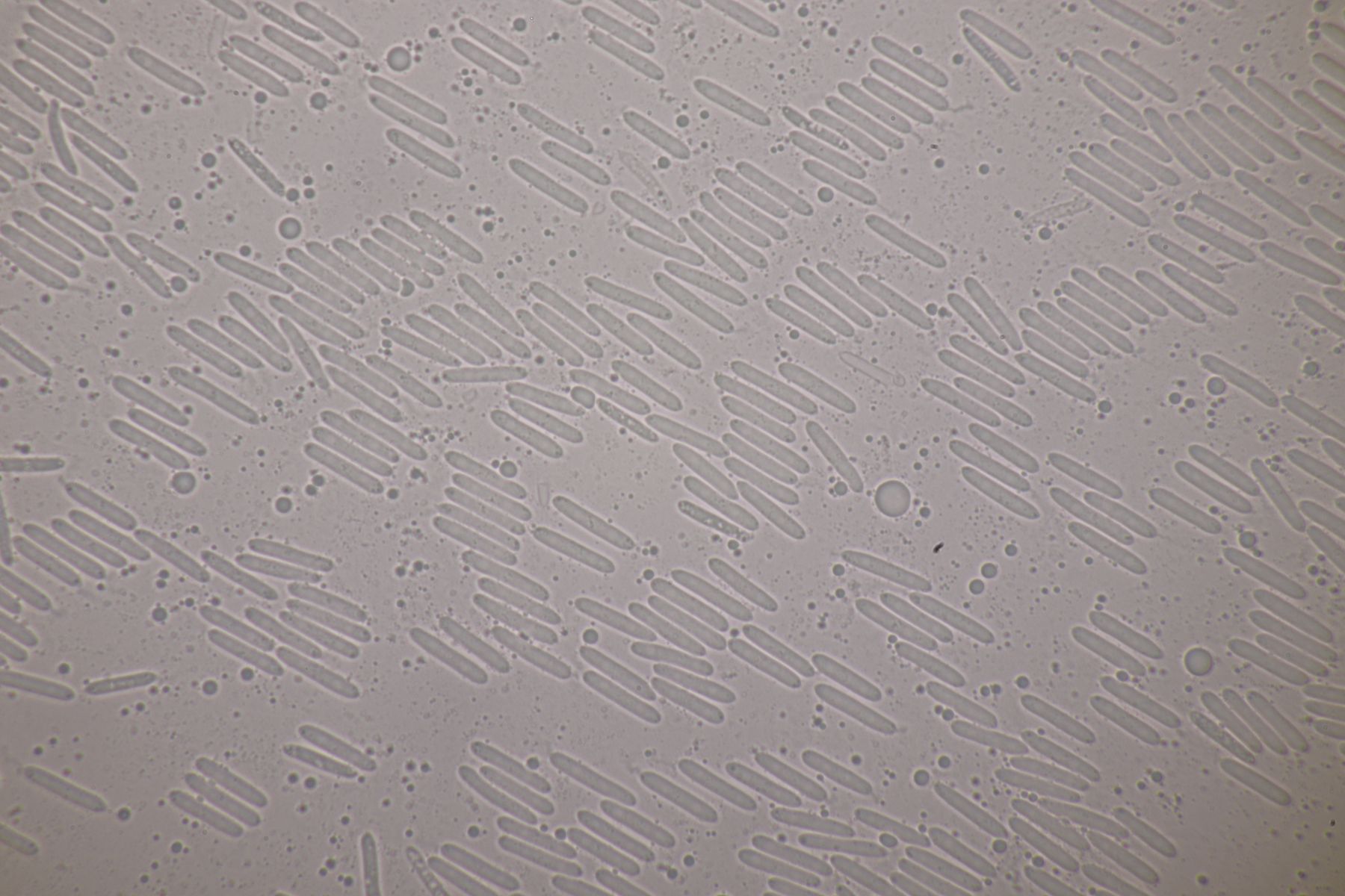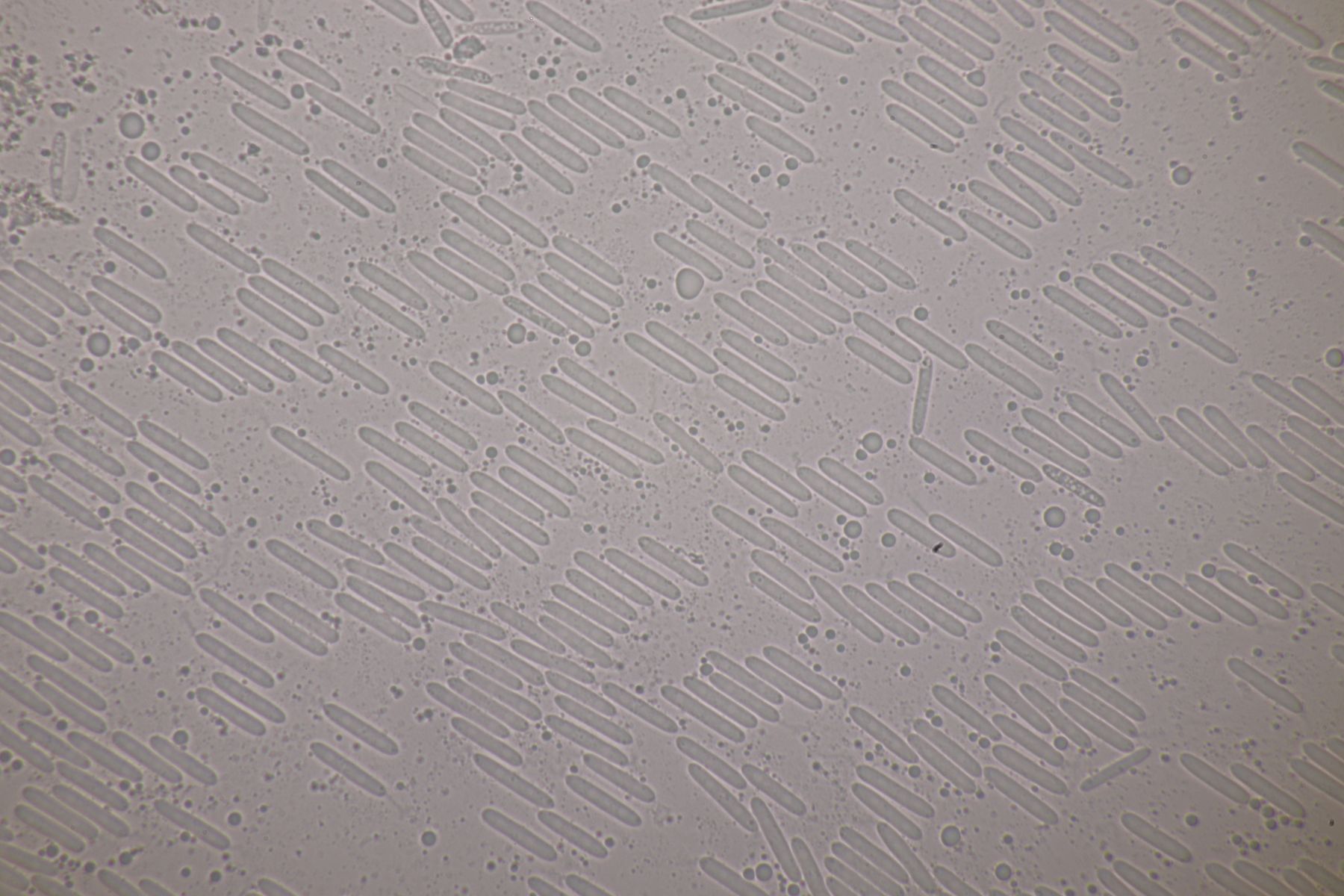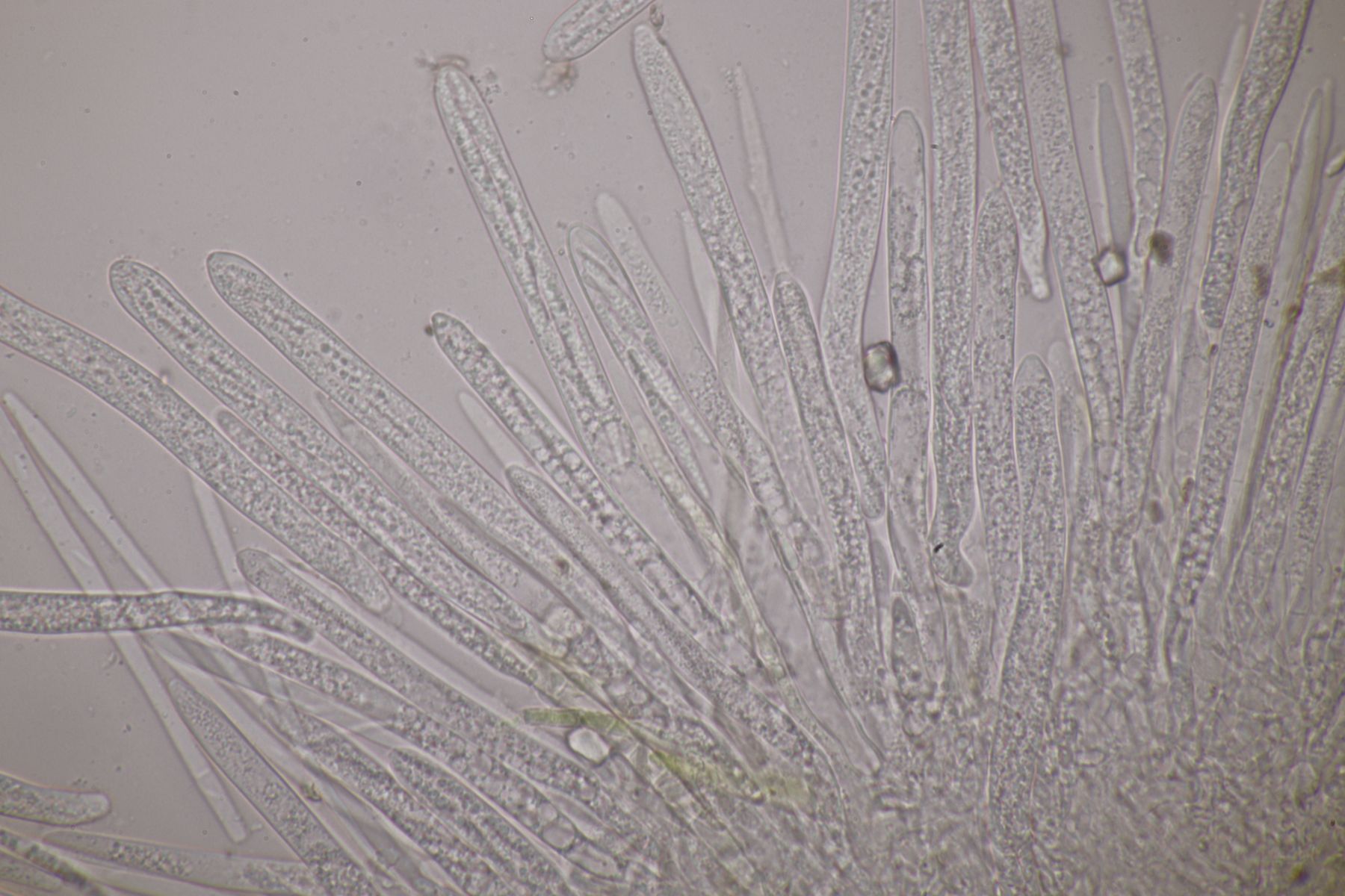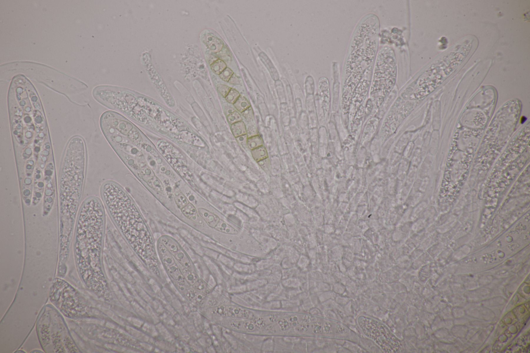 1. Ein Saccobolus, Sporencluster 43-47 µm x 17-18 µm mit Pattern II, Sporen 15-18 µm x 8-10 µm, das Ornament fein warzig. Wegen fehlender gelber Farbe verorte ich den in der Sect. Eriobolus und schlüssele dort mit van Brummelen schnell zu Schritt 5. Das Excipulum scheint eine textura globulosa zu sein, aber weder S. depauperatus noch S. diaphanus passen wirklich. Geht man den anderen Schlüsselschritt, landet man in der versicolor-Hölle :-\