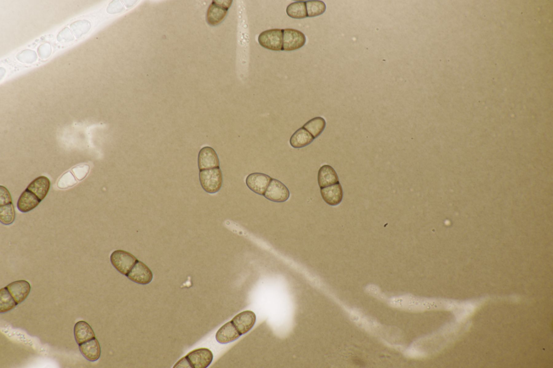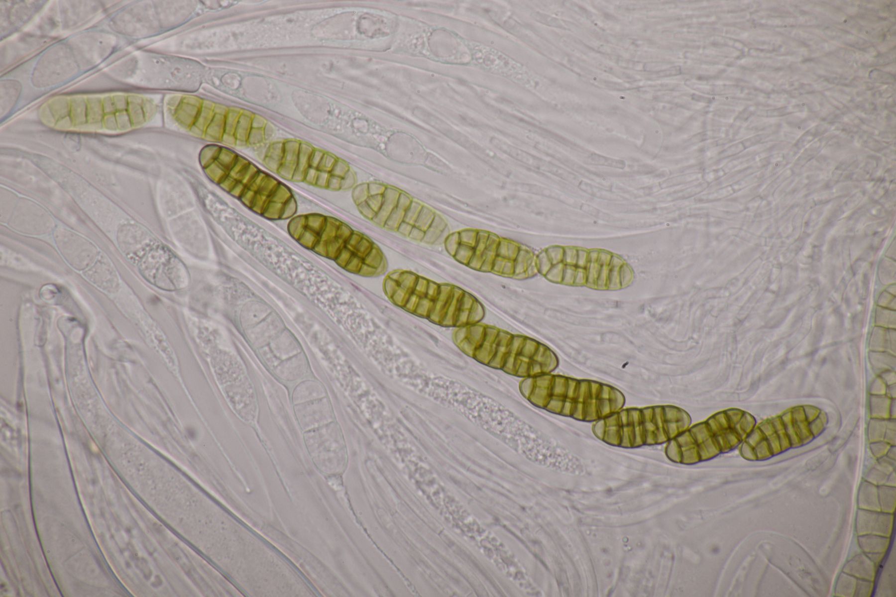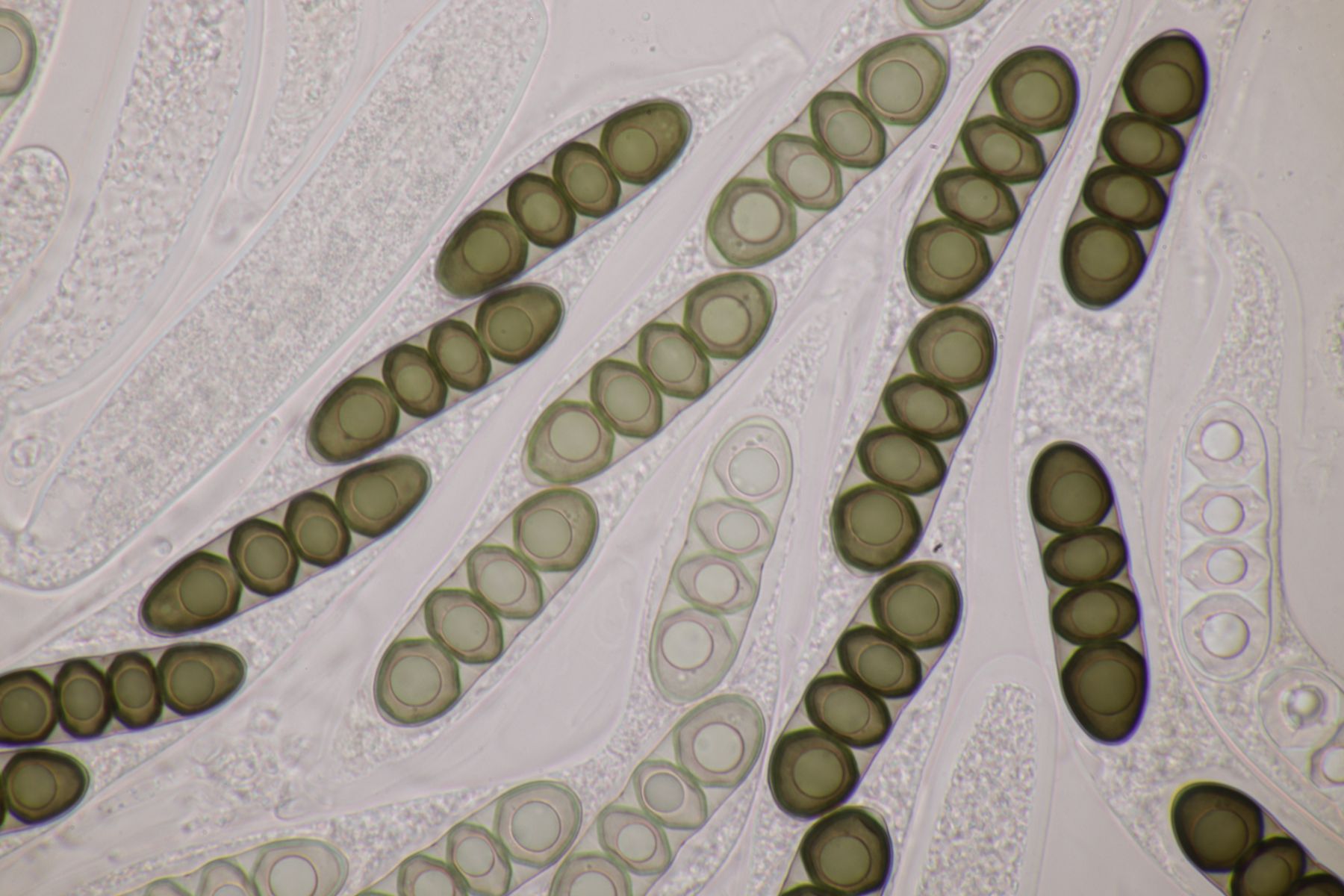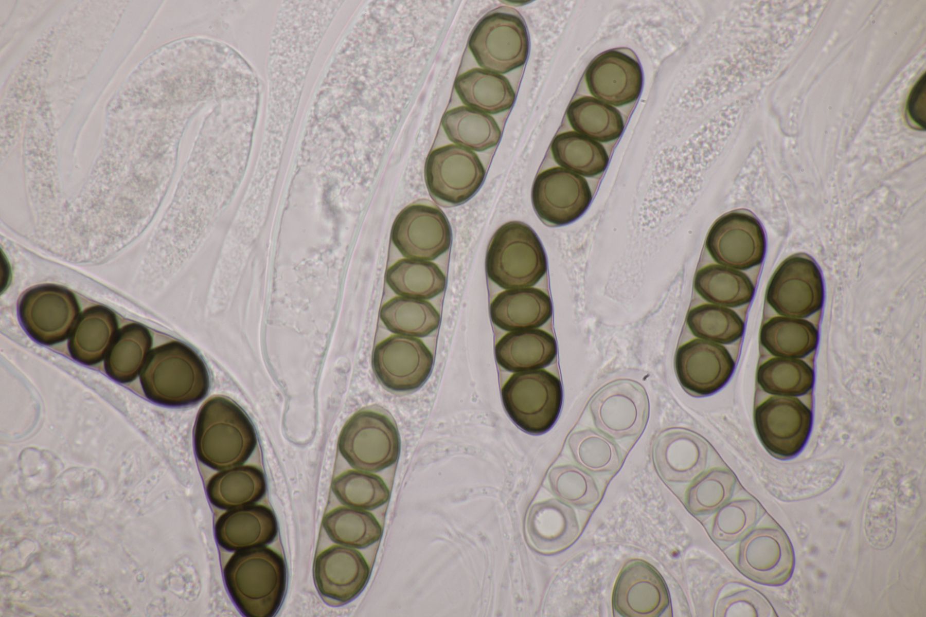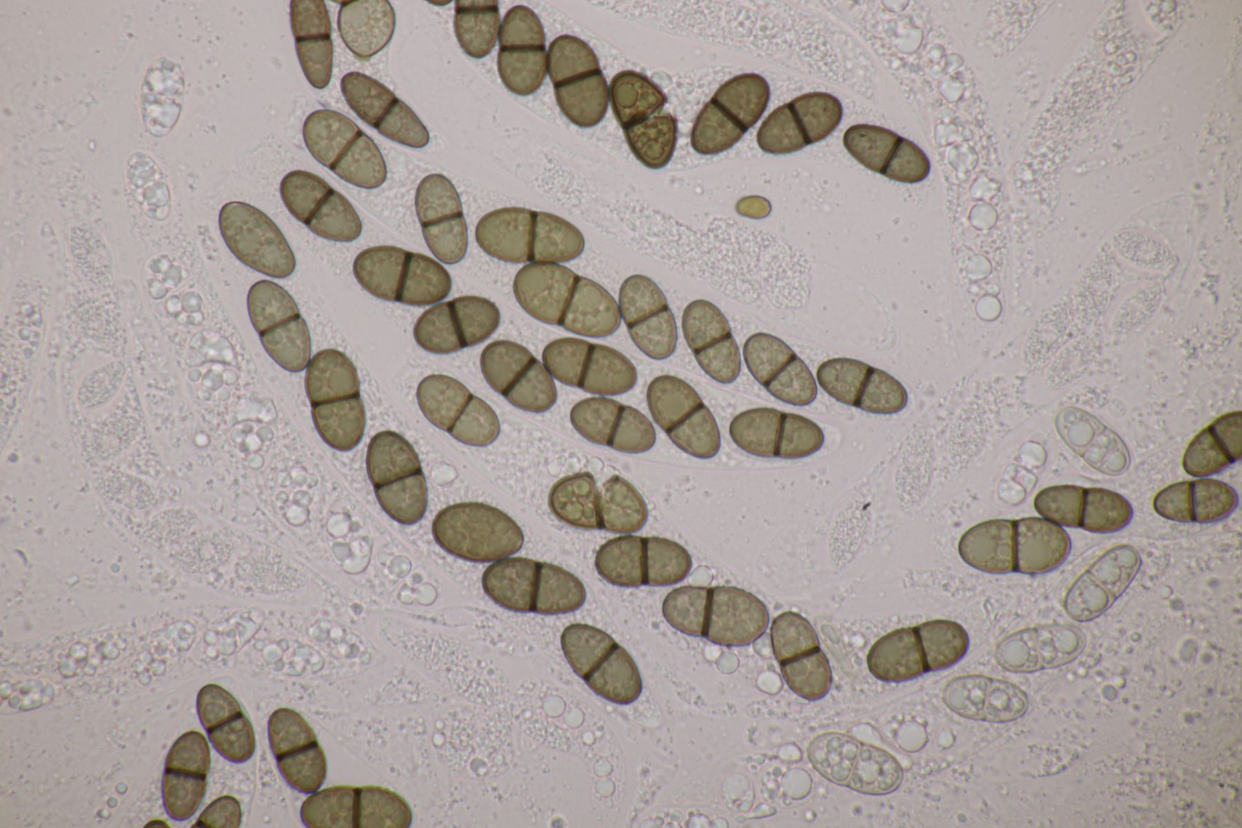 Ich würde das Substrat aber nie in KOH einweichen, sondern immer nur in Wasser. Auch wenn Pyrenomyceten meist sehr robust sind, sind es immer noch Ascomyceten und die gehören erstmal in Wasser und nicht in KOH oder andere Chemie. Später kann man dann gerne einen Tropfen Lugol und danach auch Kongorot ins Präparat geben um zu schauen, ob der Apikalapparat verfärbt (das wird hier aber wohl nicht der Fall sein). Ansonsten hilft es, wenn man im Präparat die Ascusmasse von der harten Schale (und sonstigem Dreck) separiert und dann den ganzen Schmock vorsichtig entfernt. Dadurch bekommt man ein viel flacheres Präparat hin und kann dann auch bei nur wenigen vorhandenen reifen Sporen diese gut beurteilen. Beim konkreten Fall hier, der wohl Richtung Leptosphaeria geht, wird es nämlich wichtig sein, die Zellenzahl und Größe der Sporen zu beurteilen (und ggfs. ob an den Enden Schleimhüllen vohanden sind).