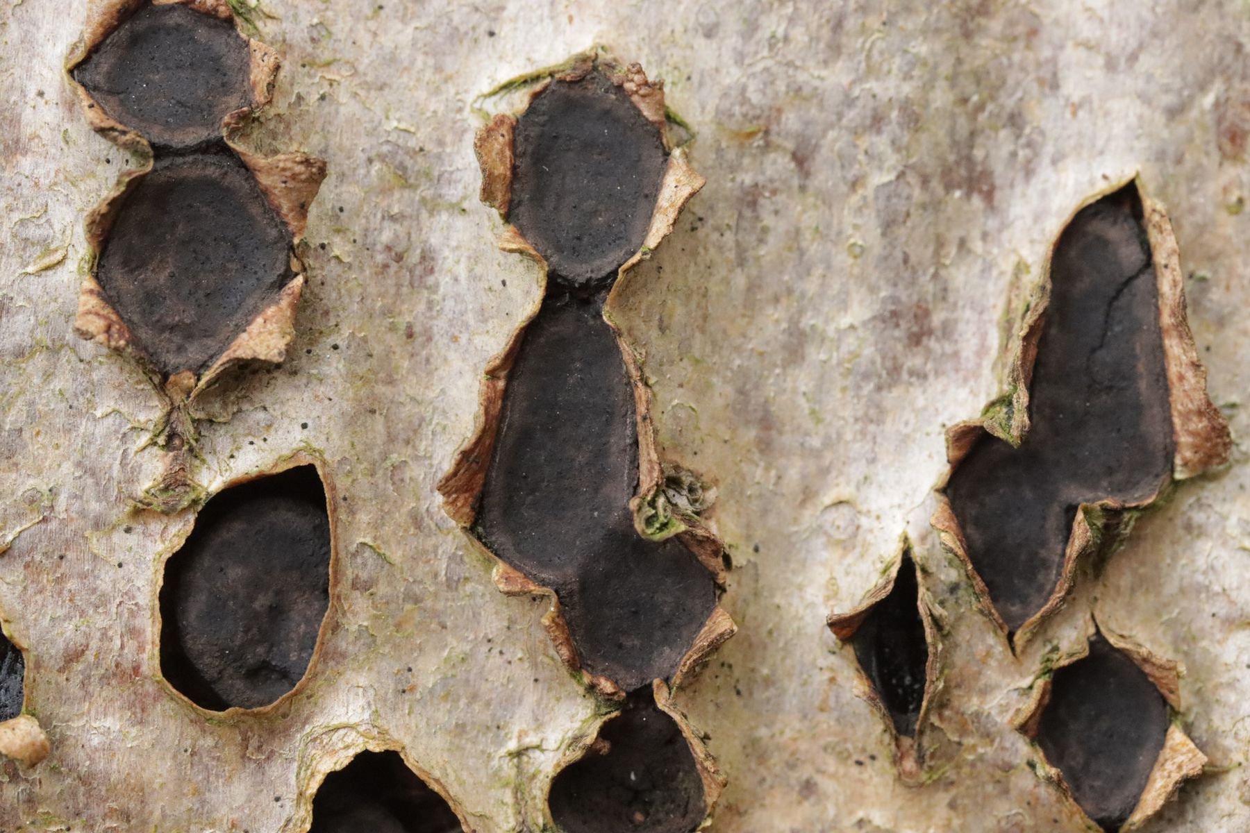 Makrofotos gibt es nicht, weil man auf den Stöckchen selber nur schwarze Pusteln oder Erhebungen sieht. Im Anschnitt dann eben die aufgeschnittenen Perithecien. Das ist alles recht unspektakulär und winzig, so daß ich da durchs Mikro fotografieren und stacken müßte.