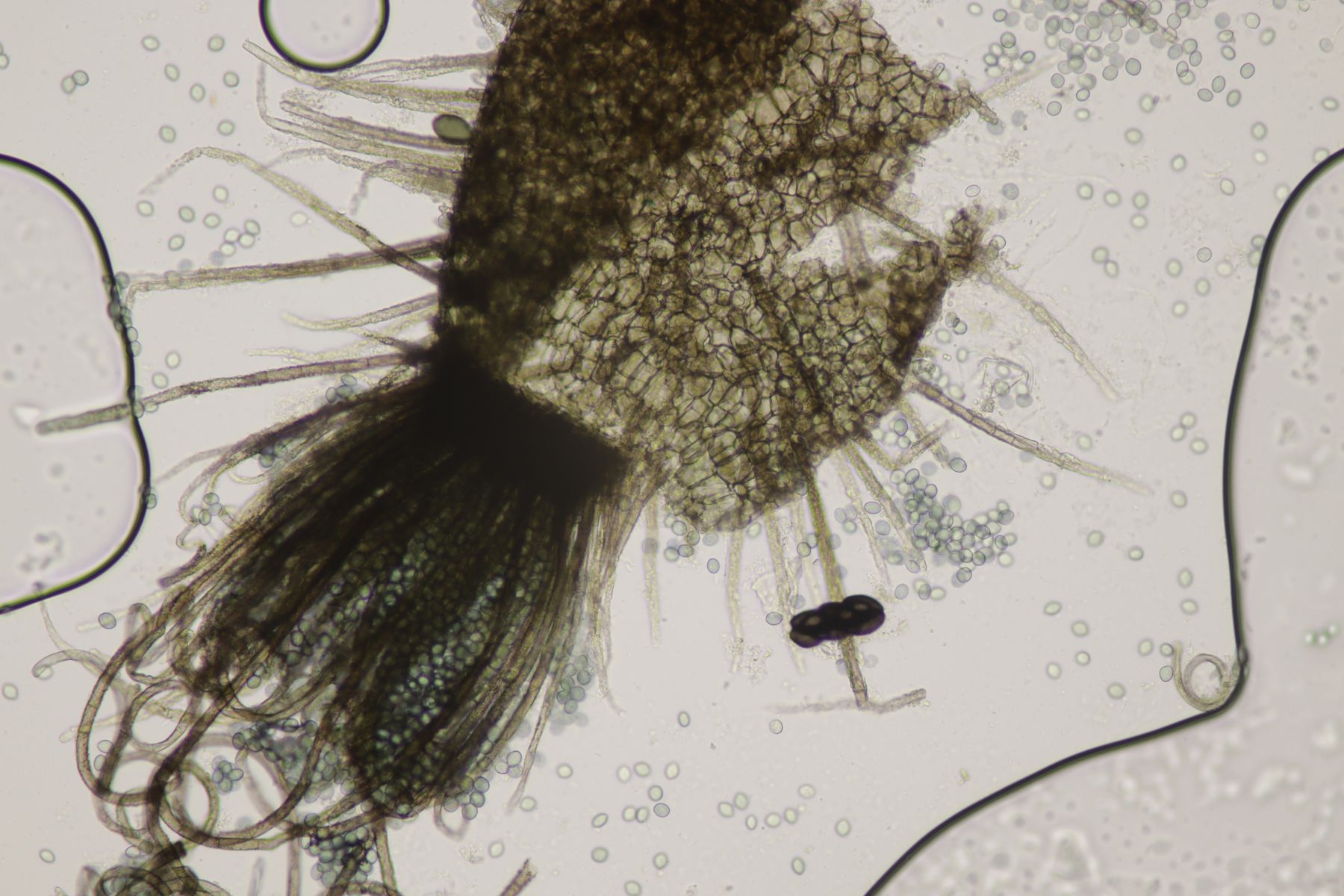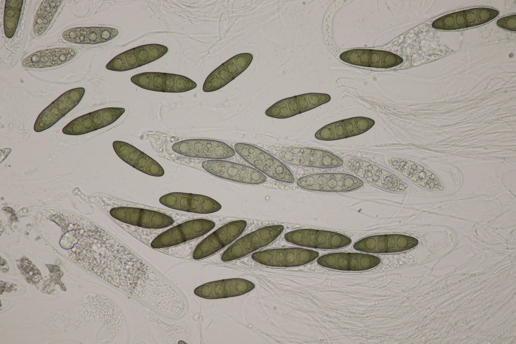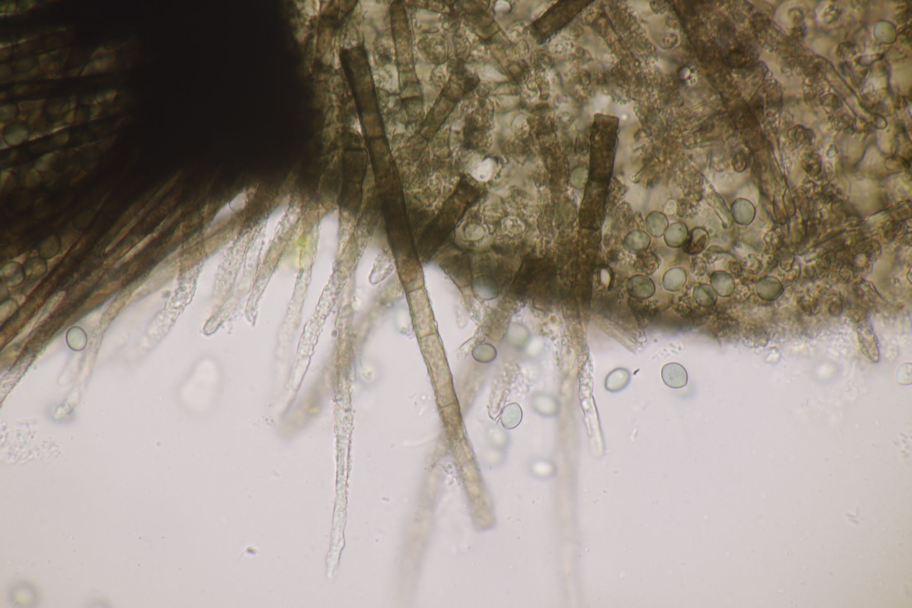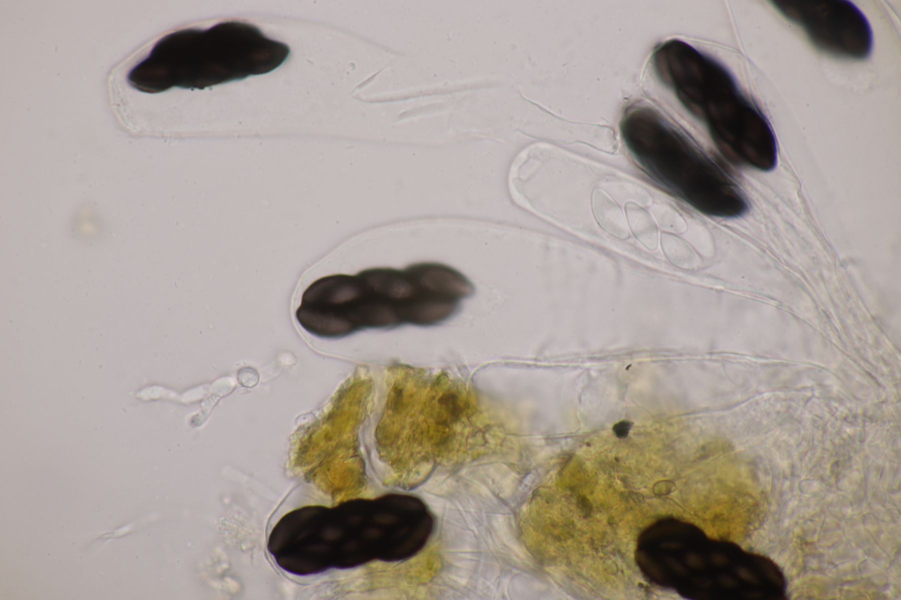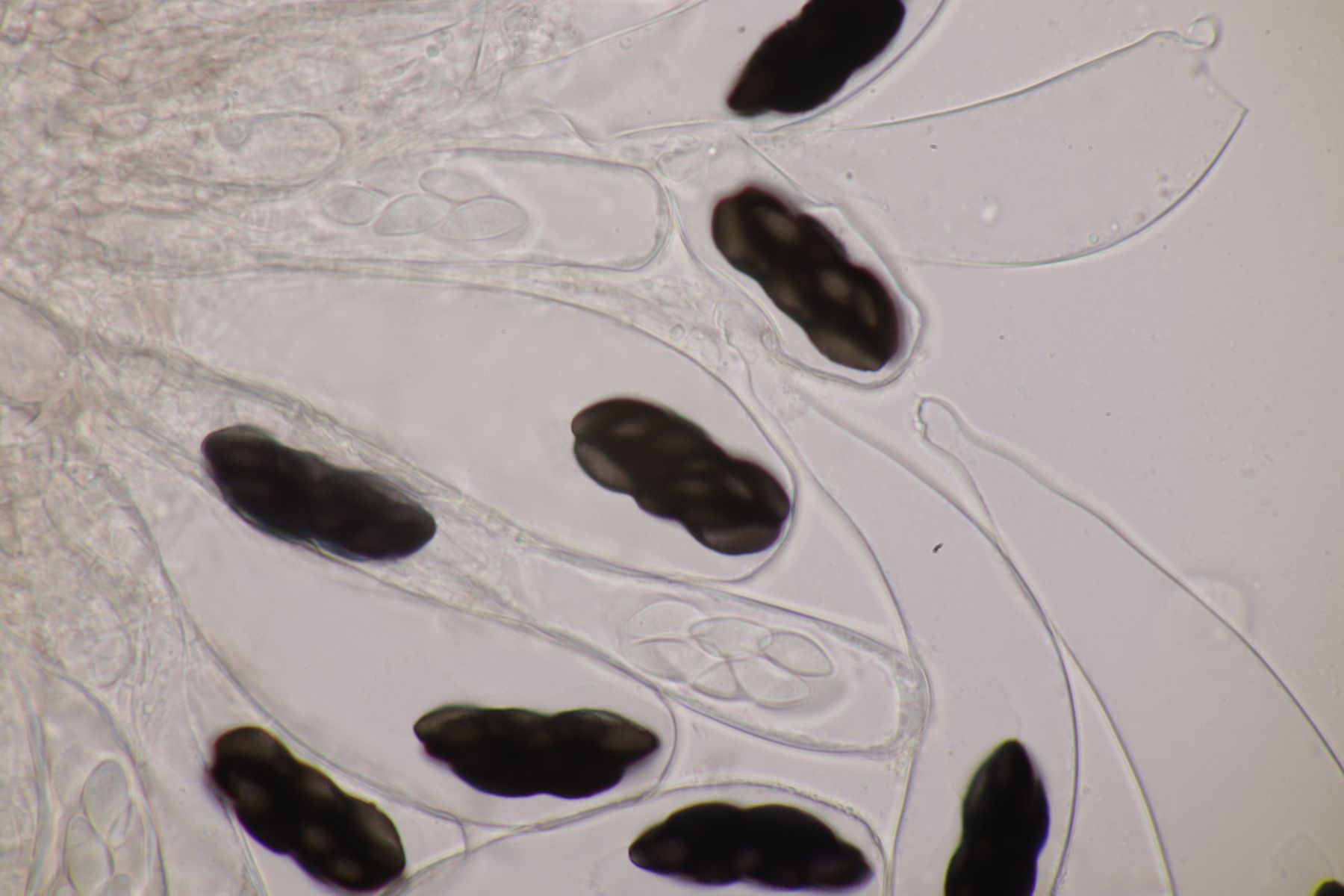 2. Dann kamen Saccobolusse. Bei diesem hier messen die Sporencluster 41-46 µm x 15-17 µm, die Sporen 17 x 7-8 µm. Auffällig die insgesamt sehr dunklen Sporen und die relativ kompakten, festen Cluster. Ohne gelbe Paraphysen also zur Sect. Eriobolus, wo man mit van Brummelen dann bei S. versicolor auskommt. Aber das scheint ja eine schwierige Gruppe zu sein, wenn man den Diskussionen hier im Forum folgt.