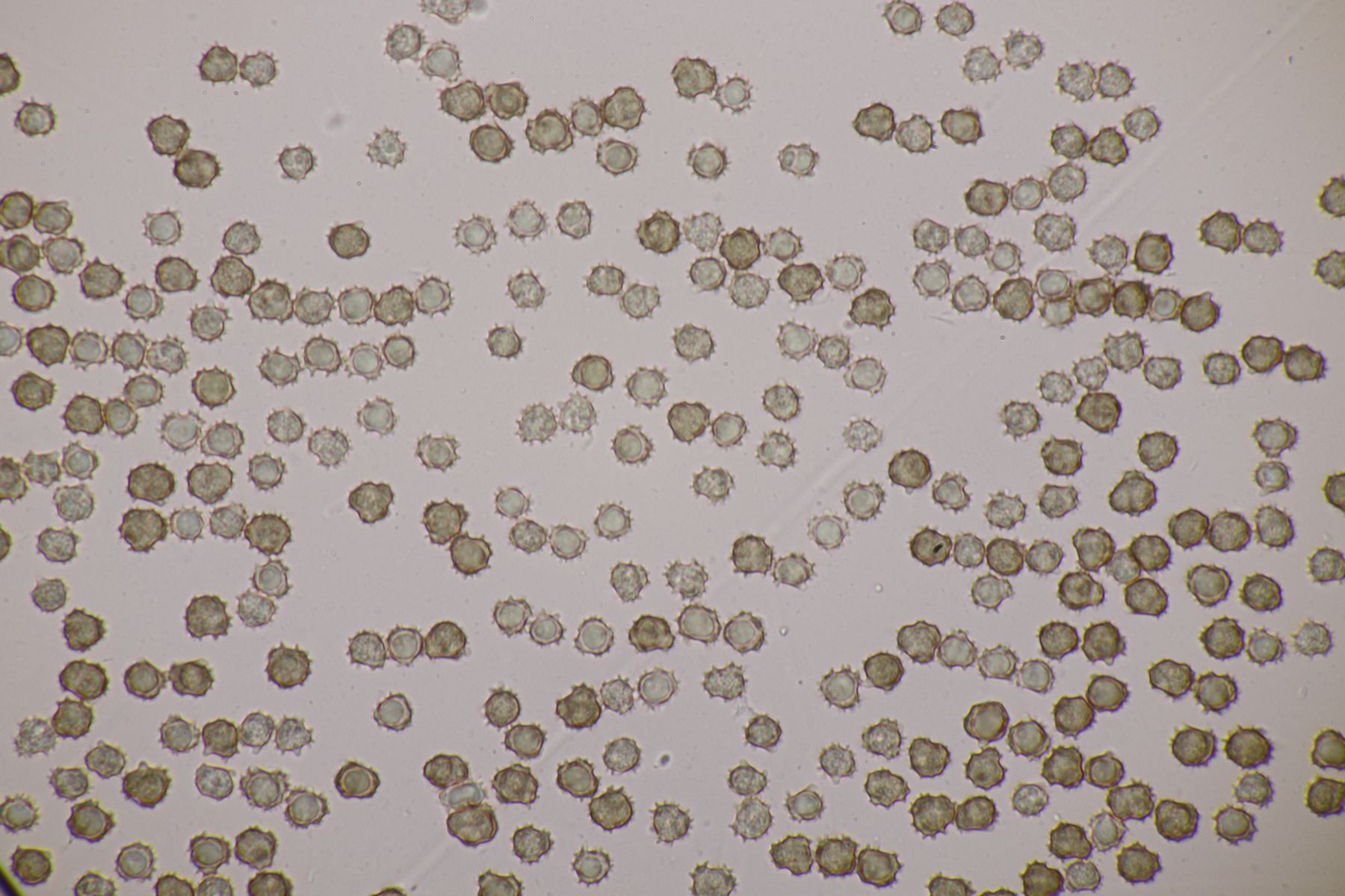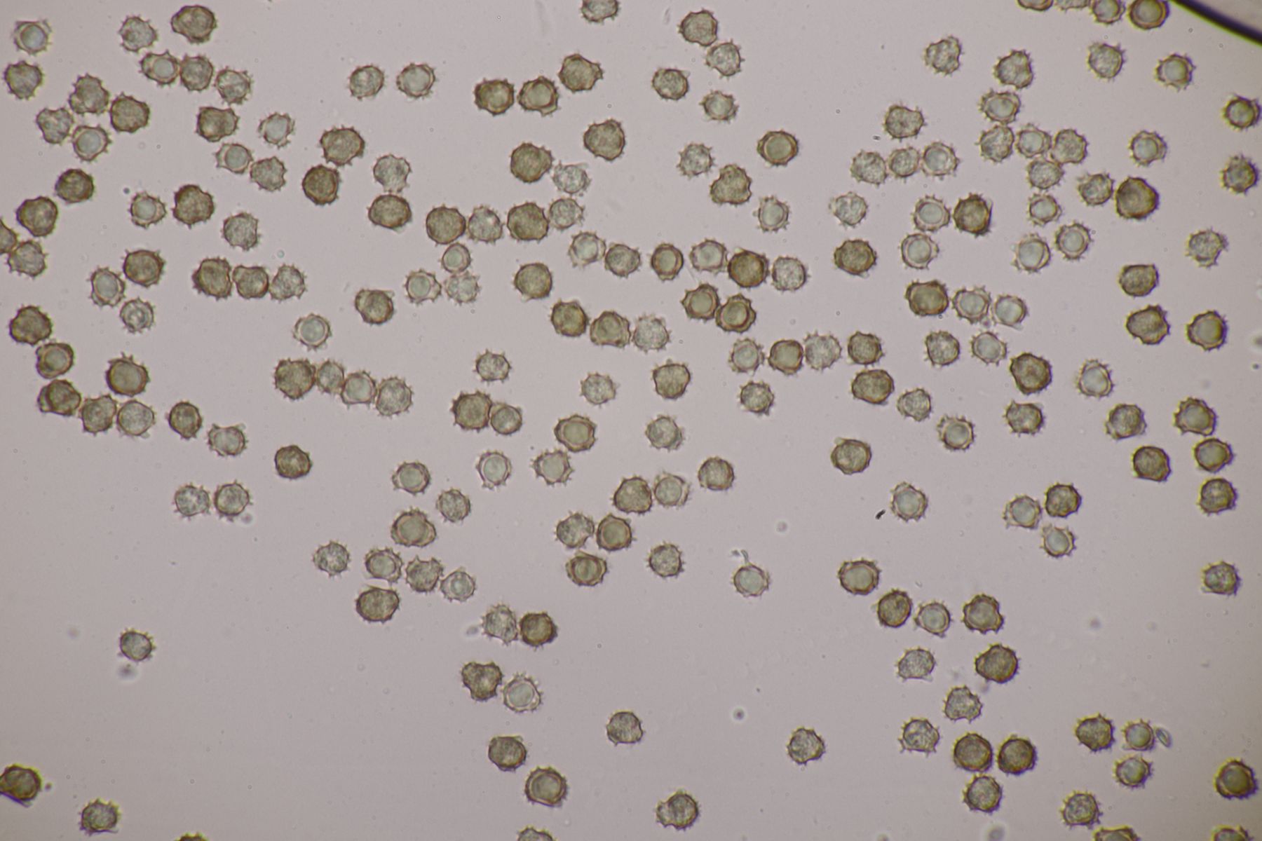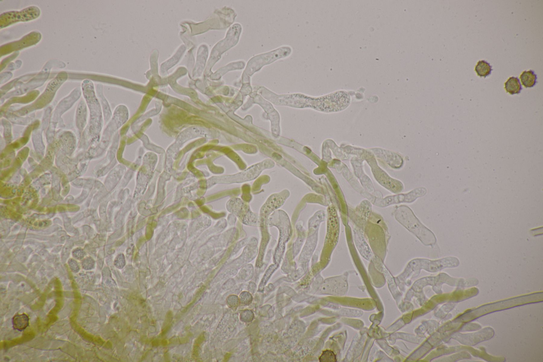 Los geht es mit dem ersten Fund, der an Laubholz wuchs, Begleitbäume waren Fagus und Corylus. Die Sporen messen 9.7+-0.4 x 8.1+-0.7, Q=1.2+-0.1, 8.6-10.5 µm x 7.1-9.3 µm, Q=1.1-1.4, Stacheln bis 1.7 µm, nicht bifurkat und die Sporen sind irgendwo zwischen rundlich und schwach elliptisch zu verorten. Zystiden gibt es keine, Schnallen sind vorhanden, das Hymenium ist nicht cyanescent, wobei ich aber an einigen Stellen doch einige wenige cyanescente Elemente beobachten konnte.