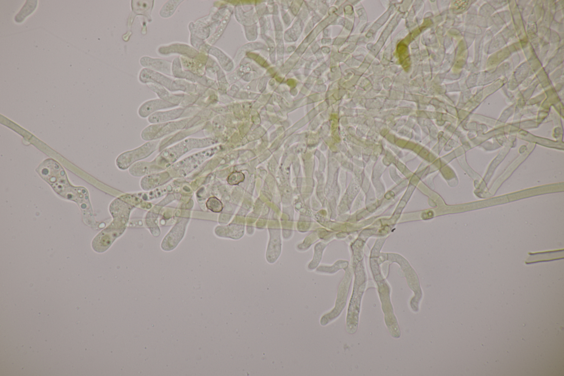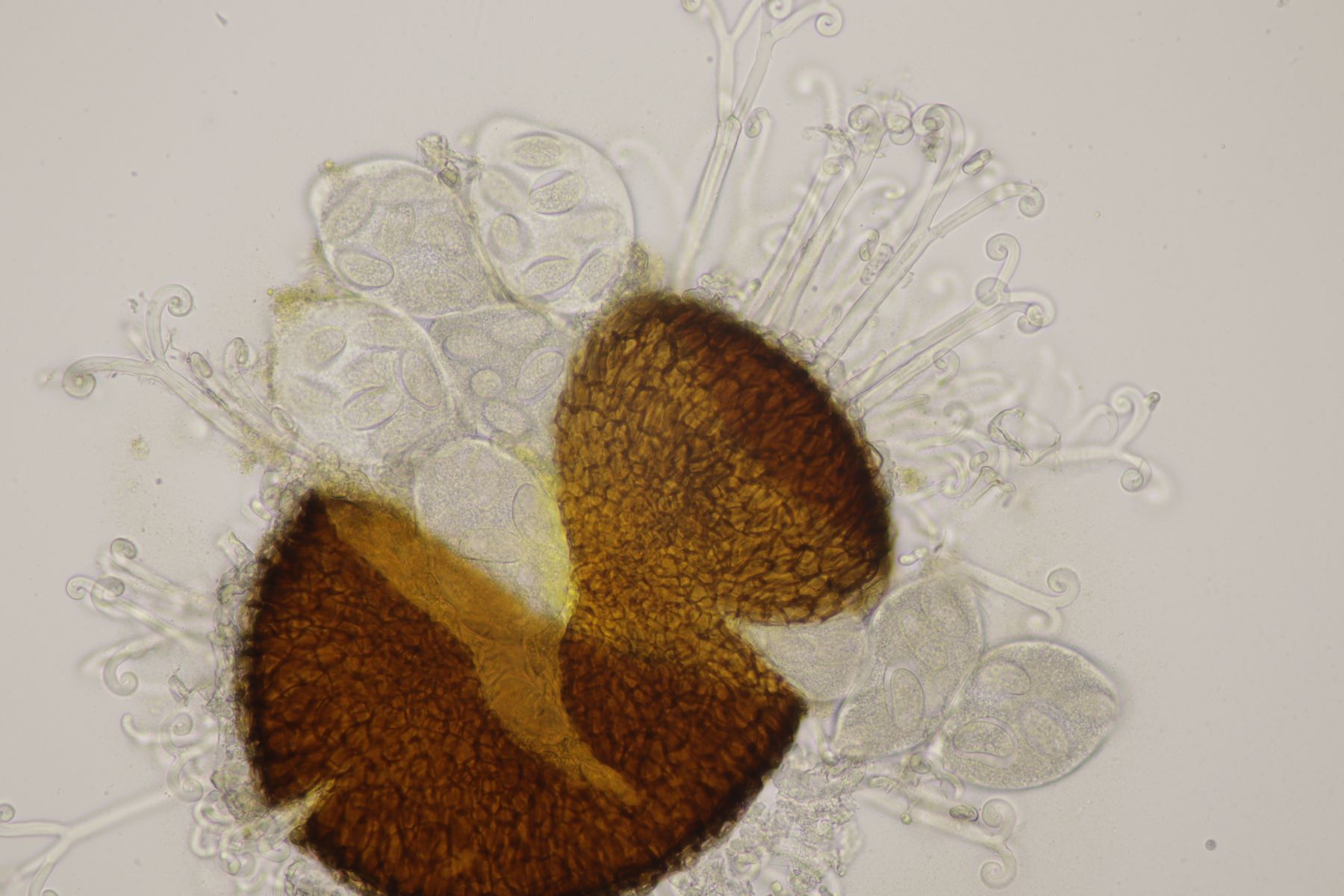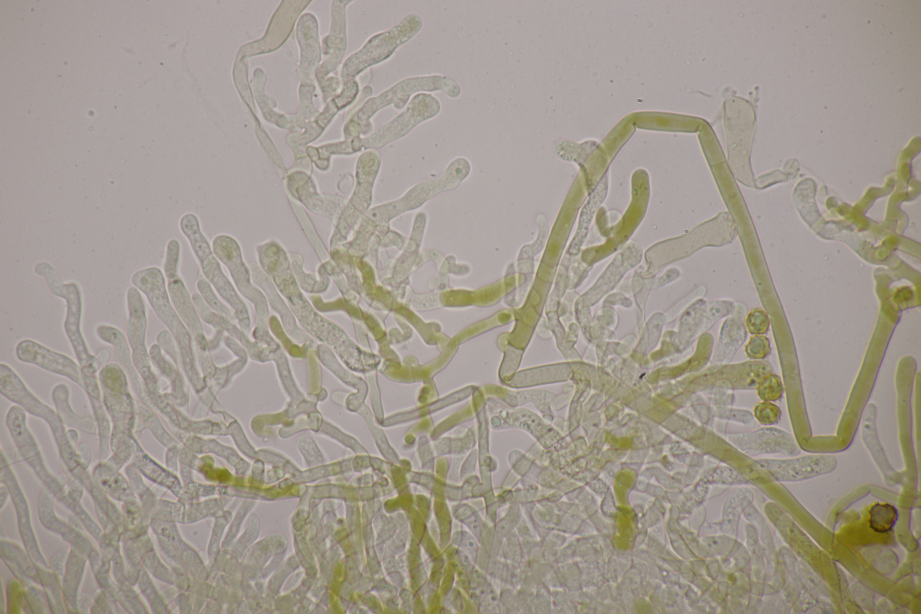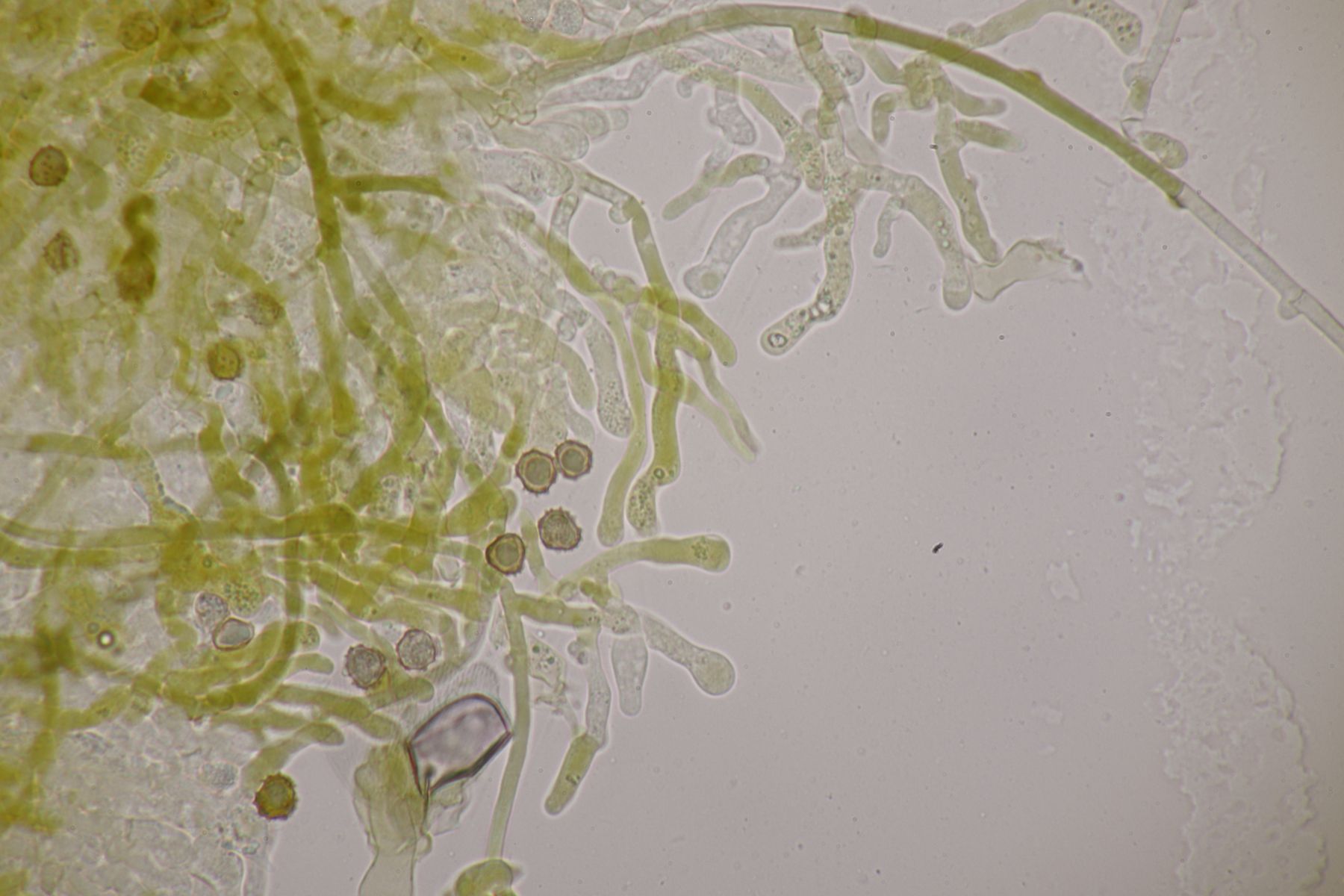 da Ralf und ich uns seit seinem letzten Sirobasidium-Fund immer noch nicht wieder bei Exkursionen getroffen haben, hat er mir den Ast jetzt einfach per Post zugeschickt. Der Fund ist dann natürlich auch direkt unters Mikroskop gewandert und ich denke, daß ich diesmal Bilder machen konnte, die etwas zufriedenstellender als die von 2020 sind.