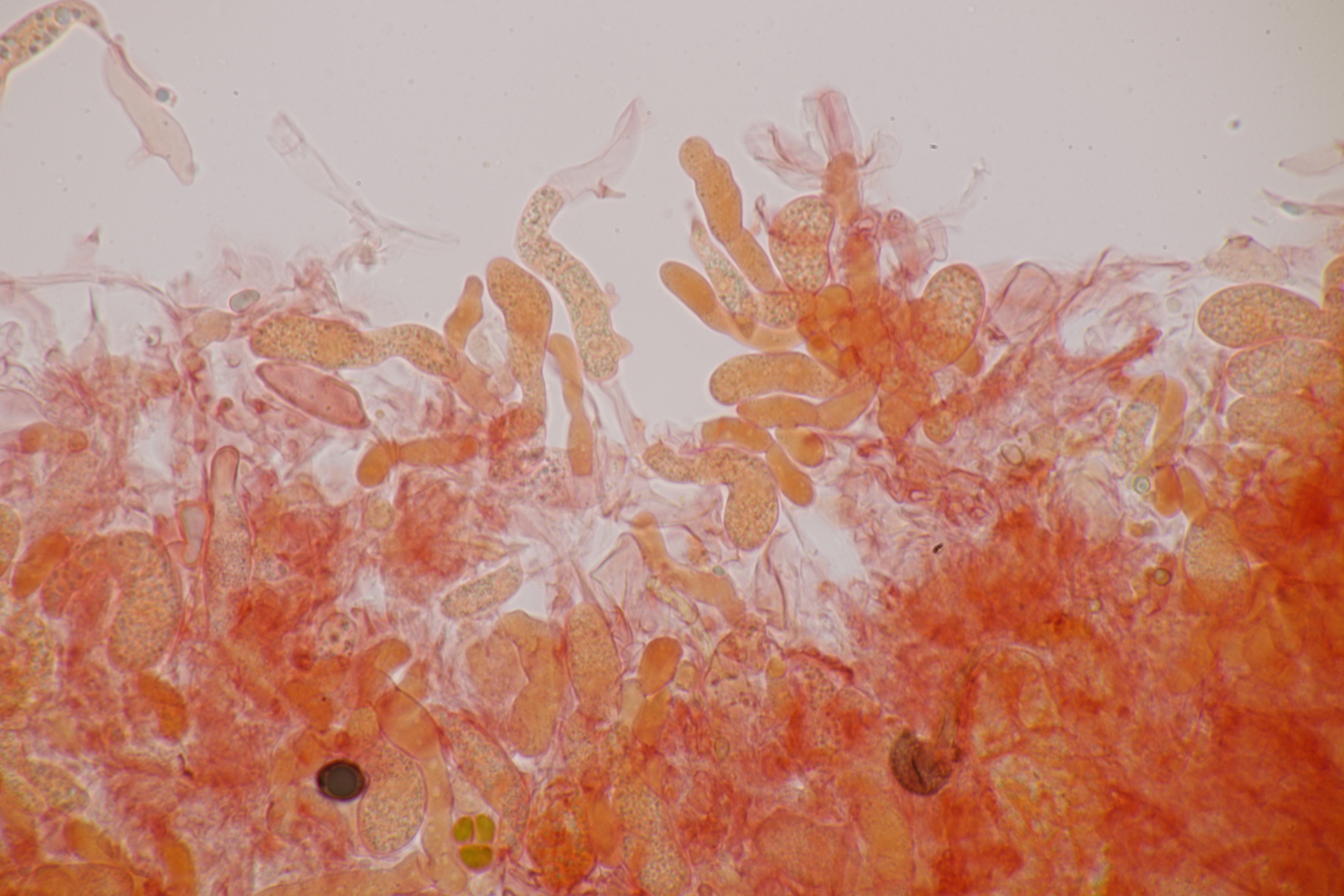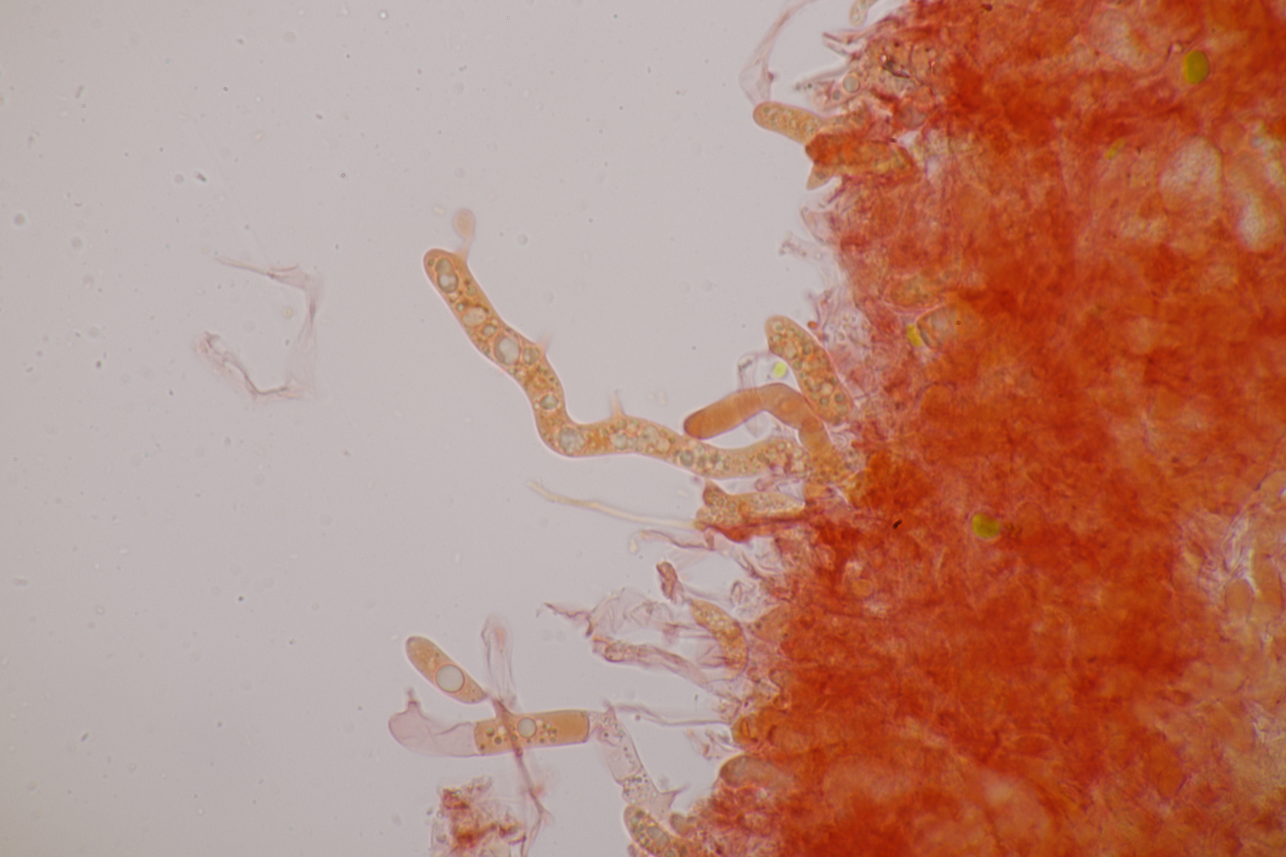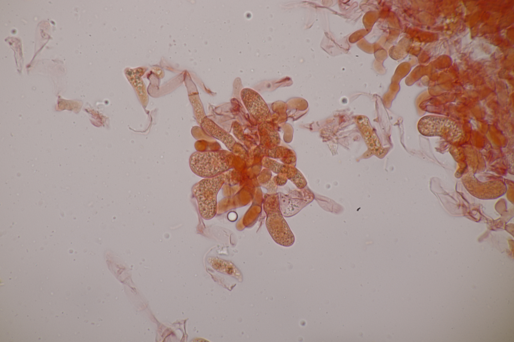 genau, die runden Kugeln sind die Basidien, die vierfach septiert sind, was man auf einigen Bildern auch erkennen kann. Aus der Basidie wachsen dann die vier Sterigmen, die hier wie bei vielen Phragmobasidiomyceten sehr lang sind im Verhältnis zur Basidie. Oben an den Basidien dann wie von anderen Pilzen gewohnt dann die sich bildenden Sporen.