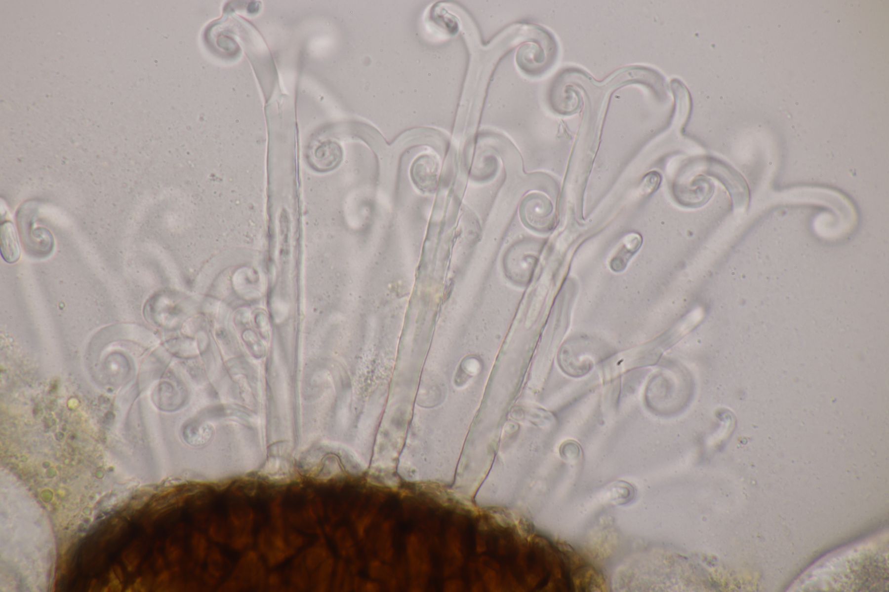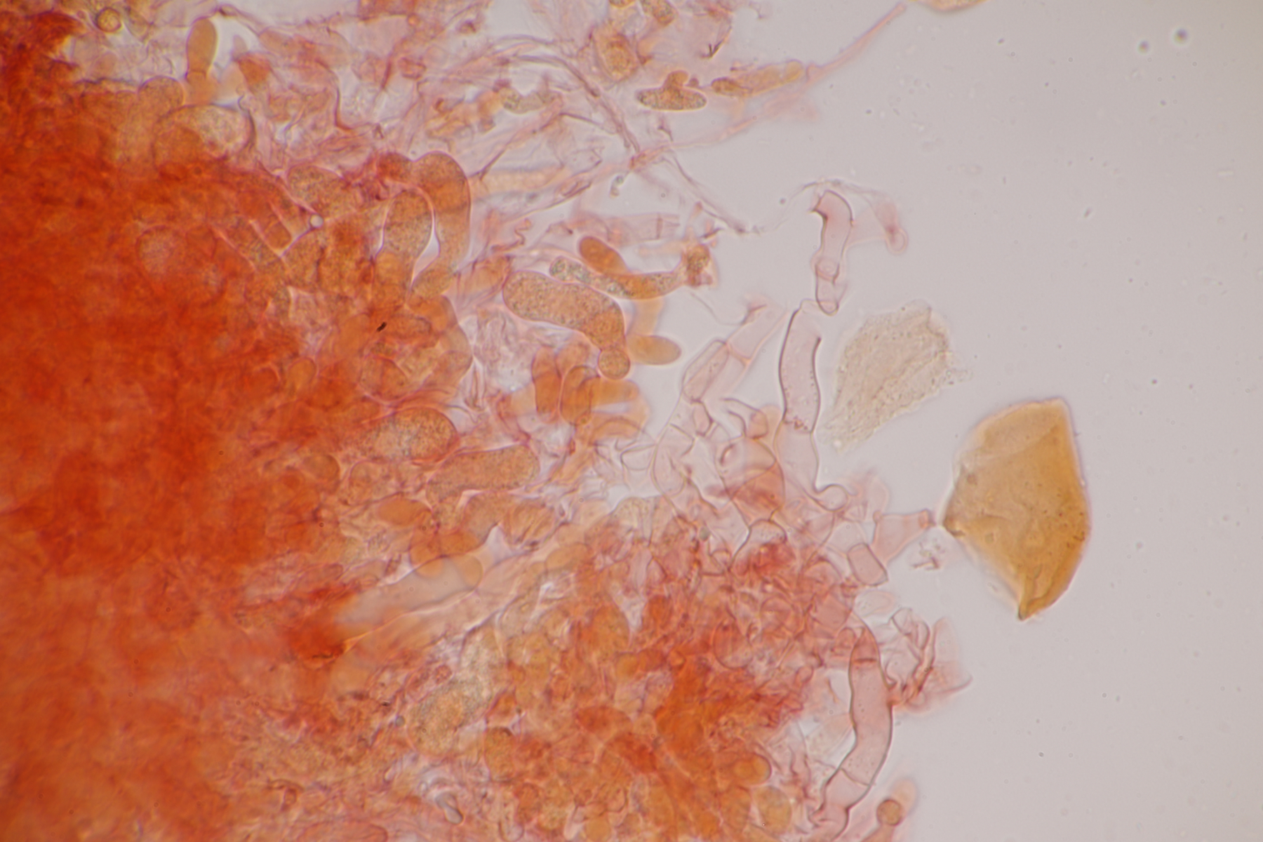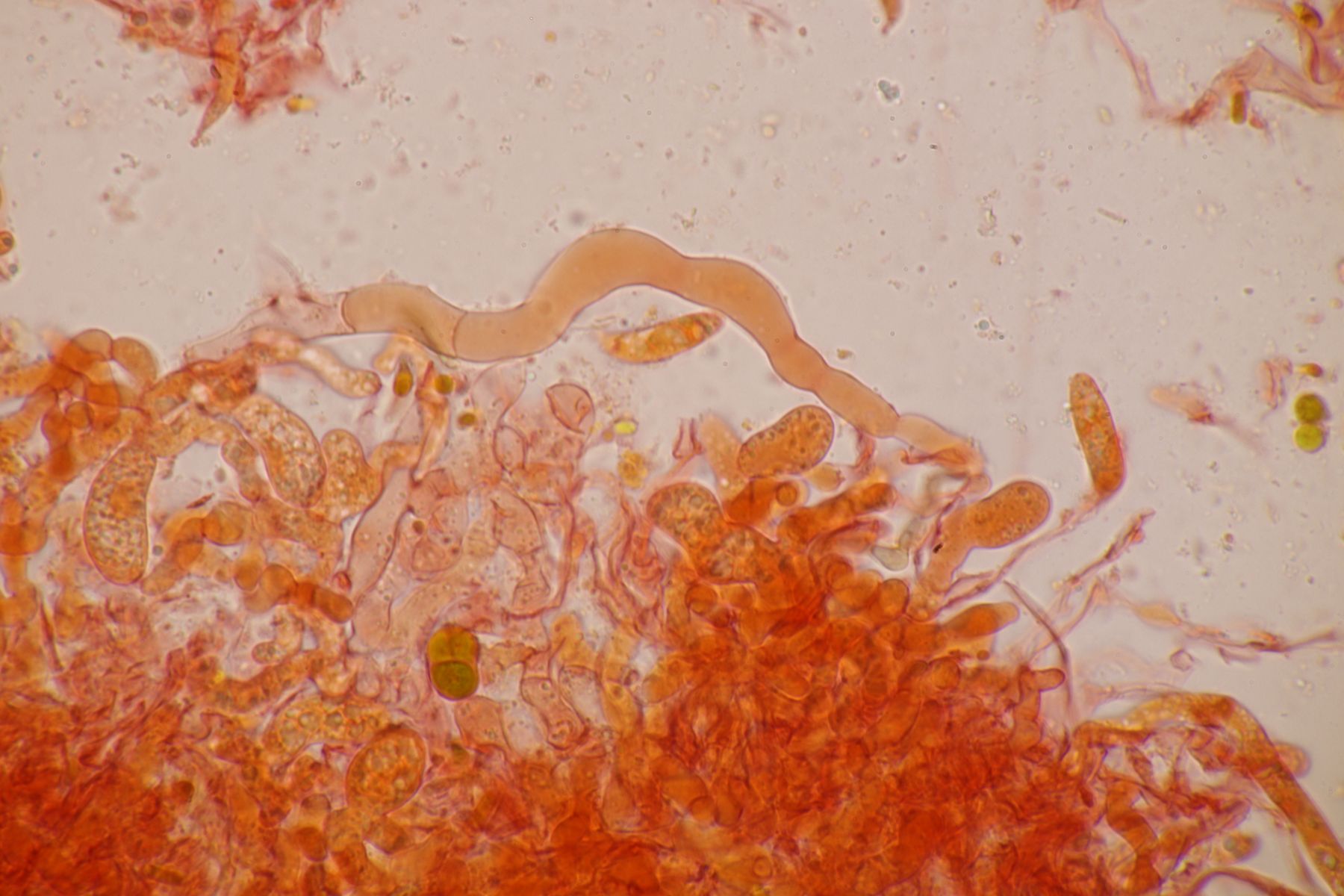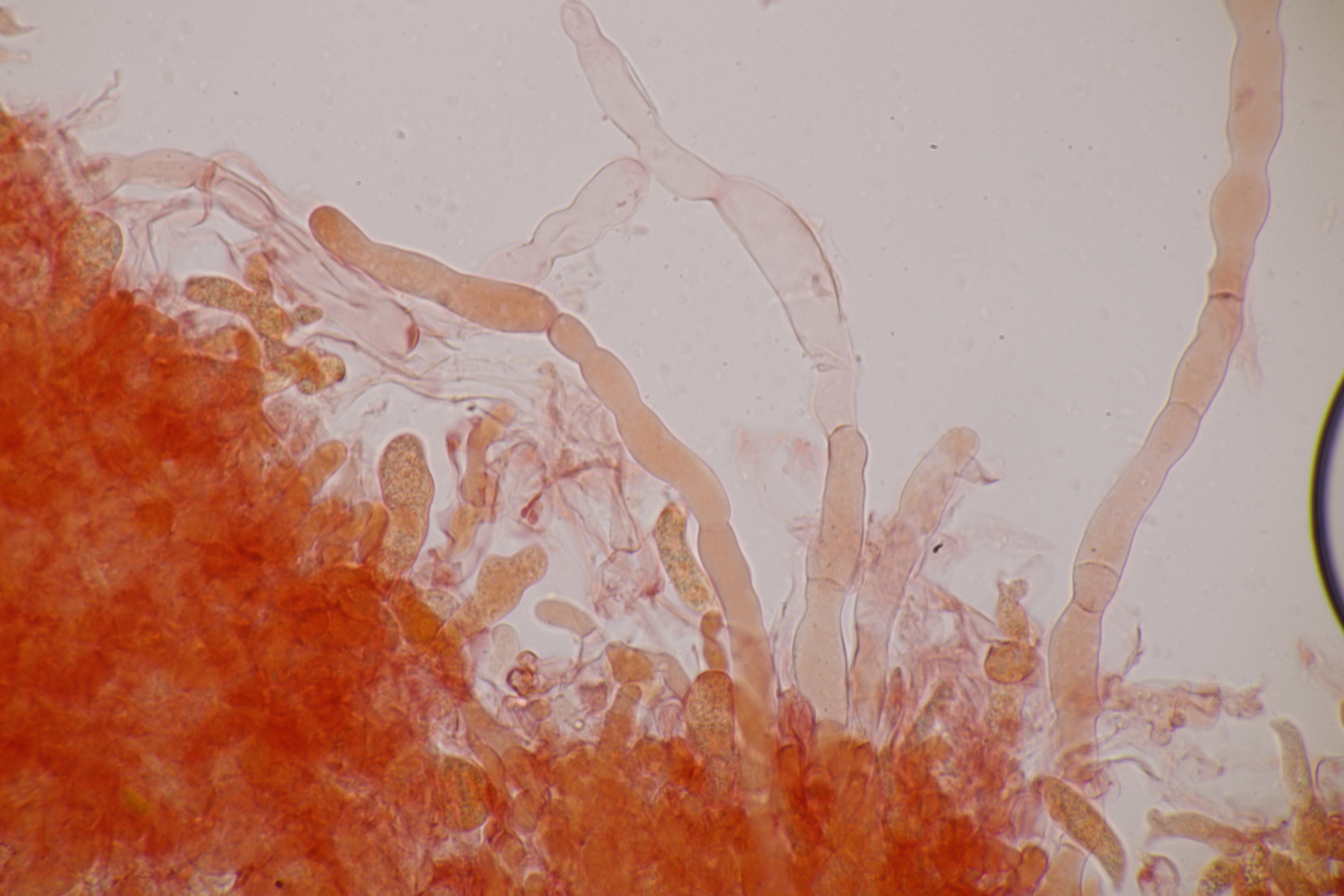 genau, die runden Kugeln sind die Basidien, die vierfach septiert sind, was man auf einigen Bildern auch erkennen kann. Aus der Basidie wachsen dann die vier Sterigmen, die hier wie bei vielen Phragmobasidiomyceten sehr lang sind im Verhältnis zur Basidie. Oben an den Basidien dann wie von anderen Pilzen gewohnt dann die sich bildenden Sporen.