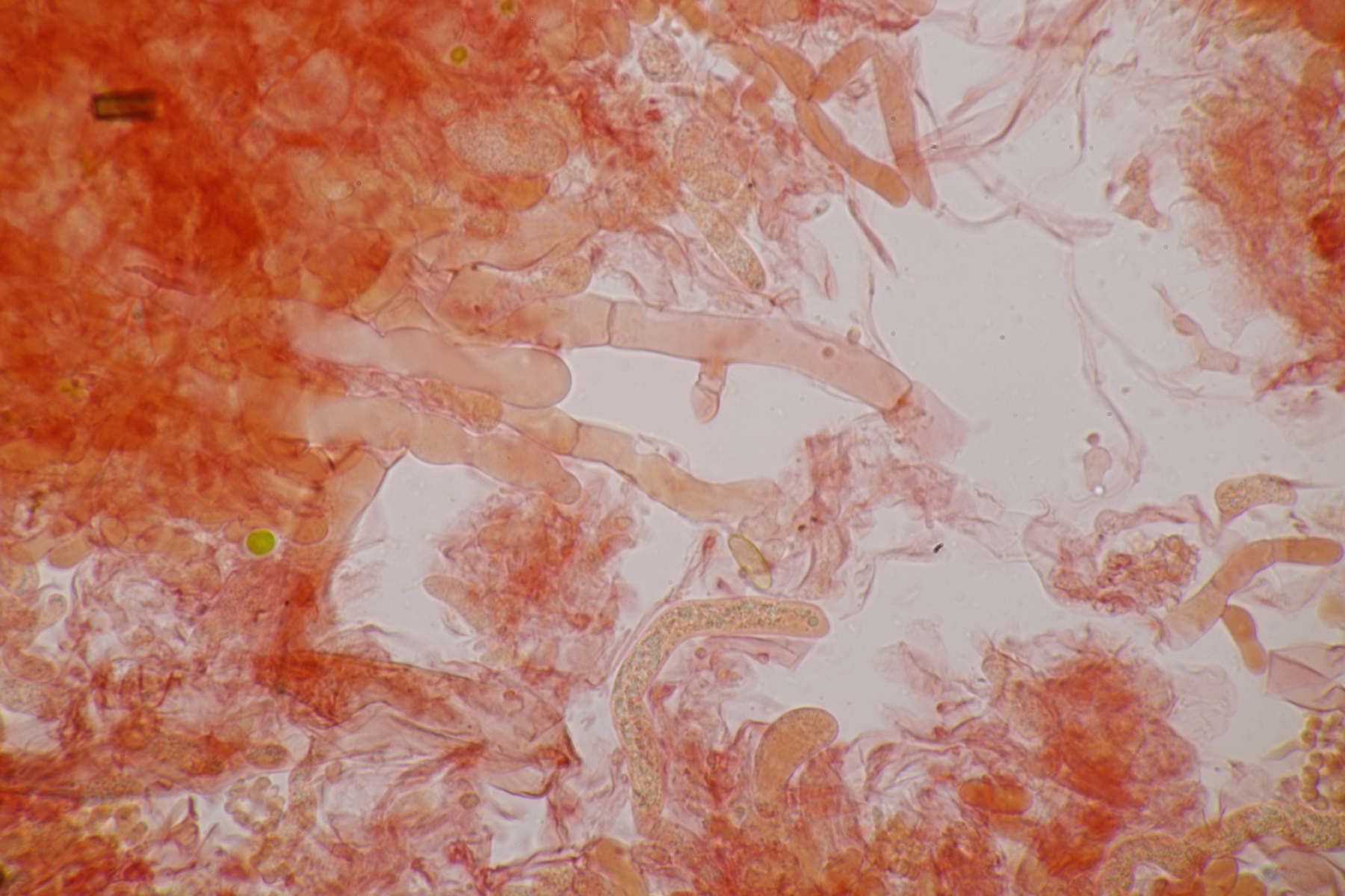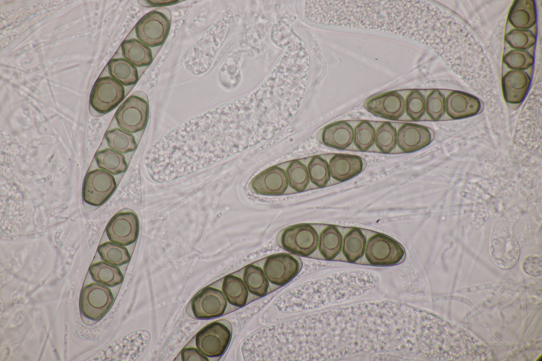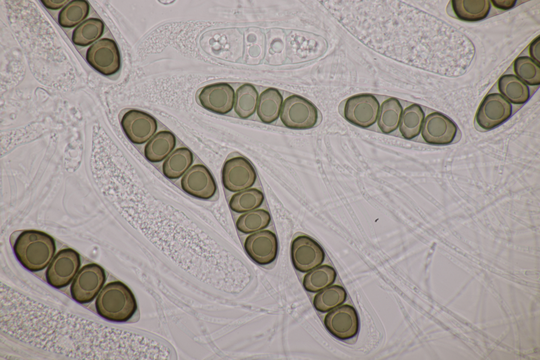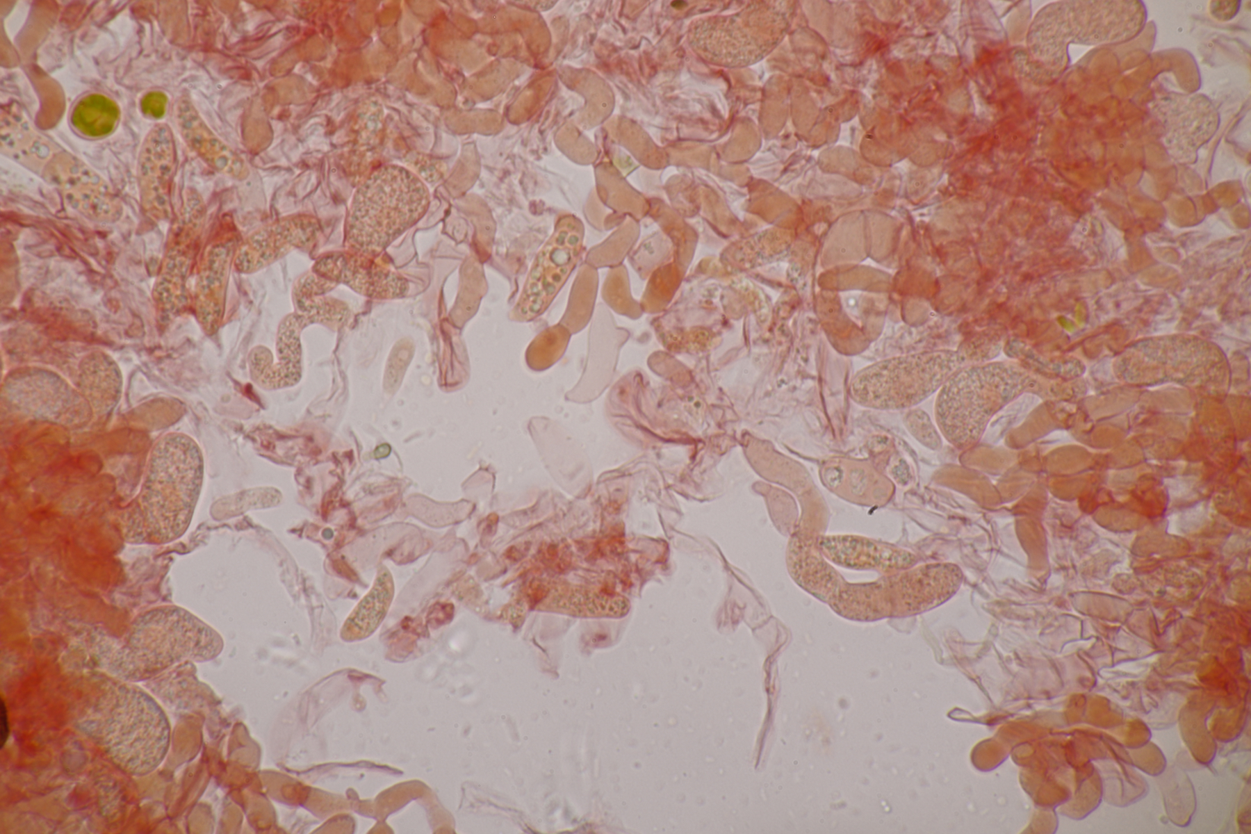 1. Hier werden die meisten wohl sofort Myxarium nucleatum schreien. Aber es gibt mit Myxarium hyalinum eine Verwechslungsart, die sich nur mikroskopisch unterscheiden läßt. Laut niederländischem Phragmoprojekt gibt es so z.B. noch keine molekular bestätigen Funde von M. nucleatum aus den Niederlanden. Hier maßen die Sporen 13.4+-0.6 µm x 4.7+-0.4 µm, Q=2.8+-0.2, bzw. 12.4-14.3 µm x 4.2-5.7 µm, Q=2.5-3.1 und man landet bei M. hyalinum.