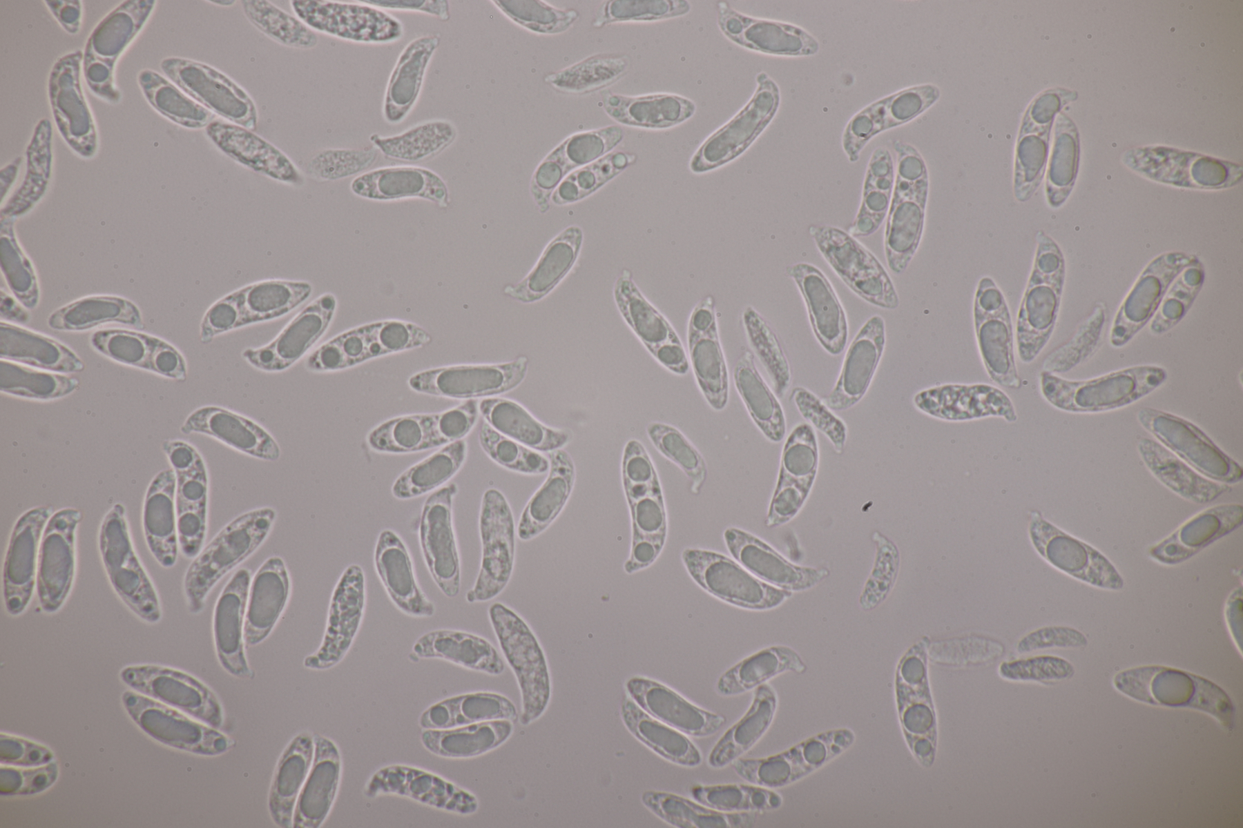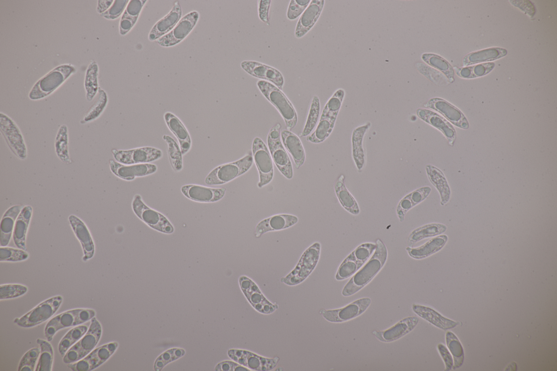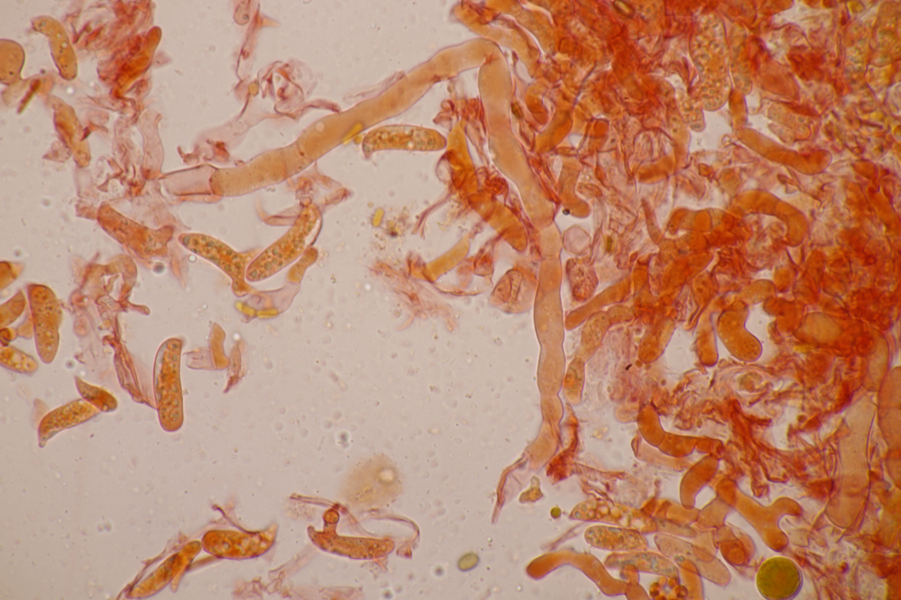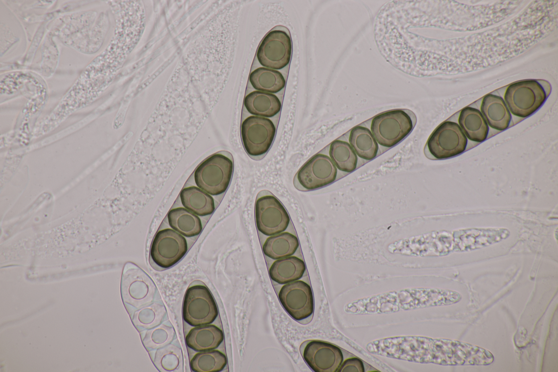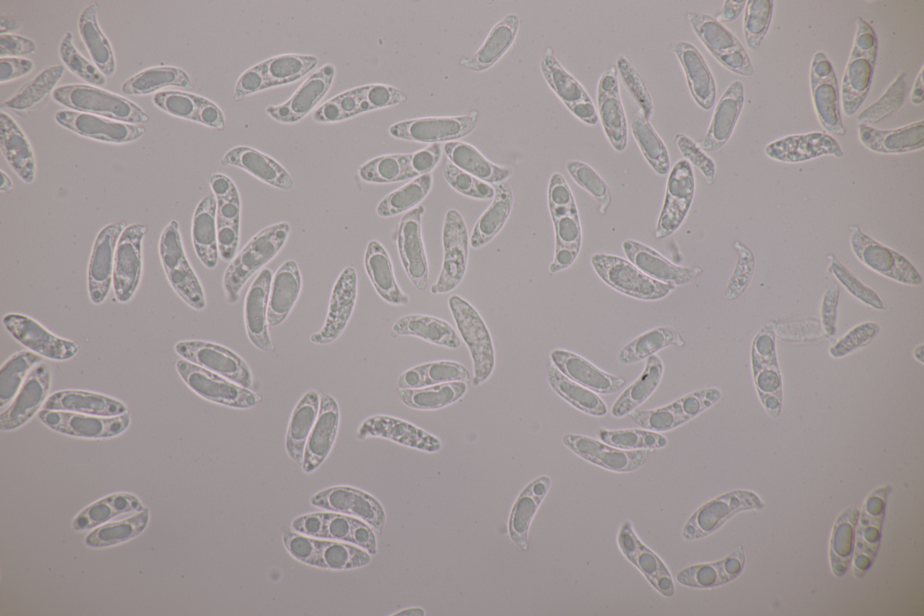 1. Hier werden die meisten wohl sofort Myxarium nucleatum schreien. Aber es gibt mit Myxarium hyalinum eine Verwechslungsart, die sich nur mikroskopisch unterscheiden läßt. Laut niederländischem Phragmoprojekt gibt es so z.B. noch keine molekular bestätigen Funde von M. nucleatum aus den Niederlanden. Hier maßen die Sporen 13.4+-0.6 µm x 4.7+-0.4 µm, Q=2.8+-0.2, bzw. 12.4-14.3 µm x 4.2-5.7 µm, Q=2.5-3.1 und man landet bei M. hyalinum.
