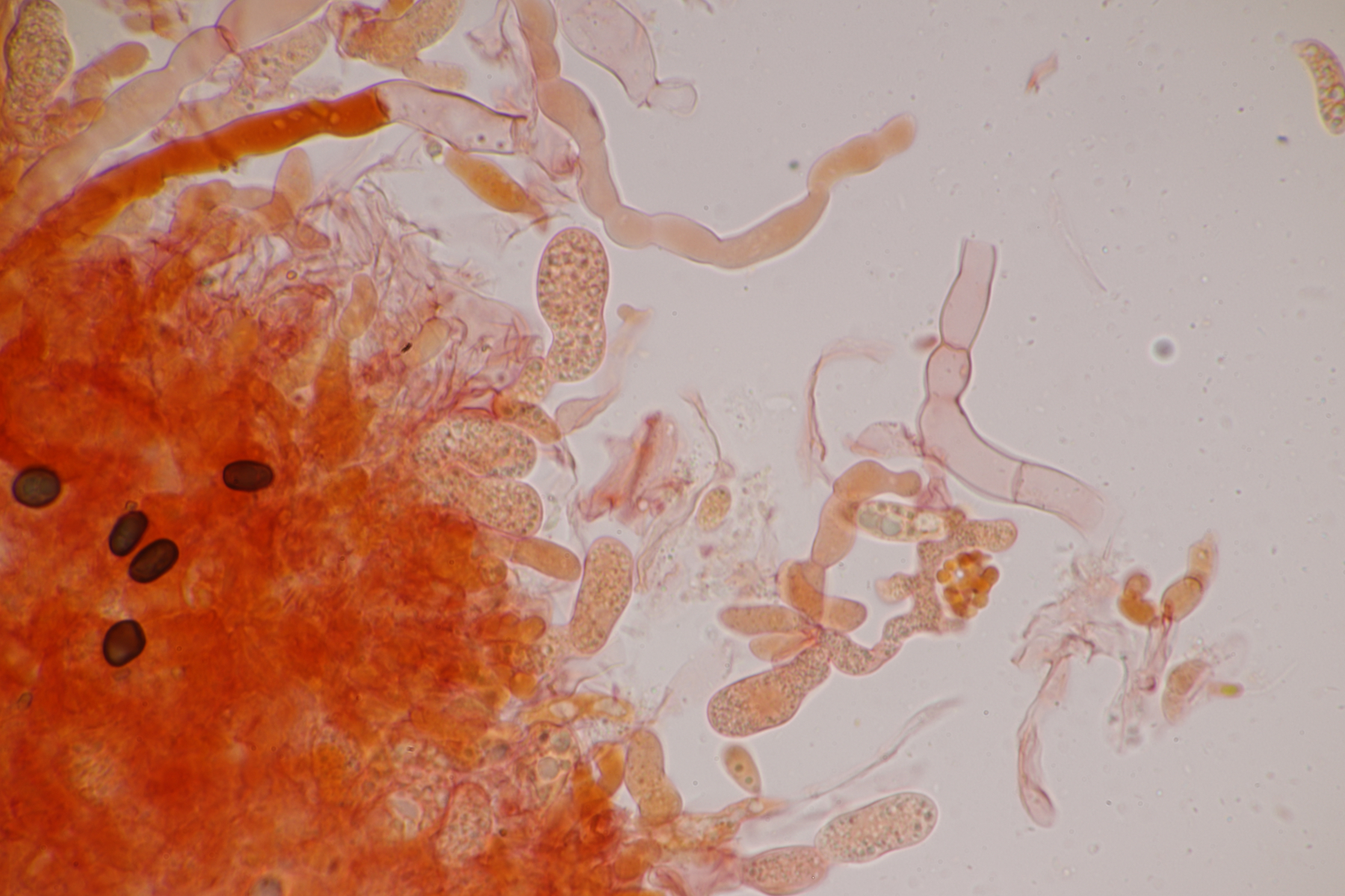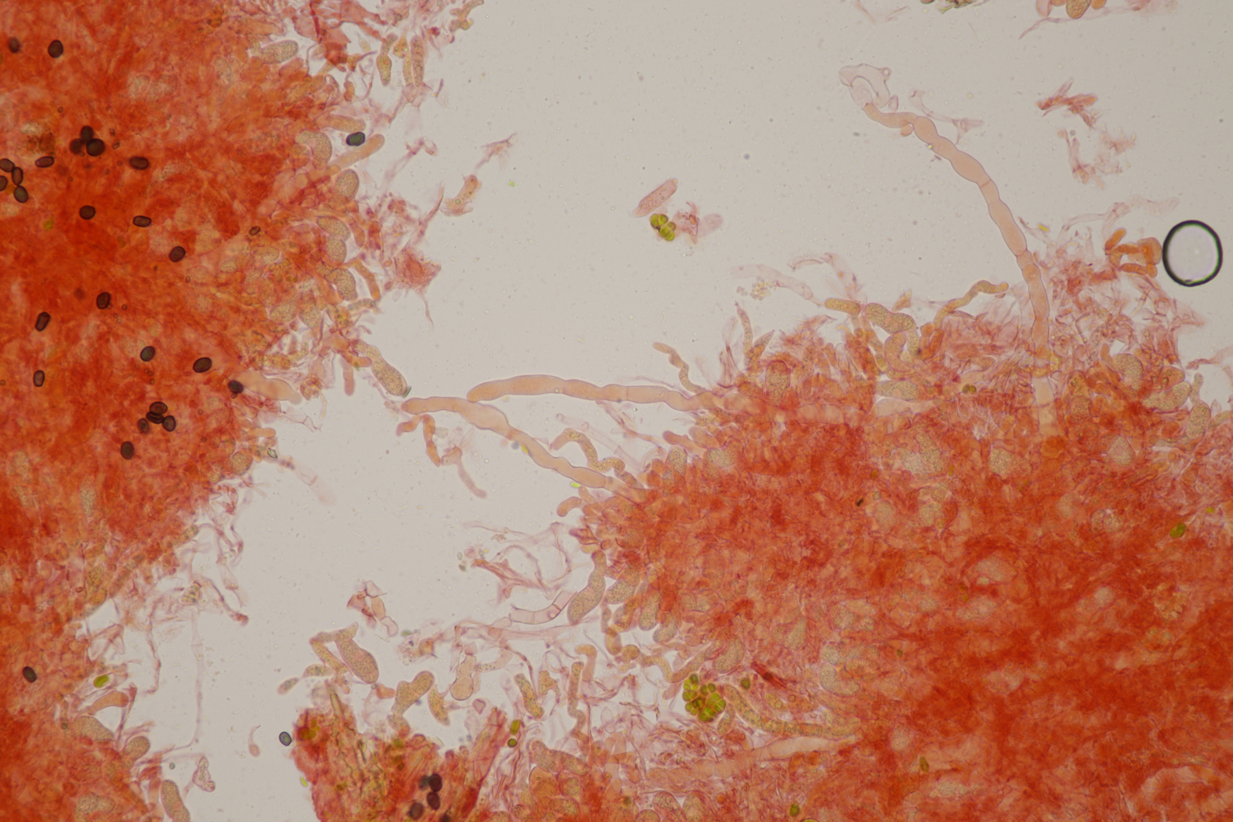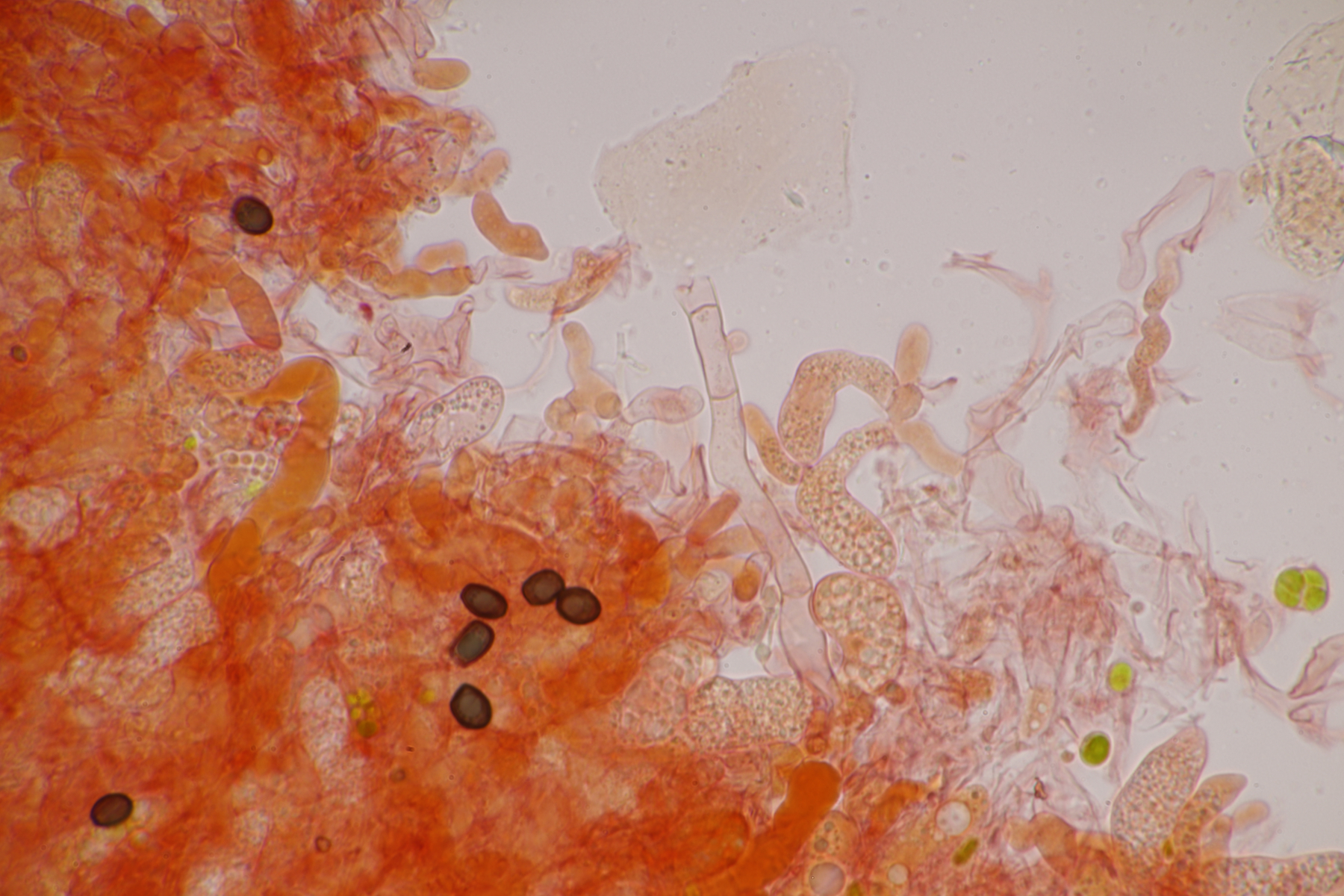 aller guten Dinge sind ja bekanntliche drei, deshalb also hier die dritte Tomentella. Ebenfalls unter Fagus und Corylus gefunden. Schnallen sind vorhanden, Zystiden fehlen, Sporen messen 7.1+-0.4 x 6.5+-0.5, Q=1.1+-0.1, 6.4-8.0 µm x 5.6-7.4 µm, Q=1.0-1.3 und sind eher gelappt als ellipsoid. Damit lande ich erstmal bei Schlüsselschritt 14. Sind die Sporen damit durchschnittlich 6-7,5 µm groß? Falls ja, würde ich im nächsten Schritt die Subikularhyphen als dickwandig bezeichnen und lande bei T. neobourdotii. Alternativ ging es dann zu 30, 31, 33 (Hyphen sind bei mir um 5 µm breit). Die Optionen, die sich dort dann auftauchen, erscheinen mir aber alle nicht so richtig überzeugend. Was meint Tomentella dazu?