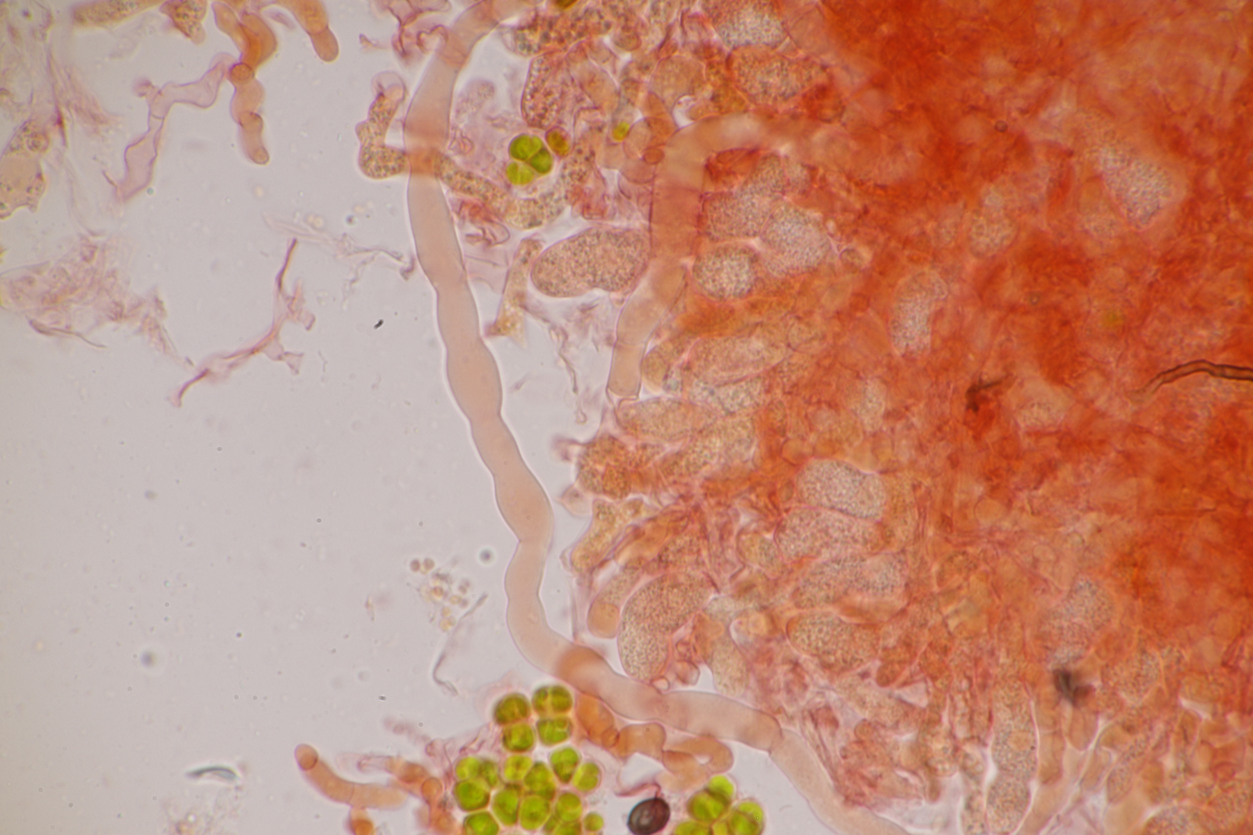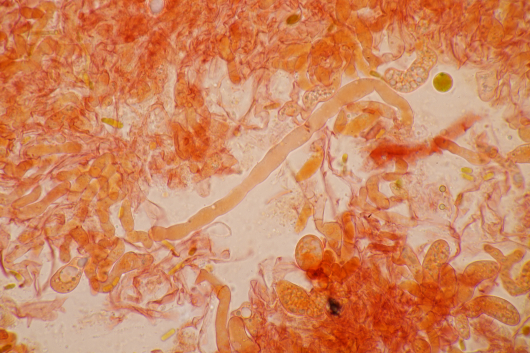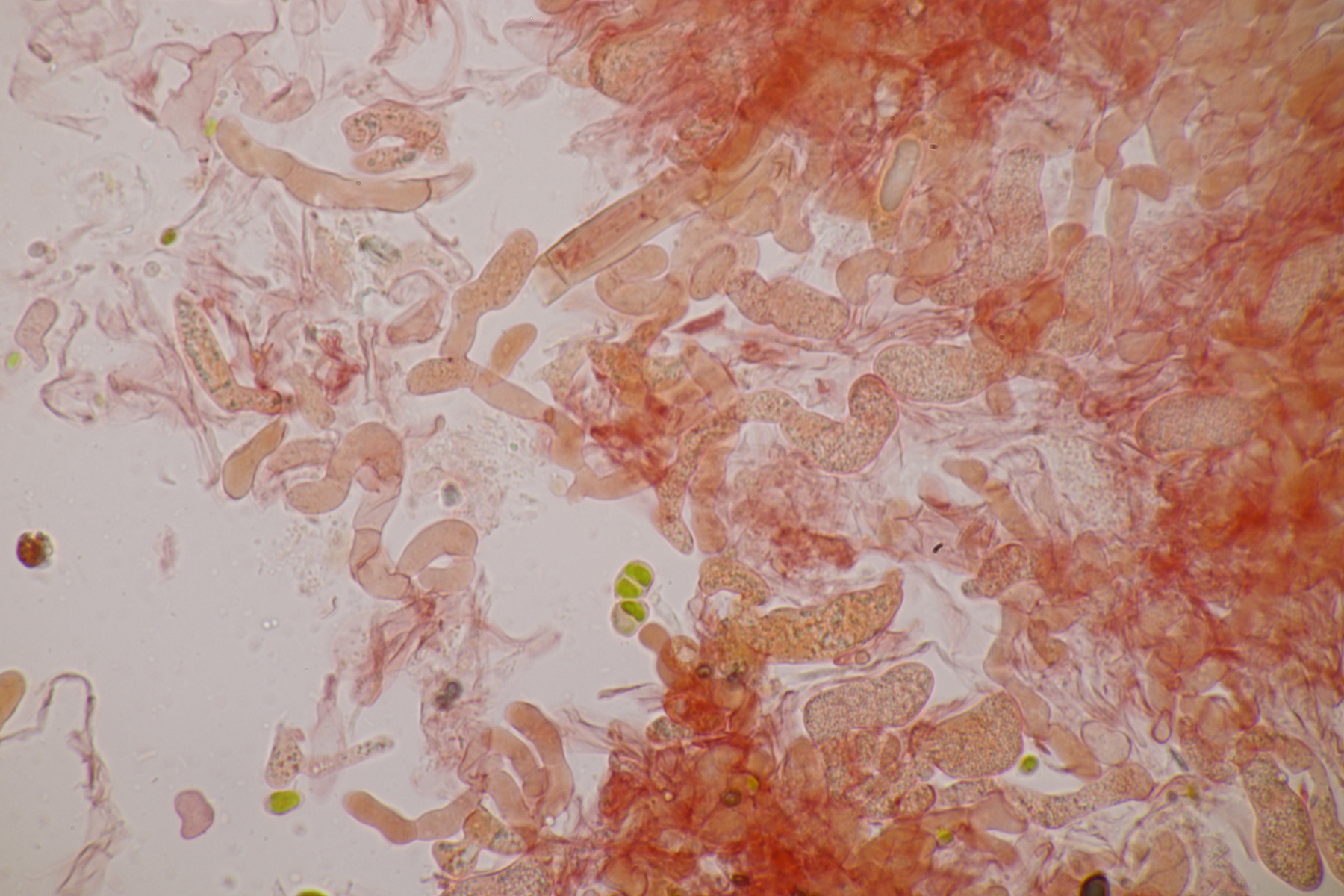 aller guten Dinge sind ja bekanntliche drei, deshalb also hier die dritte Tomentella. Ebenfalls unter Fagus und Corylus gefunden. Schnallen sind vorhanden, Zystiden fehlen, Sporen messen 7.1+-0.4 x 6.5+-0.5, Q=1.1+-0.1, 6.4-8.0 µm x 5.6-7.4 µm, Q=1.0-1.3 und sind eher gelappt als ellipsoid. Damit lande ich erstmal bei Schlüsselschritt 14. Sind die Sporen damit durchschnittlich 6-7,5 µm groß? Falls ja, würde ich im nächsten Schritt die Subikularhyphen als dickwandig bezeichnen und lande bei T. neobourdotii. Alternativ ging es dann zu 30, 31, 33 (Hyphen sind bei mir um 5 µm breit). Die Optionen, die sich dort dann auftauchen, erscheinen mir aber alle nicht so richtig überzeugend. Was meint Tomentella dazu?