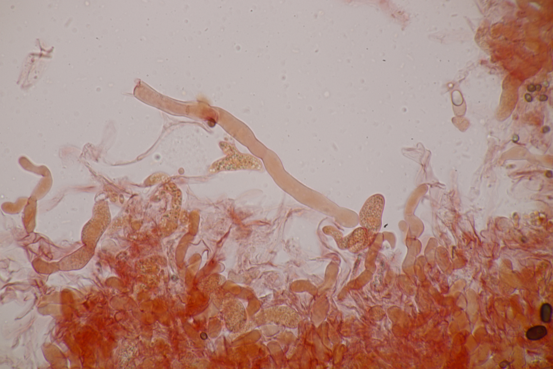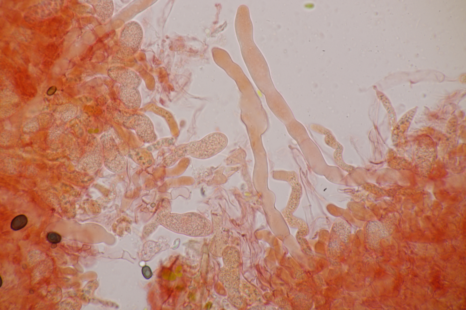 letzten Sonntag konnte ich im Duisburger Stadtwald auf einem abgestorbenem Buchenast eine Bourdotigloea finden. Mit dem Bourdotigloea-Schlüssel des niederländischen Phragmoprojekts kann ich B. lanea und B. cerea aufgrund der Fruchtkörperstruktur und moniliformen Zystiden ausschließen. Im nächsten Schritt geht es dann darum, die Form der Zystiden genauer zu beurteilen: Deutlich moniliform oder unregelmäßig bzw. schwach moniliform. Der Vergleich mit den Mikrozeichungen bei Spirin et al. 2018 hilft mir da auch nicht wirklich weiter. Sporenmaße sind 19.6+-1.1 µm x 6.4+-0.4 µm, Q=3.1+-0.2, 18.0-21.2 µm x 5.7-7.3 µm, Q=2.7-3.6, aber damit bekommt man die Arten auch nicht gescheit getrennt. Hat jemand Erfahrung mit der Gattung?