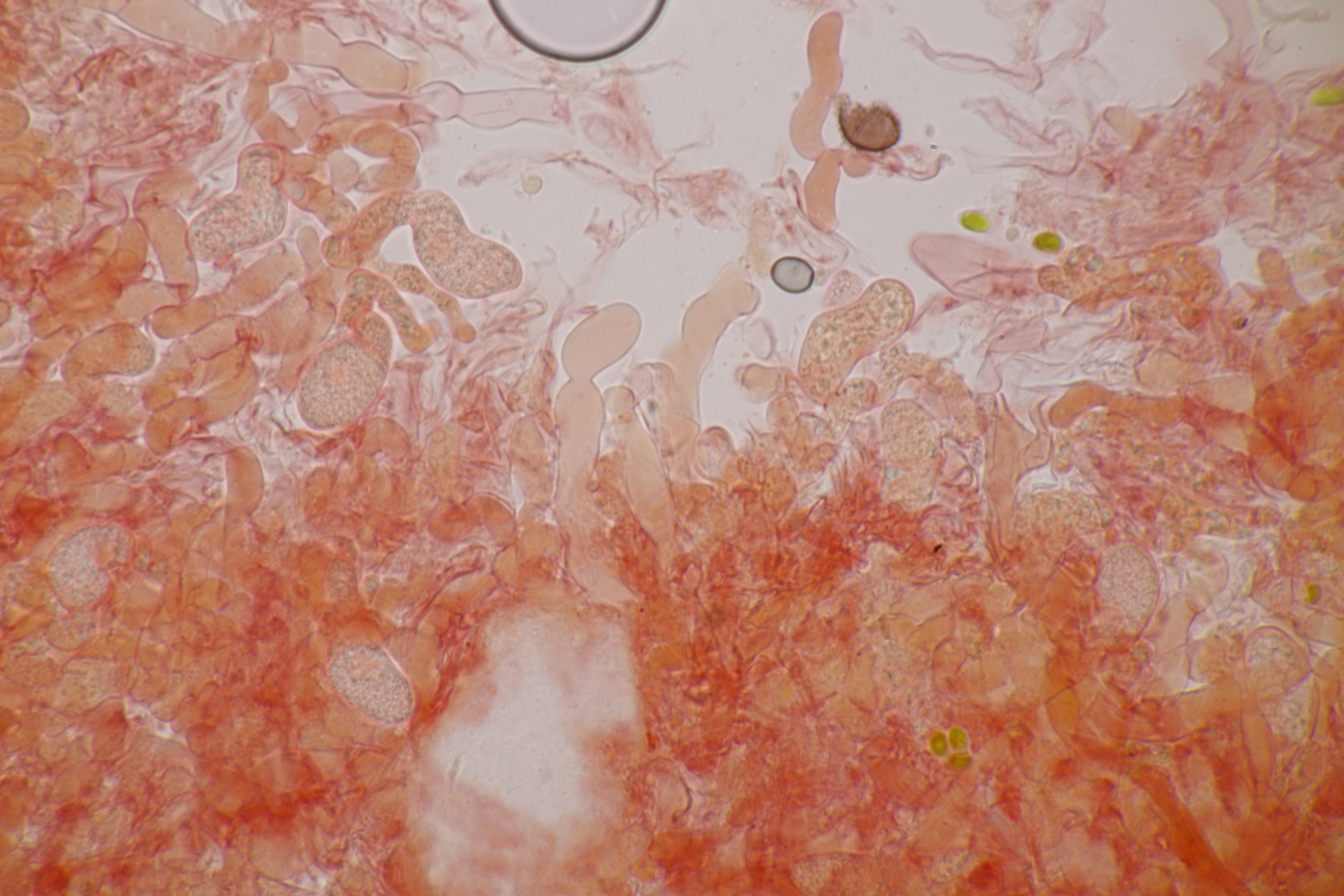 Damit ist man schon mal ganz locker bis Schlüsselschritt 20 gekommen. Entscheide ich mich dort für elliptische Sporen, lande ich mit den braunen Subikularhyphen bei T. atramentaria, bei der das Hymenophor aber glatt sein sollte. Gehe ich bei den runden Sporen weiter, komme ich mit braunen, nicht inkrustierten Subikularhyphen und braunen Sporen zu Tomentella stuposa agg., die aber laut Franks Homepage auch glatt sein sollte.