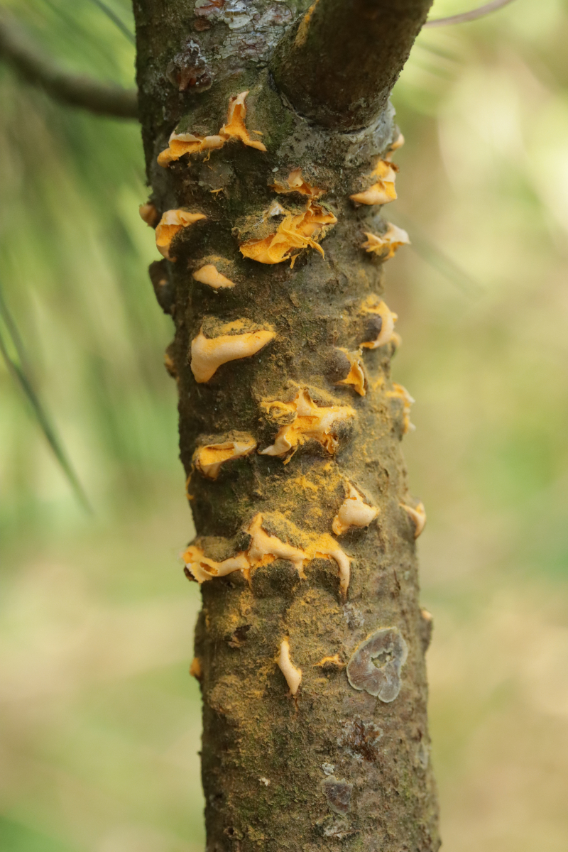 10. Dann das unerwartete Highlight der Tour. Auf einer kleinen Wacholderheide wurde ich direkt am ersten Strauch fündig: Gymnosporangium cornutum ex Juniperus communis. Den suche ich ja schon seit drei Jahren in der Westruper Heide vergeblich auf Juniperus, obwohl ich ihn da jeden Sommer auf Sorbus aucuparia nachweisen kann. Auffällig ist, daß der Pilz an sehr dünnen Ästchen saß, dort keine Verdickungen produzierte und relativ flache, orange-braune Lager produzierte.