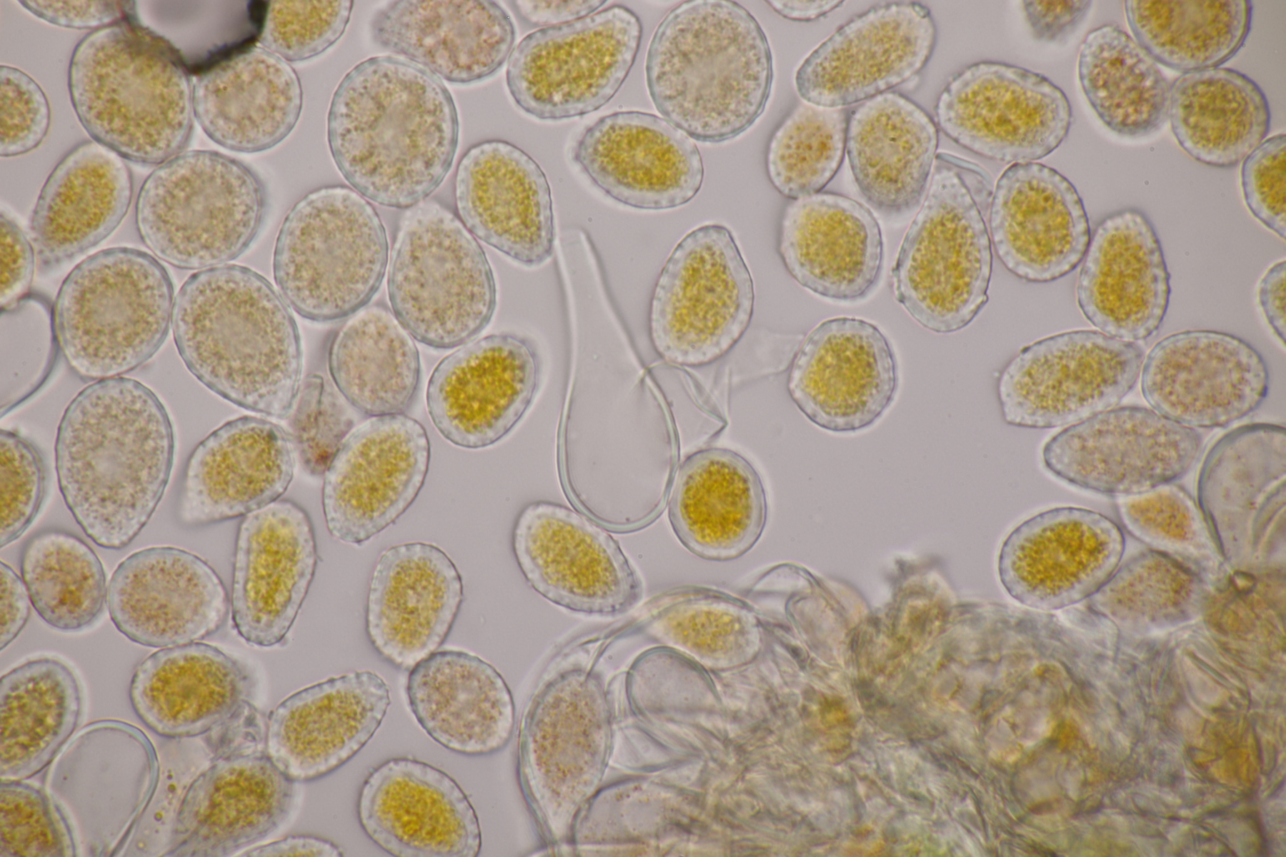 bei meinem Fund messen die Sporen 17.2-19.4 x 5.2-6.2 µm, Q=2.9-3.4. Das liegt zwar irgendwie zwischen den beiden Arten, wenn man die Angaben aus der Arbeit zu Grunde legt, aber ich denke, daß aufgrund der Sporenform, des Sporeninhalts und des Q-Werts mein Fund tatsächlich P. apiculatum sein sollte.