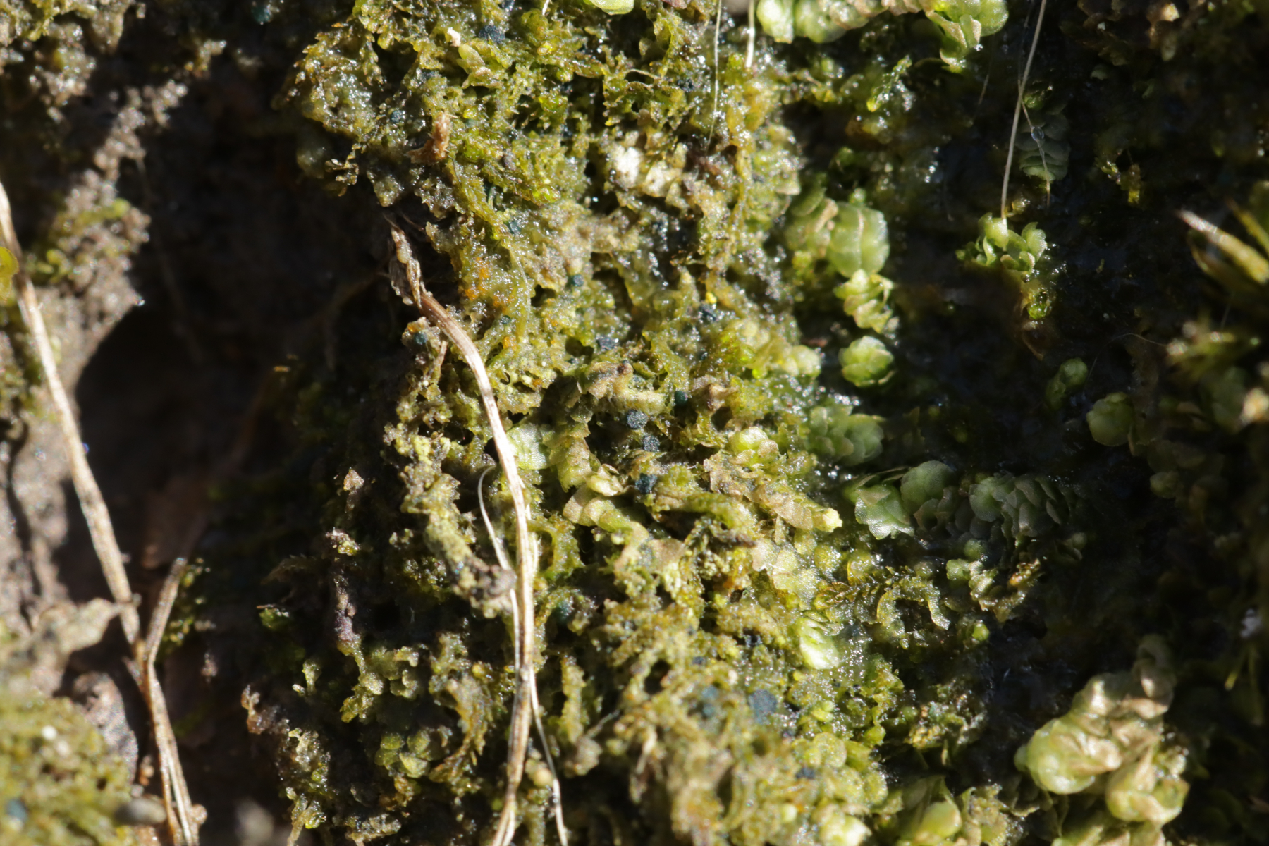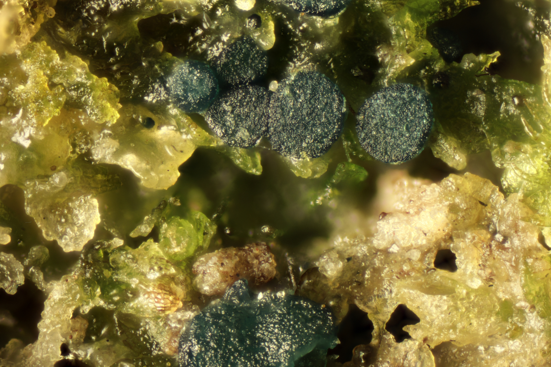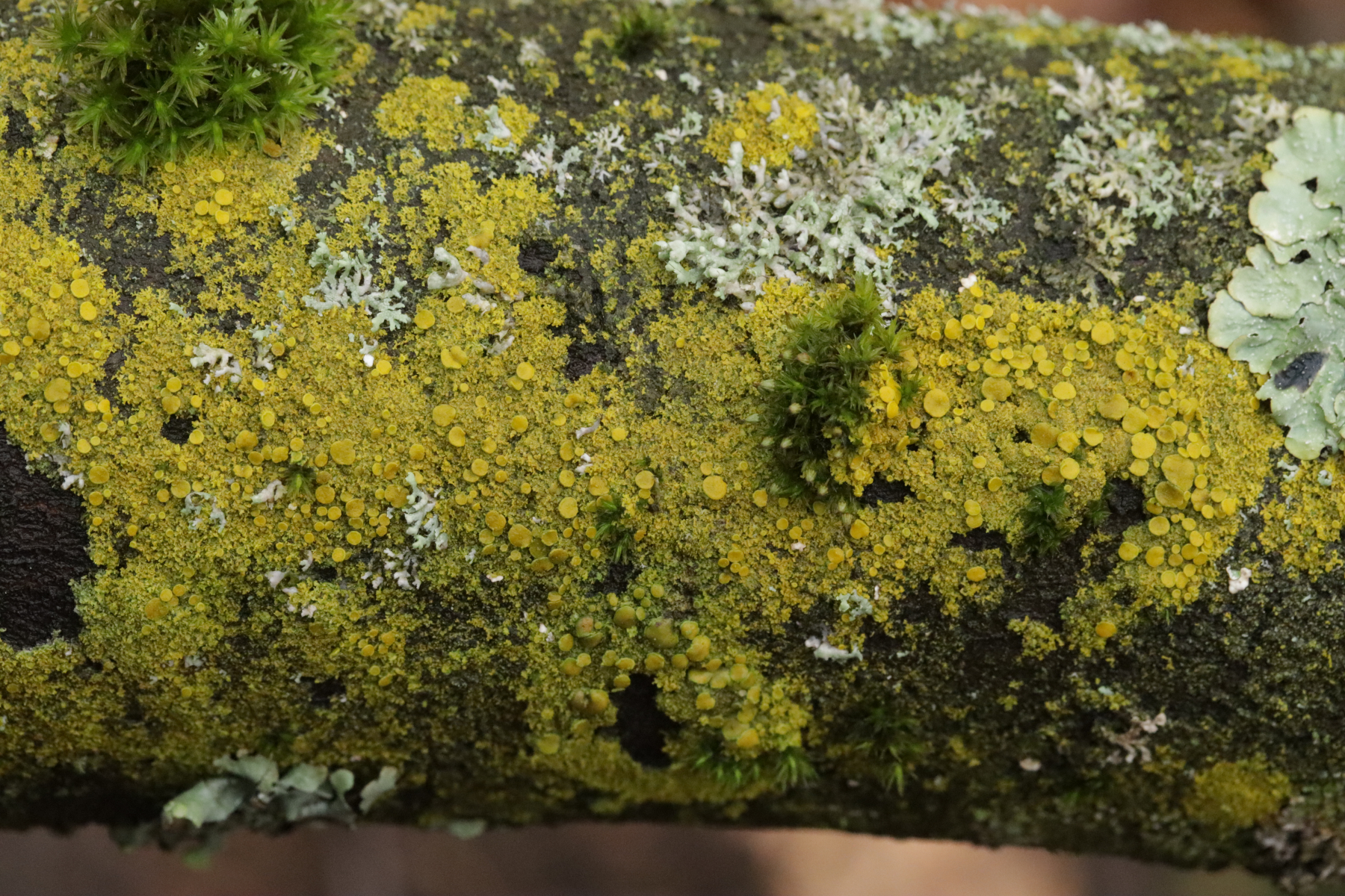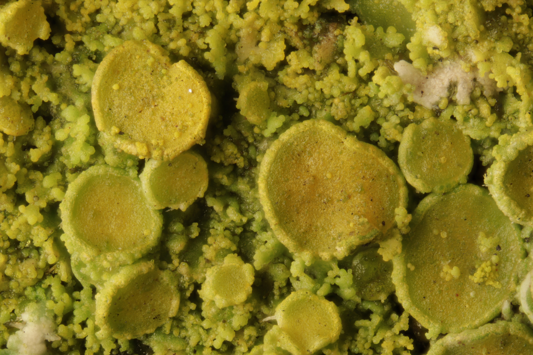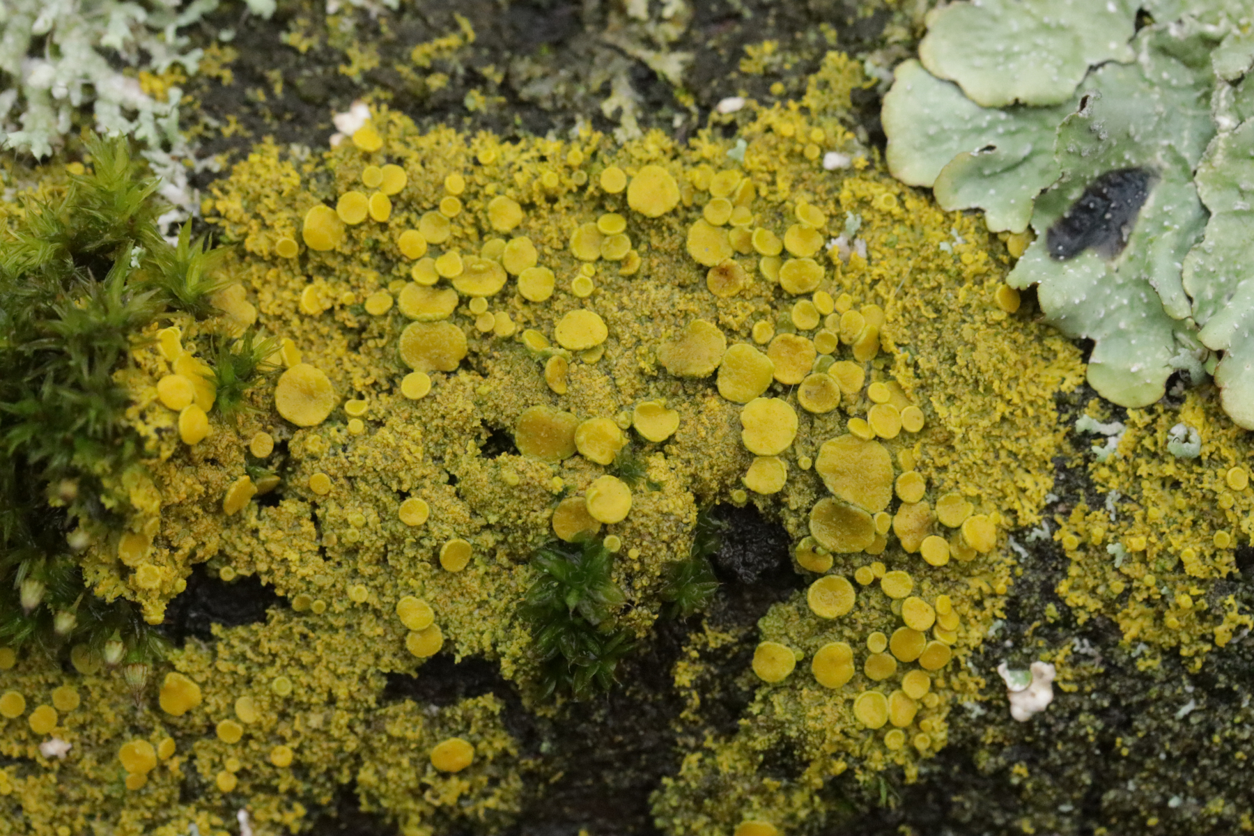 4. Candelaria concolor, hier ausnahmsweise mit Apothecien, was die Unterscheidung von der achtsporigen Schwesterart Candelaria pacifica einfach macht.