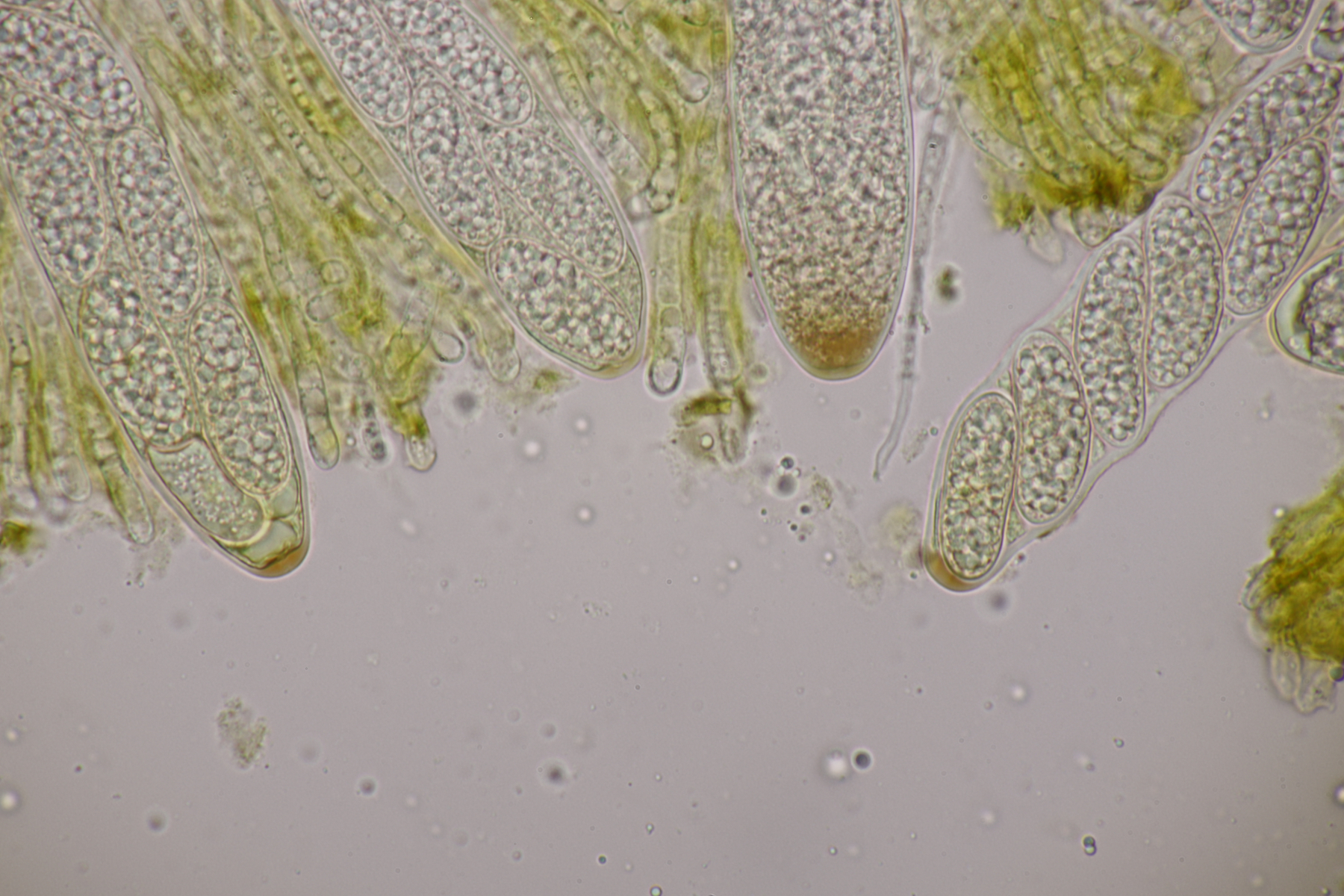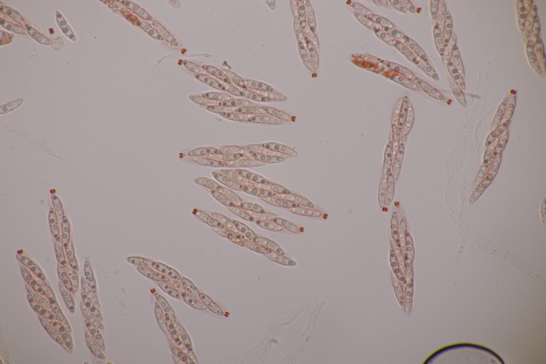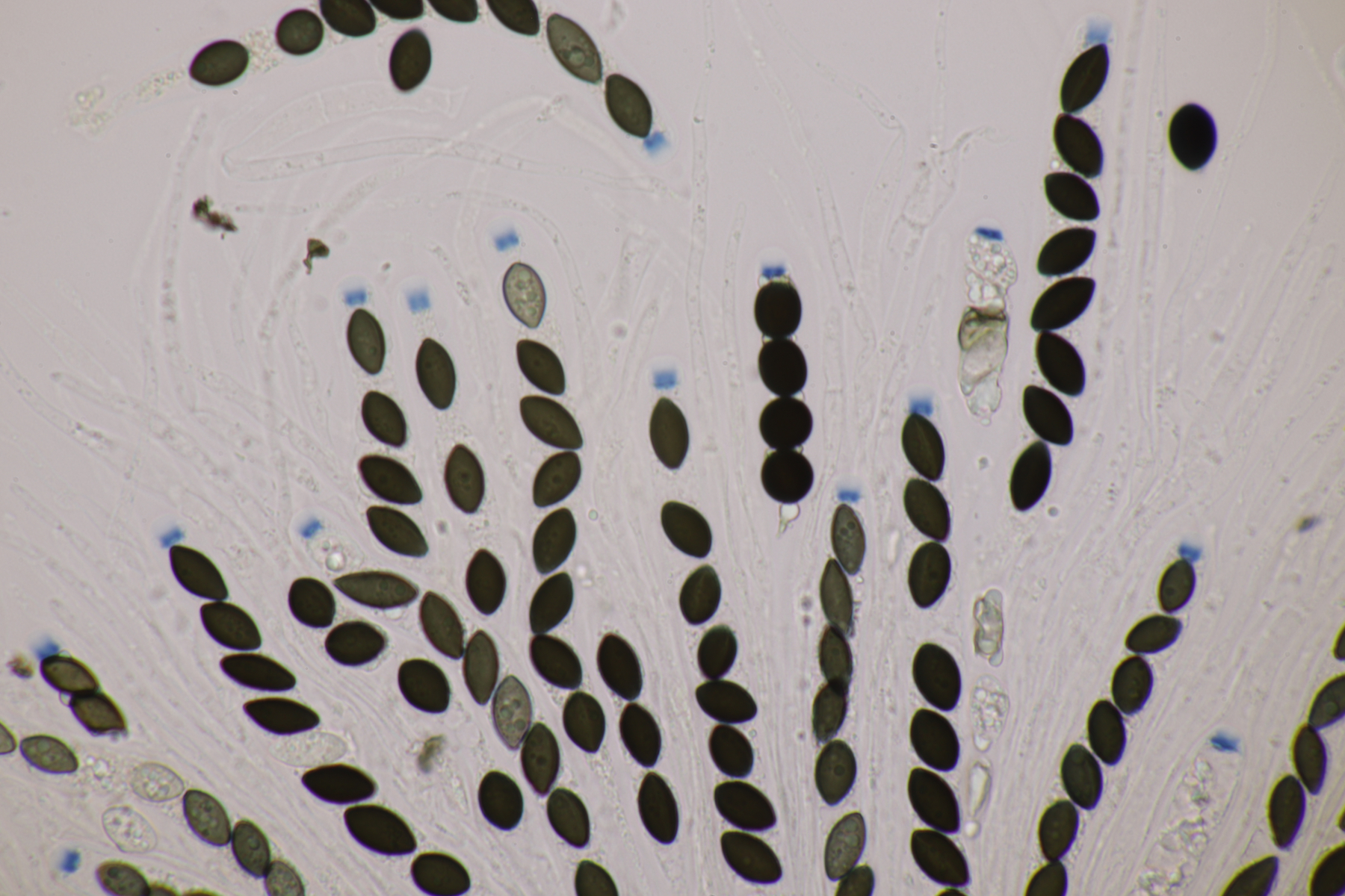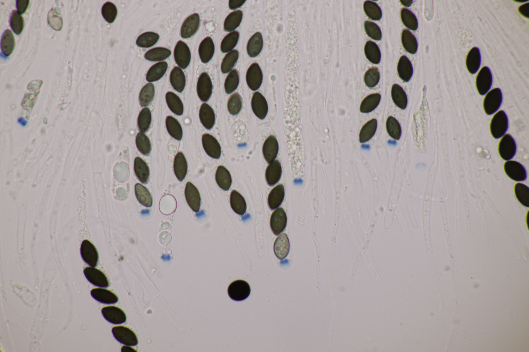 ich bin da noch nicht wirklich überzeugt. DIe Zeichnung von Moravec interpretiere ich so, daß es auf der Sporen einzelne, cyanophile Streifen gibt. Das deckt sich auch mit den Fotos, die man von Cheilymenia theleboloides hier sehen kann.