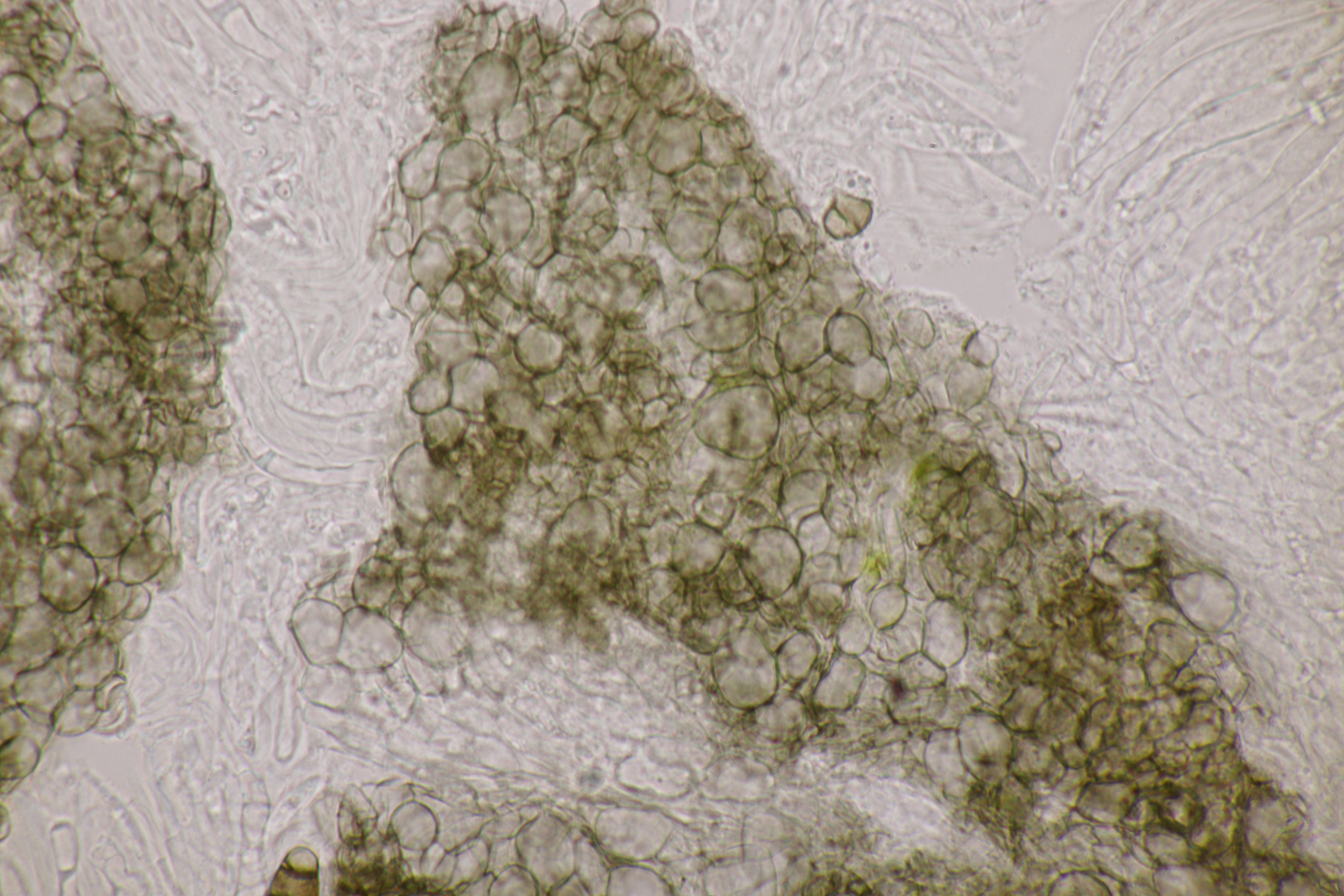 14. Und dann gab es noch einen Rindenpilz. Weiß, mit glattem Hymenophor und auf Laubholz wachsend. Die Sporen sind sehr klein, messen 3-3,5 µm x 2-2,5 µm und sind mit entfernt stehenden Stacheln versehen. Zystiden sind keine zu beobachten, Schnallen sind vorhanden, zum Teil sind die Hyphen an den Septen ampulliform verdickt und das Hyphensystem ist monomitisch. Damit lande ich dann bei Trechispora stellulata. Gehen die Experten die Beorn da mit?