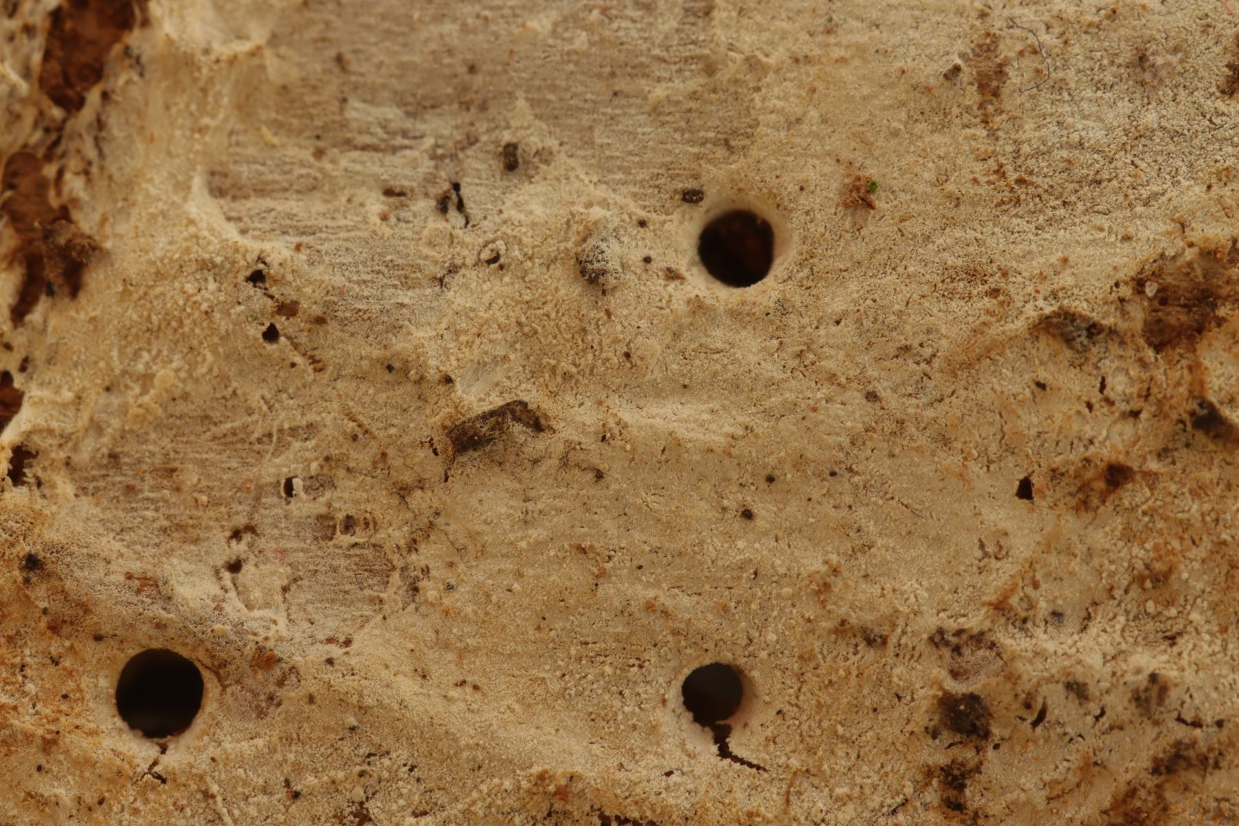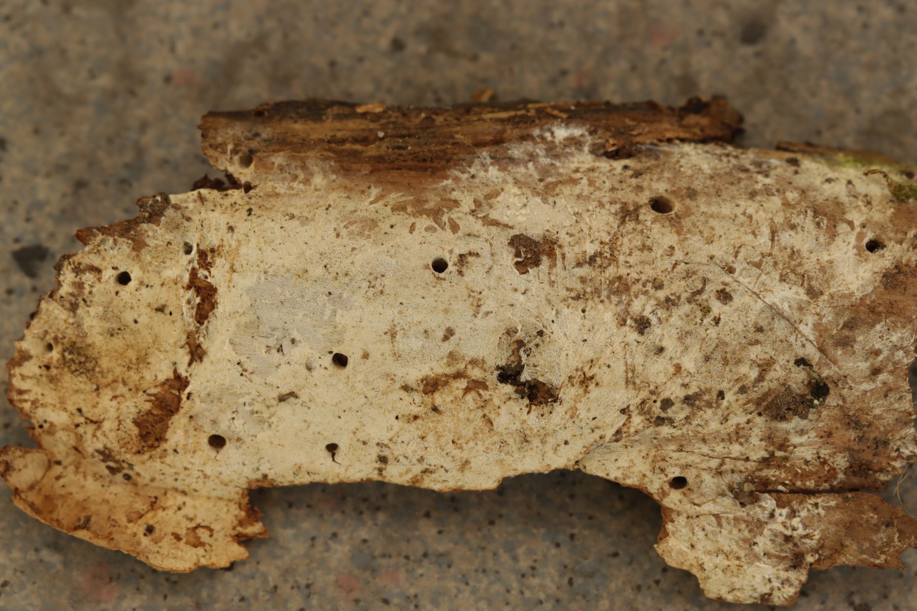 jetzt bin ich endlich dazu gekommen, die Trechispora auch mal makroskopisch abzulichten. Wie man sieht, ist sie praktisch glatt (das Holzstück ist in Längsrichtung ungefähr 5 cm groß).