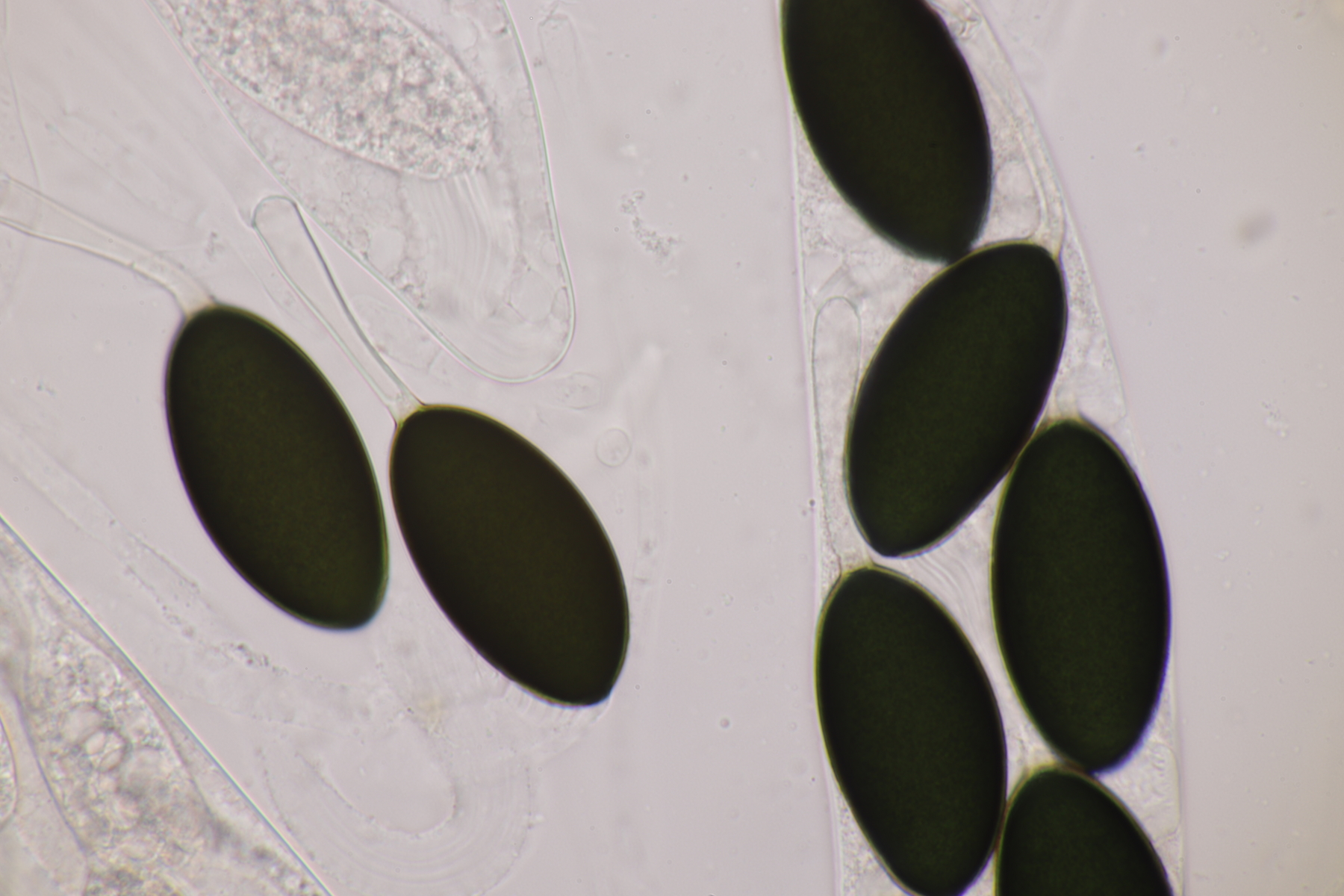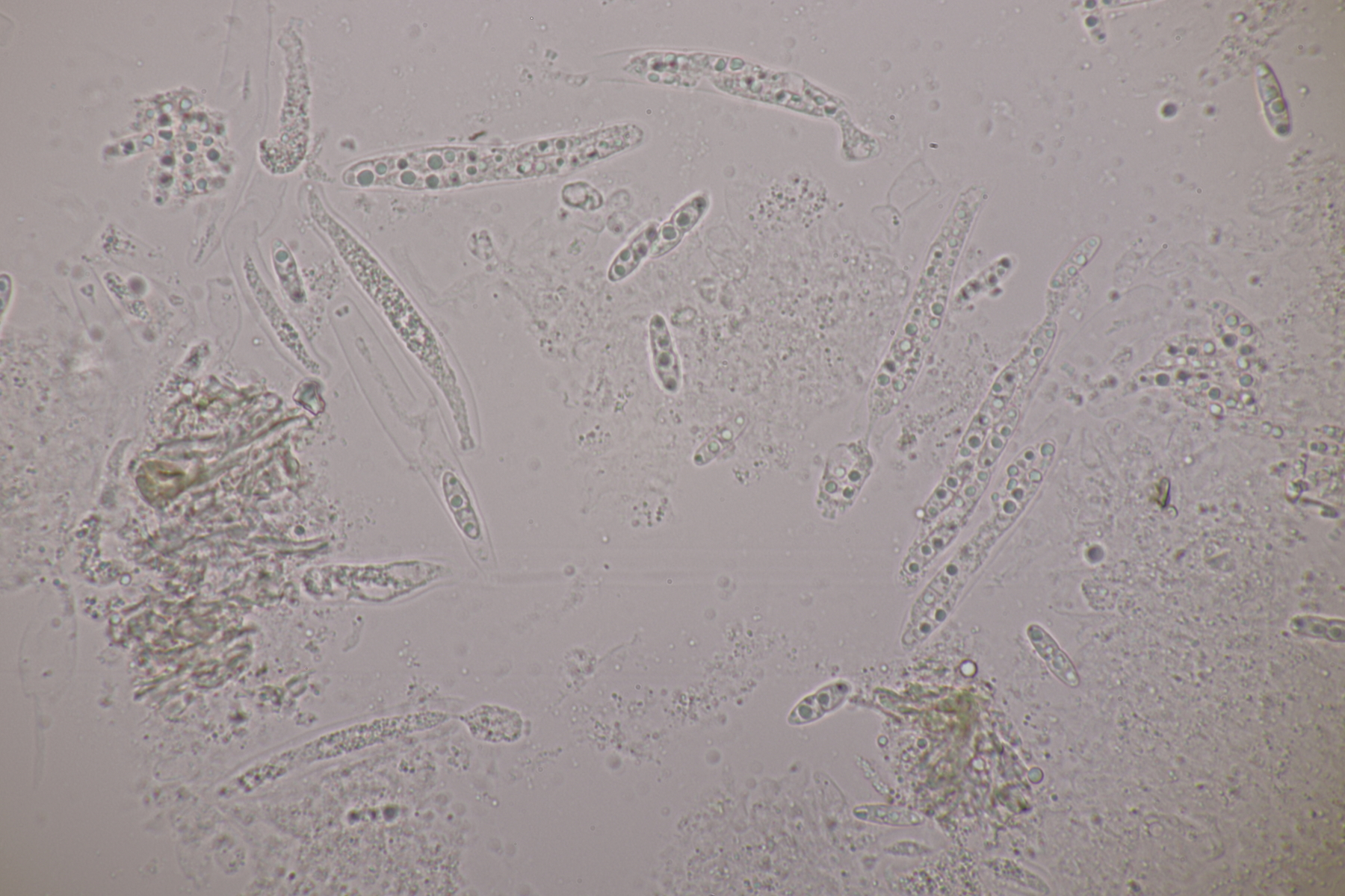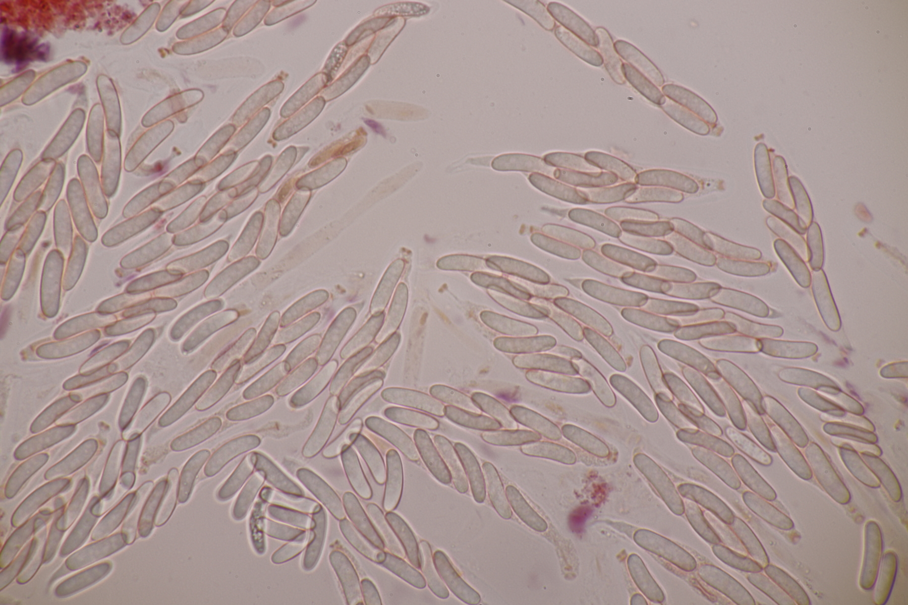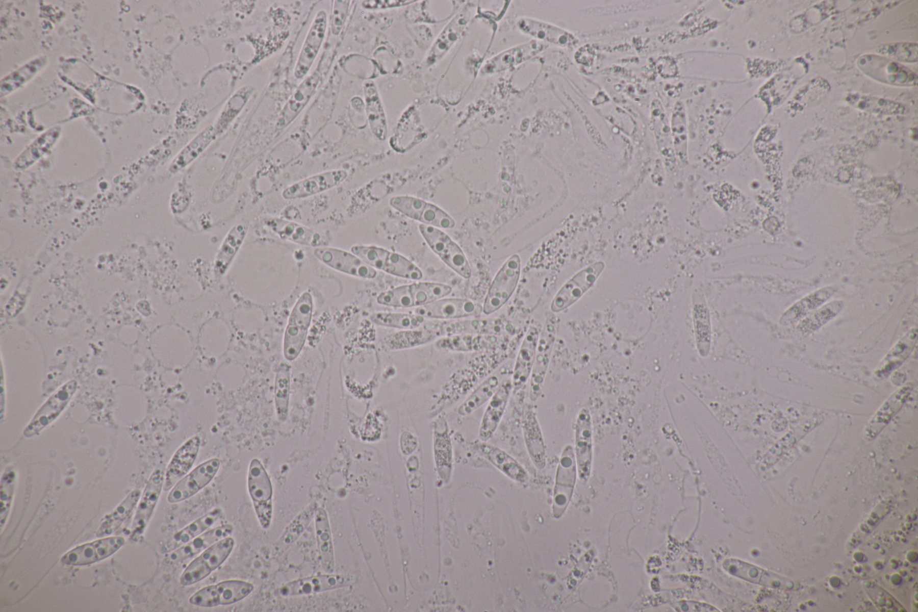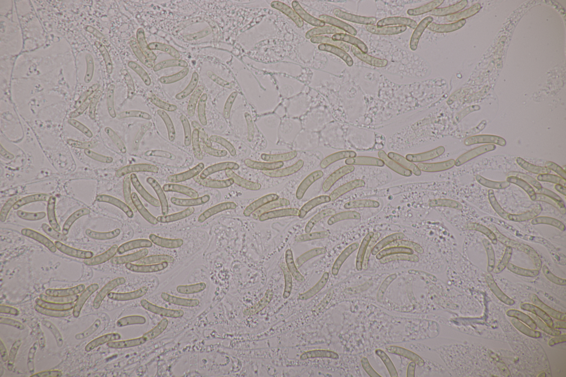 Andererseits sieht das auf dem ersten Foto schon nach Basidiosporen aus, man erkennt ja z.B. einen Apikulus. Bei Gallerttränen gibt es die Besonderheit, daß die Sporen nur dann ihre wahre Septierung zeigen, wenn sie beim Abwurf auch in Kontakt zum Hymenium stehen. Wenn man einfach einen normalen Abwurf macht, hat man fast nur unseptierte Sporen.