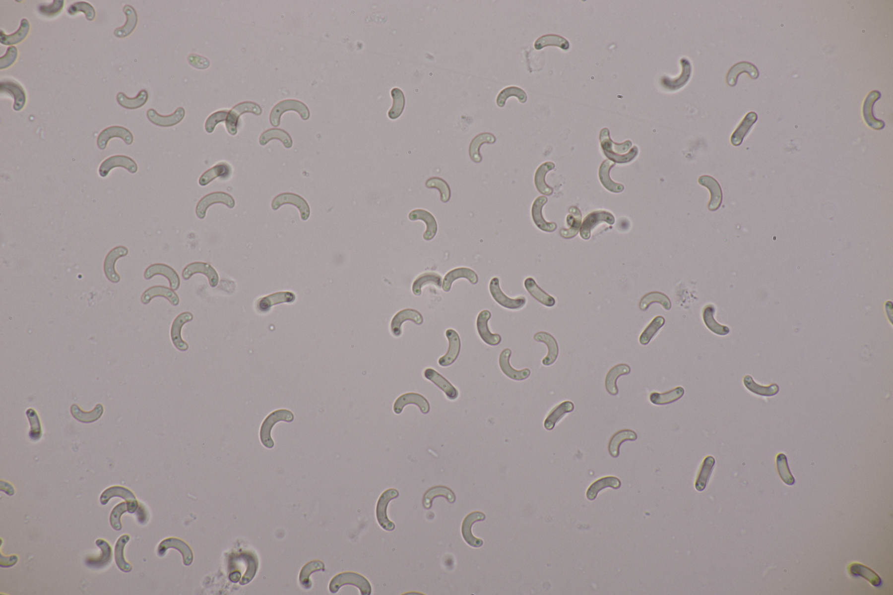 I.2 Leider nur ein Einzelexemplar: eine Podospora mit vielen Sporen im Ascus. Die Sporen messen 21-24 x 14-15 µm. Wie viele es genau waren, ließ sich leider nicht genau ermitteln, es liegt aber um die 100. Damit sind dann nur noch Podospora bifida und setosa im Rennen. Da das Pedicel um die 5 µm breit ist, geht meine Tendenz hier zu Podospora bifida.