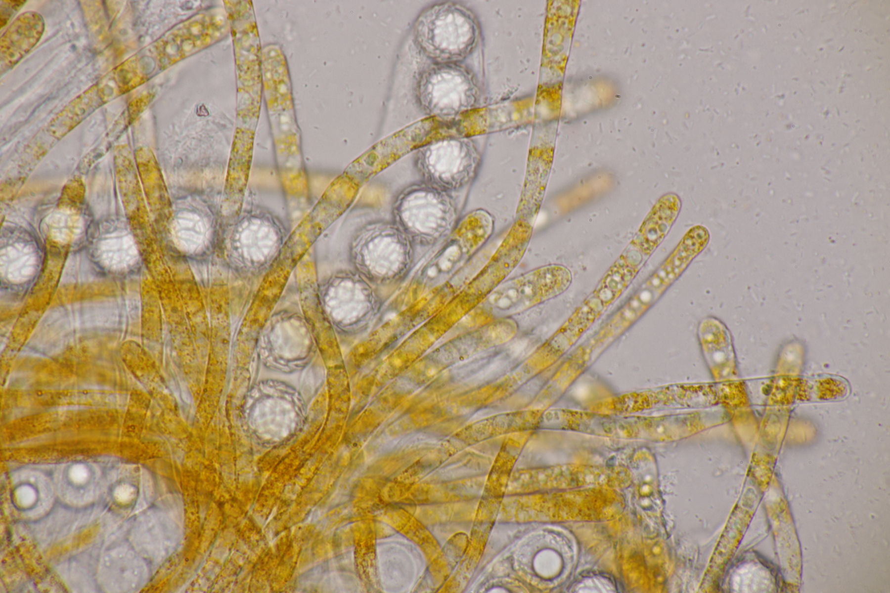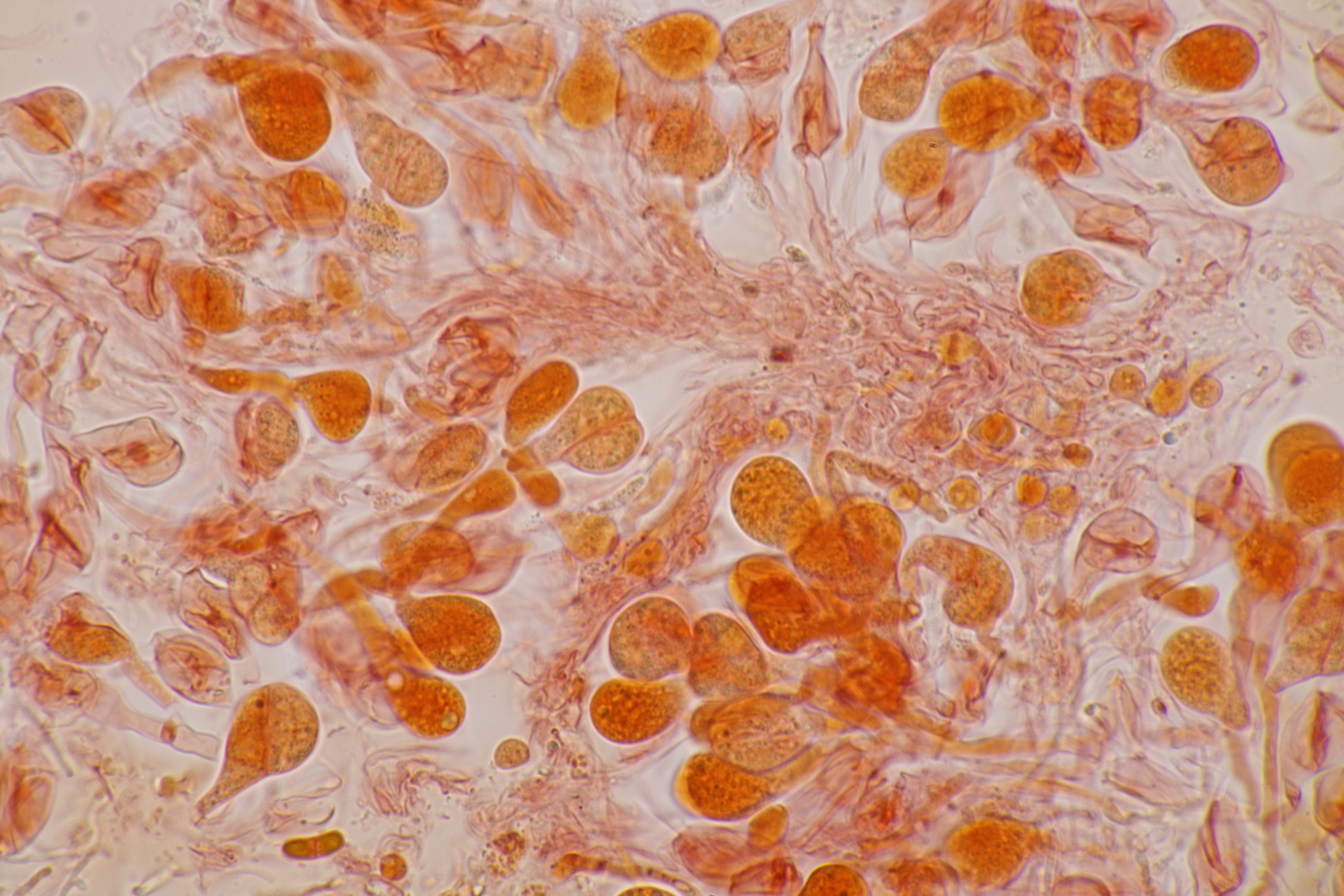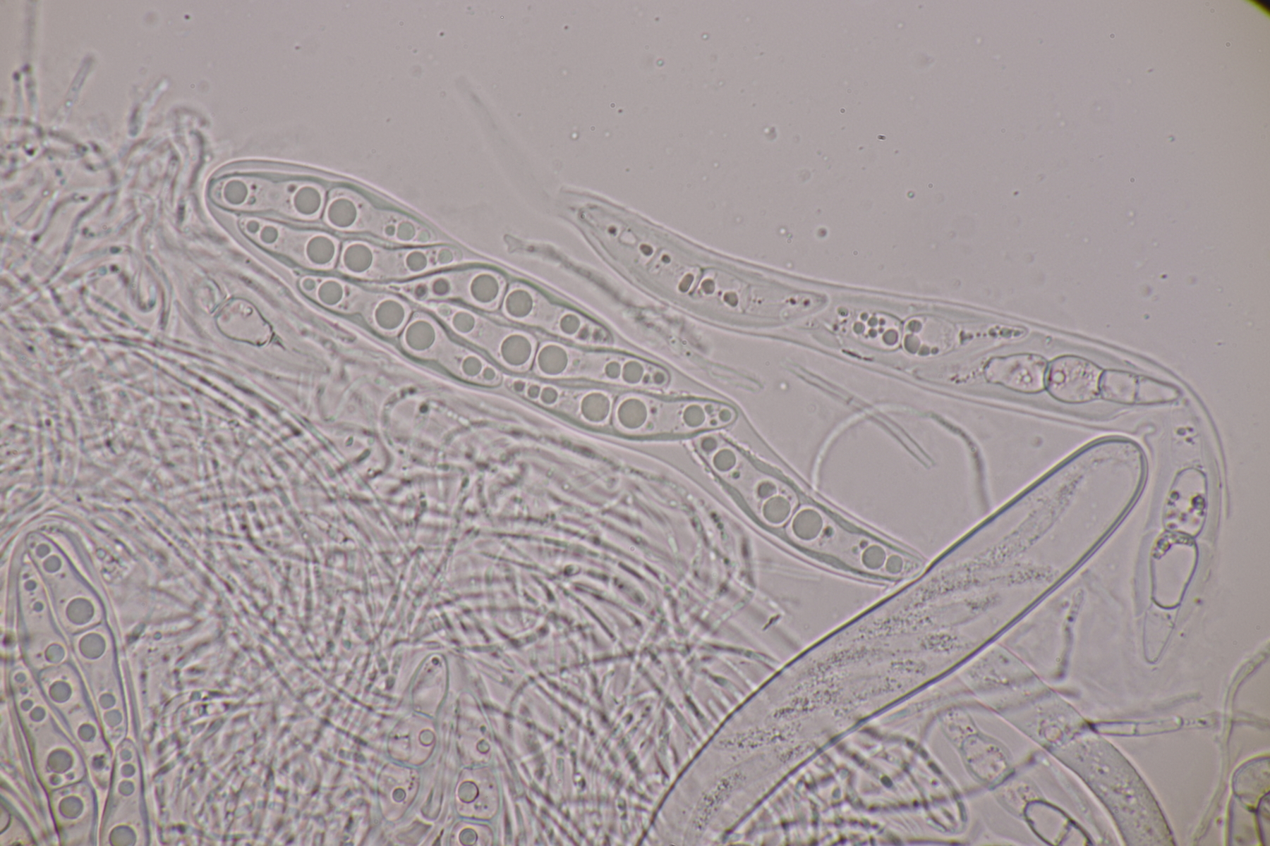 II.3 Nochmal ein Saccobolus, diesmal makroskopisch etwas kompakter. Sporencluster ca 35 x 12 µm, Sporen messen 12-13 µm x 6 µm. Das würde dann schon deutlicher zu S. depauperatus tendieren.