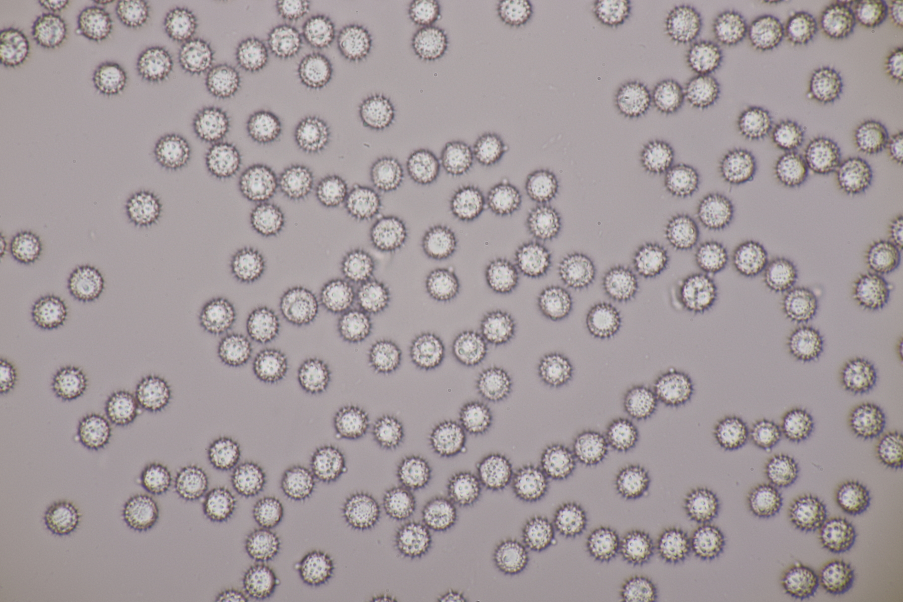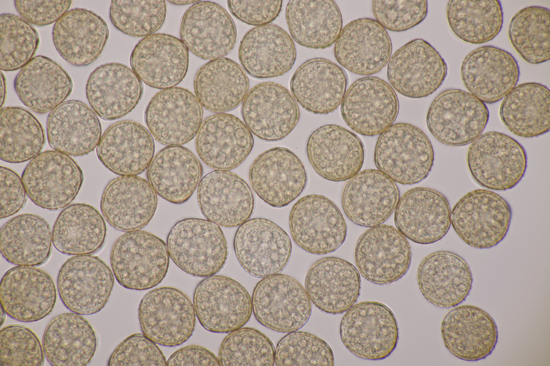 Und dann sind da überall auf meiner Probe noch sehr kleine (~30 µm) große, hyaline Kügelchen. Die sitzen an Fasern im Dung, aber auch an anderen Pilzen und sehen dann im Mikro so aus: