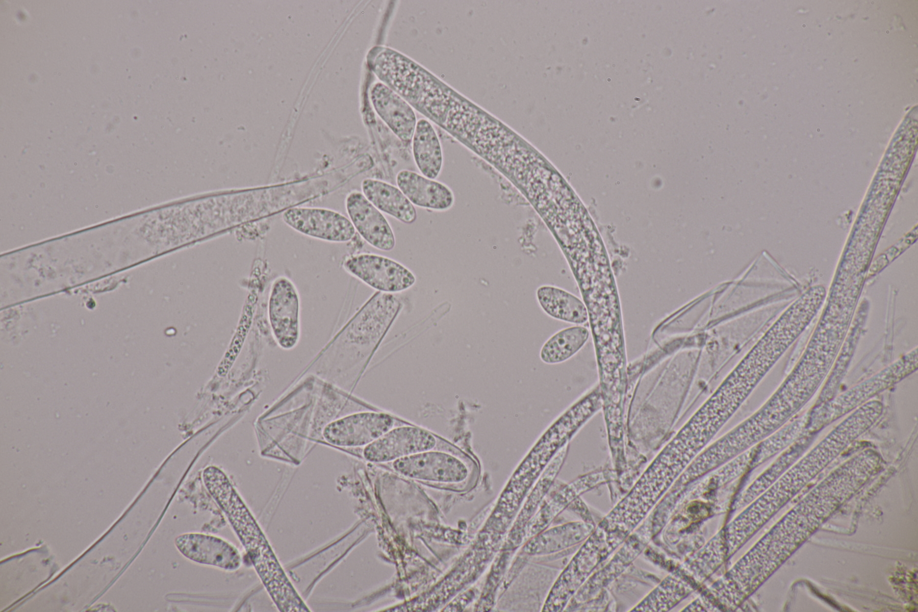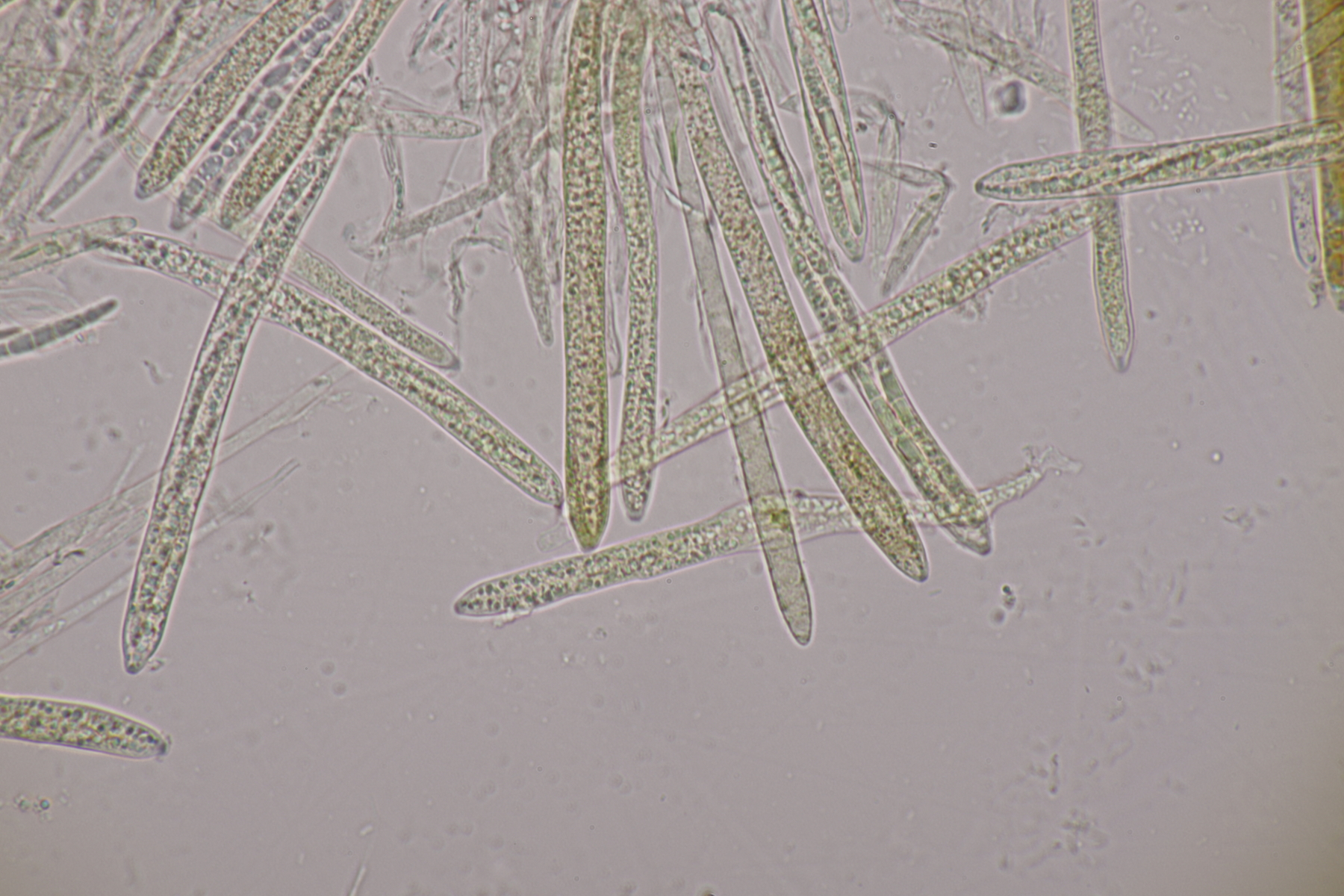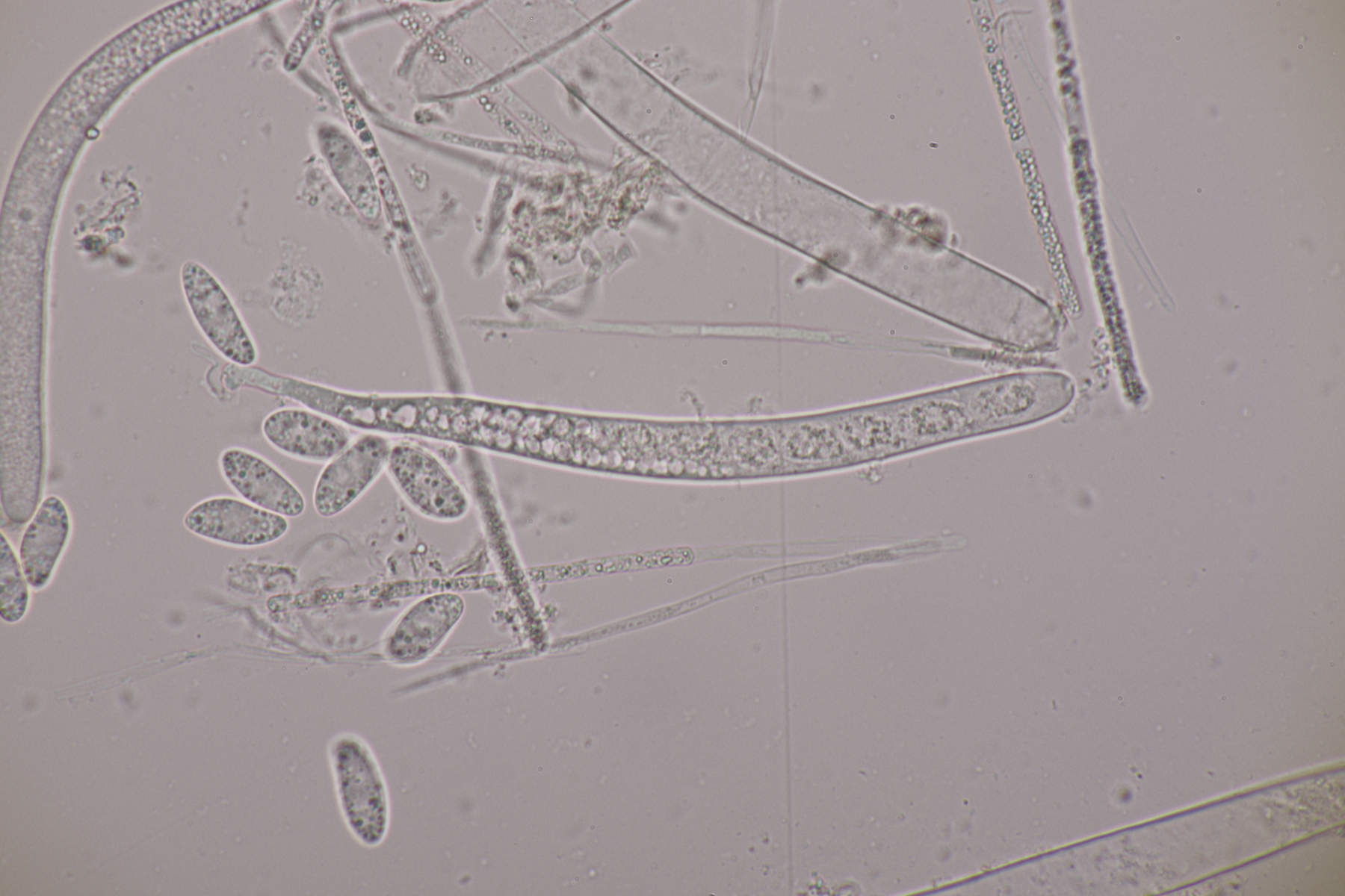 3. Eine Sporormiella: Asci mit kurzem Stiel, Sporen von (32-34) µm x (5-6) µm mit Keimspalte, die überwiegend parallel ist, aber auch einen kleinen Knick in der Mitte hat. So richtig paßt da keine Art... ist das vielleicht Sporormiella minima mit zu lang geratenen Sporen? EDIT: Sporen waren falsch gemessen. Mit den richtig ermittelten Größen paßt S. minima anstandslos.
