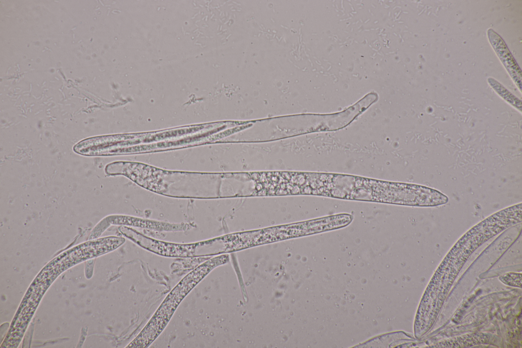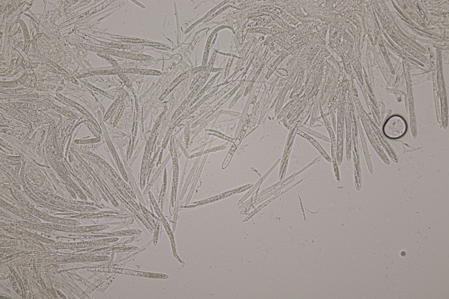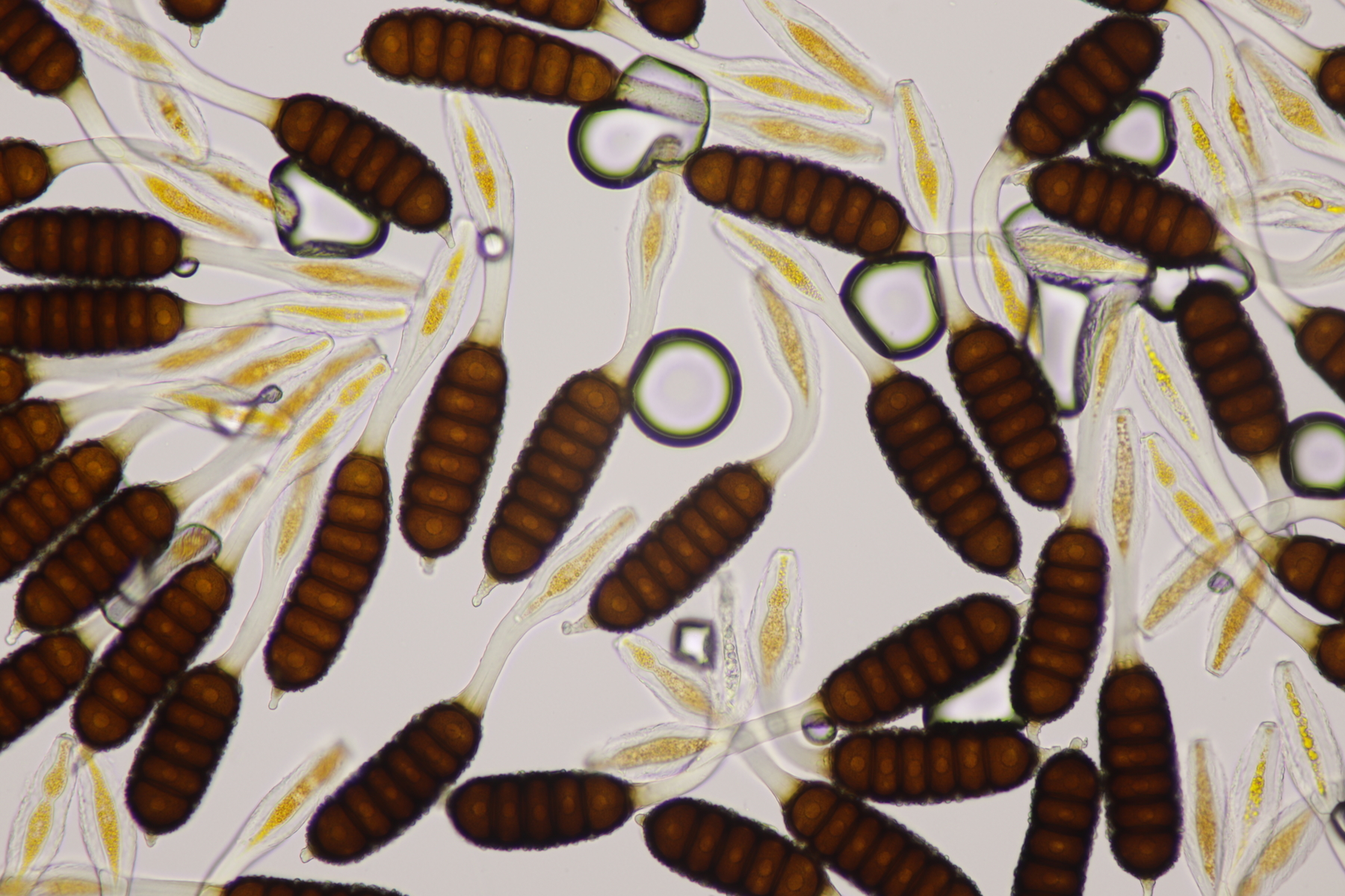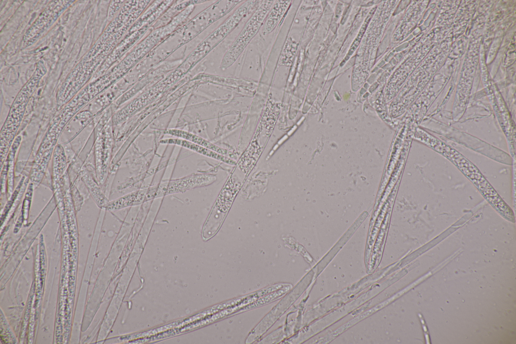 3. Eine Sporormiella: Asci mit kurzem Stiel, Sporen von (32-34) µm x (5-6) µm mit Keimspalte, die überwiegend parallel ist, aber auch einen kleinen Knick in der Mitte hat. So richtig paßt da keine Art... ist das vielleicht Sporormiella minima mit zu lang geratenen Sporen? EDIT: Sporen waren falsch gemessen. Mit den richtig ermittelten Größen paßt S. minima anstandslos.
