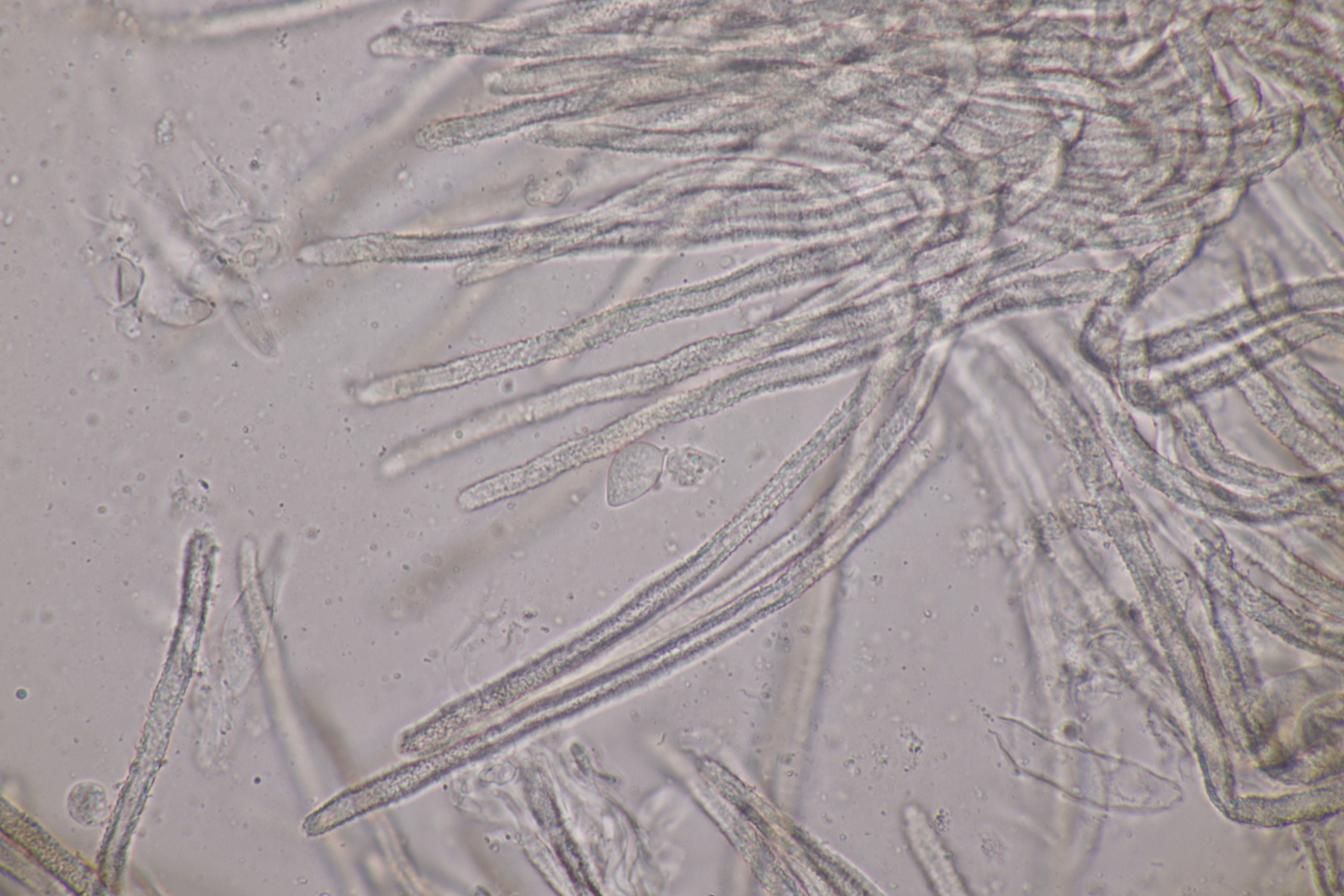 4. Und dann noch eine Inocybe, die in an einer Stelle in großer Zahl wuchs. Der Boden war sandig, sauer und es wuchsen Kiefern als Begleitbäume. Alle Zystiden dickwandig mit Kristallschopf, Basidien 4-sporig, Geruch schwach spermatisch, Sporen 10.0-12.8 x 4.8-6.5, Q=1.7-2.3, bzw. 11.0+-0.8 x 5.5+-0.5, Q=2.0+-0.2, Cheilo- und Pleurozystiden messen 57-62 x 16-19 µm. Caulozystiden sind im oberen Stielbereich vorhanden, wobei ich allerdings nicht zu entscheiden vermag, ob das nun nur am obersten Zehntel oder am obersten Drittel der Fall ist. Bei einem jungen Fruchtkörper scheint es eher ein Drittel zu sein, bei den älteren Fruchtkörper eher nur ein Zehntel. Wenn ich dann mit der Funga Nordica schlüssel, lande ich bei der Sect. Tardae nirgendwo. Bei der Sect. Fibrillosae wäre Inocybe exilis oder Inocybe abjecta zumindest von der Sporengröße her passend. Die sind aber auf inocybe.org (noch) nicht vertreten, so daß mir da ein guter Vergleich fehlt und ich einfach mal Ditte um Rißpilzbeistand bitte.