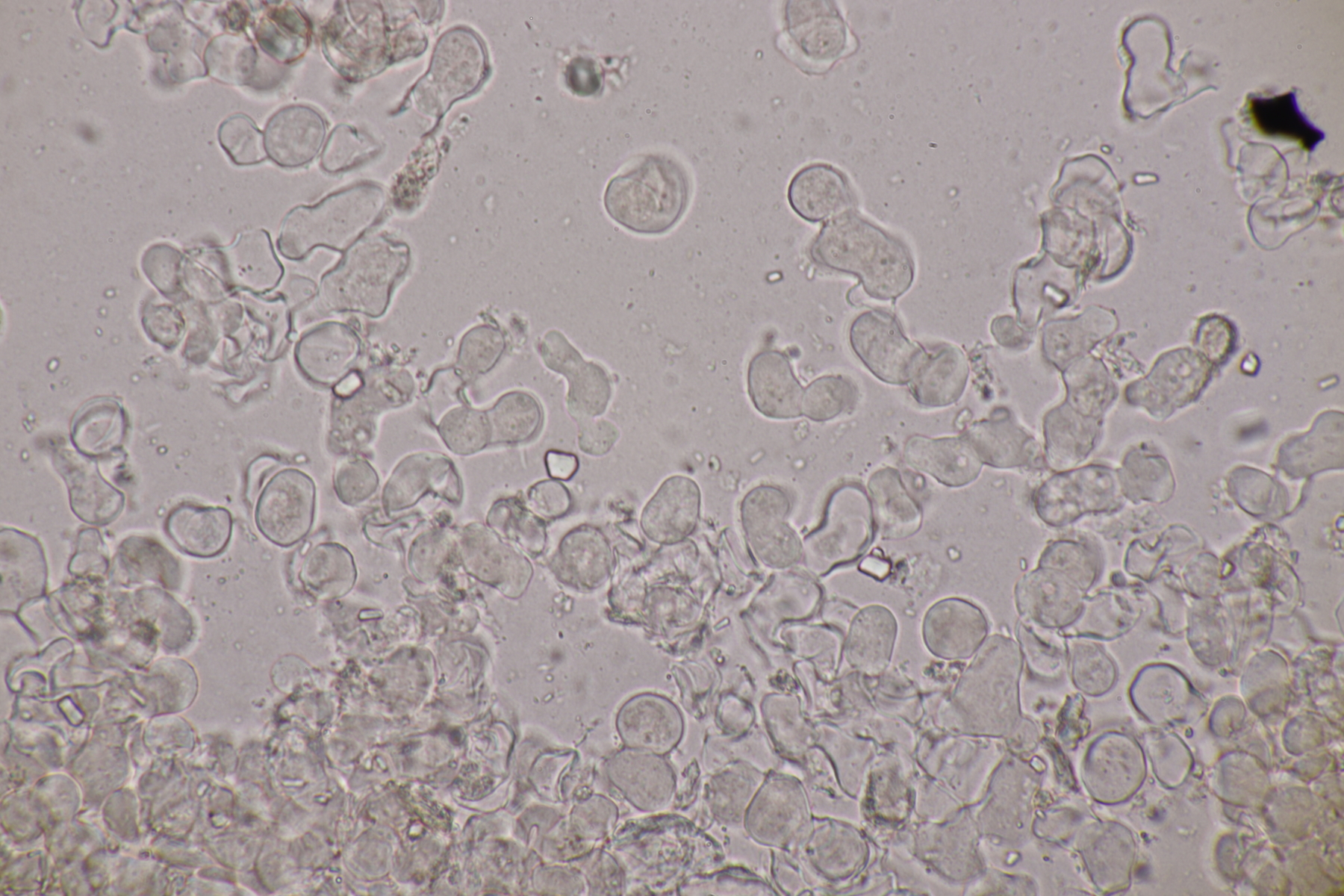 ich habe jetzt mal versucht, die Kugeln in Bewegung zu erwischen. Wenn ich mir den Dung mit der 10fach-Lupe anschaue, erkenne ich keine Bewegung. Da sind die mutmaßlichen Amöben wohl zu langsam. Und nachdem ich sie unters Deckgläschen gequetscht habe, sind sie wohl zu tot zum Bewegen. Irgendwas ist halt immer ![]()