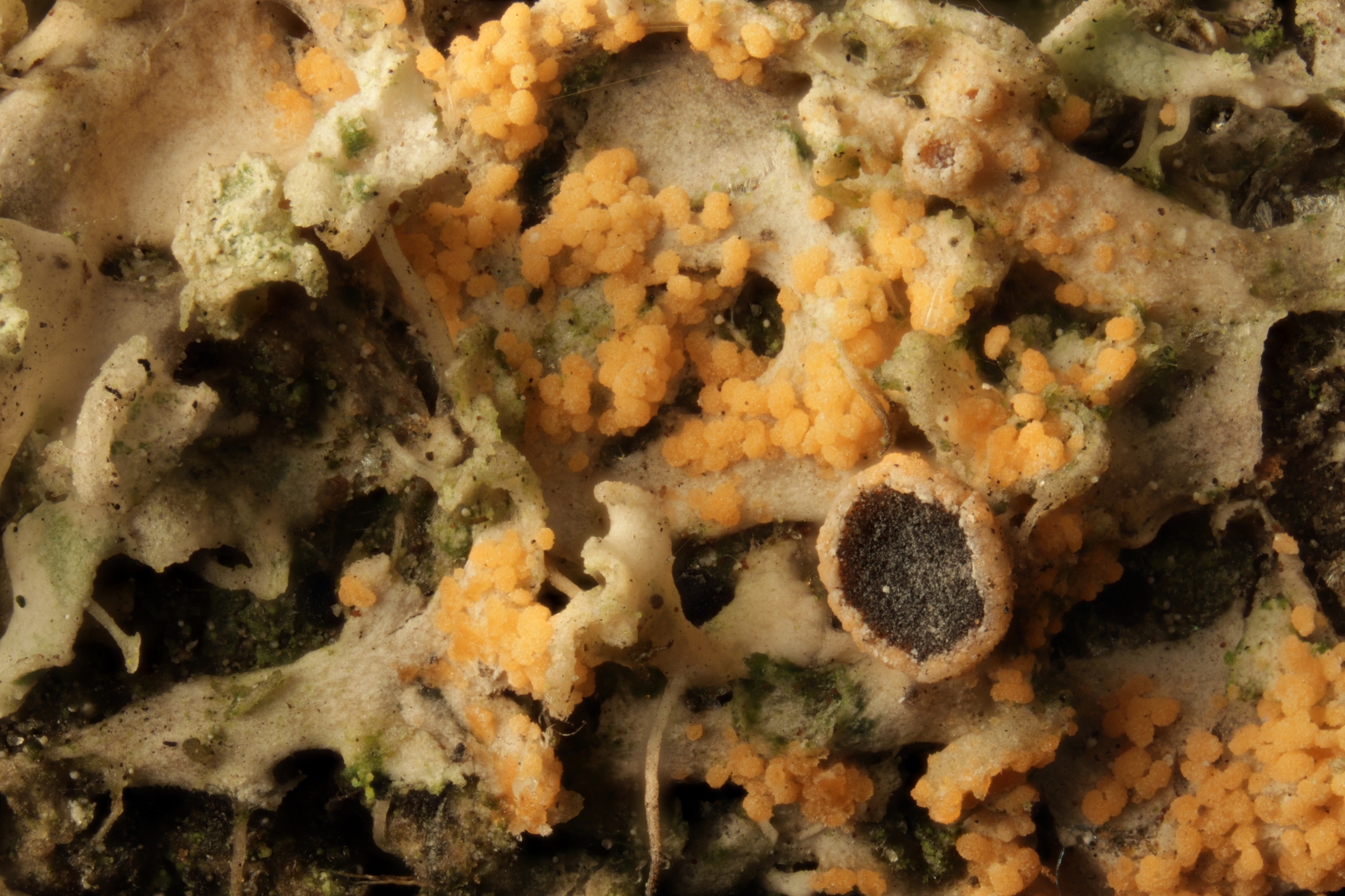 ich bin hier auch bei Pilz statt Flechte. Wie fühlte sich der Fruchtkörper denn an? Eher wachsartig? Das würde dann in der Tat in Richtung Sebacina deuten. Ansonsten gilt hier aber auch wie so oft: Ohne Mikroskop kann man viel spekulieren, wird aber zu keiner soliden Aussage kommen.