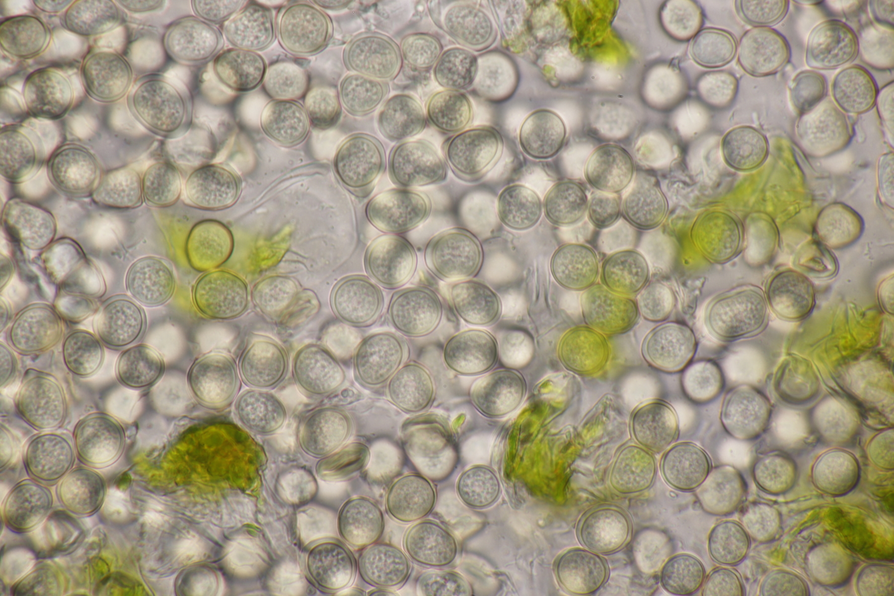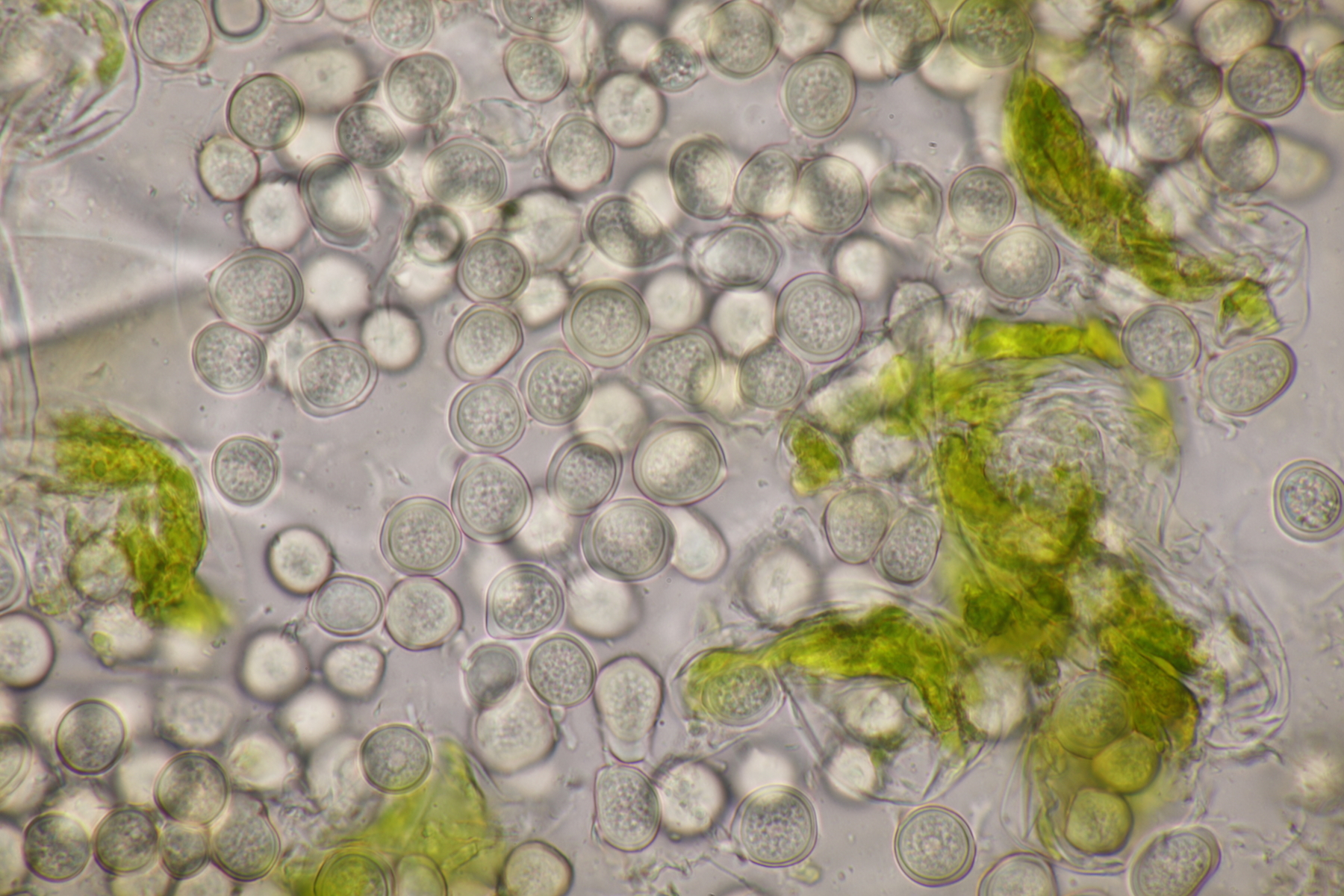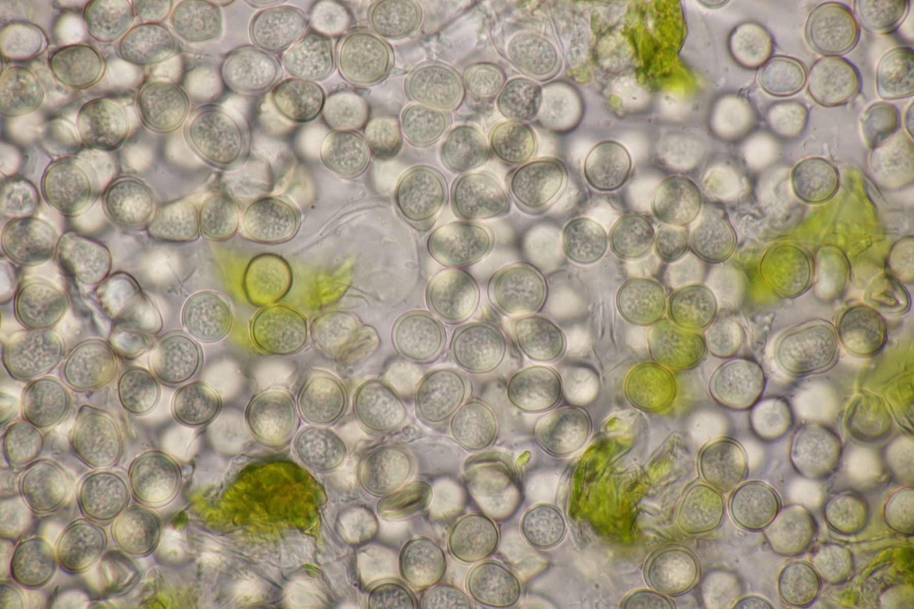 18. Dann gab es da noch kleine Bovisten mit einem Durchmesser von <1 cm. Im Feld hatte ich gehofft, daß das Bovista pusilla würde. Aber da paßt das Capillitium nicht, das vom Lycoperdon-Typ ist, keine Septen hat und viele Poren aufweist. Die Sporen messen 4.0-5.2 µm, im Mittel 4.4 µm, sind schwach warzig und haben kein Pedicel. Da bleiben dann nicht mehr viele Bovista-Arten im Rennen: B. paludosa und Bryoperdon acuminatum sind habitatsmäßig raus. B. aestivalis s.l. sollte kleinere Sporen und eine Subgleba haben und B. furfuracea sollte vereinzelt Septen im Capillitium haben. Hat da jemand eine Idee zu?