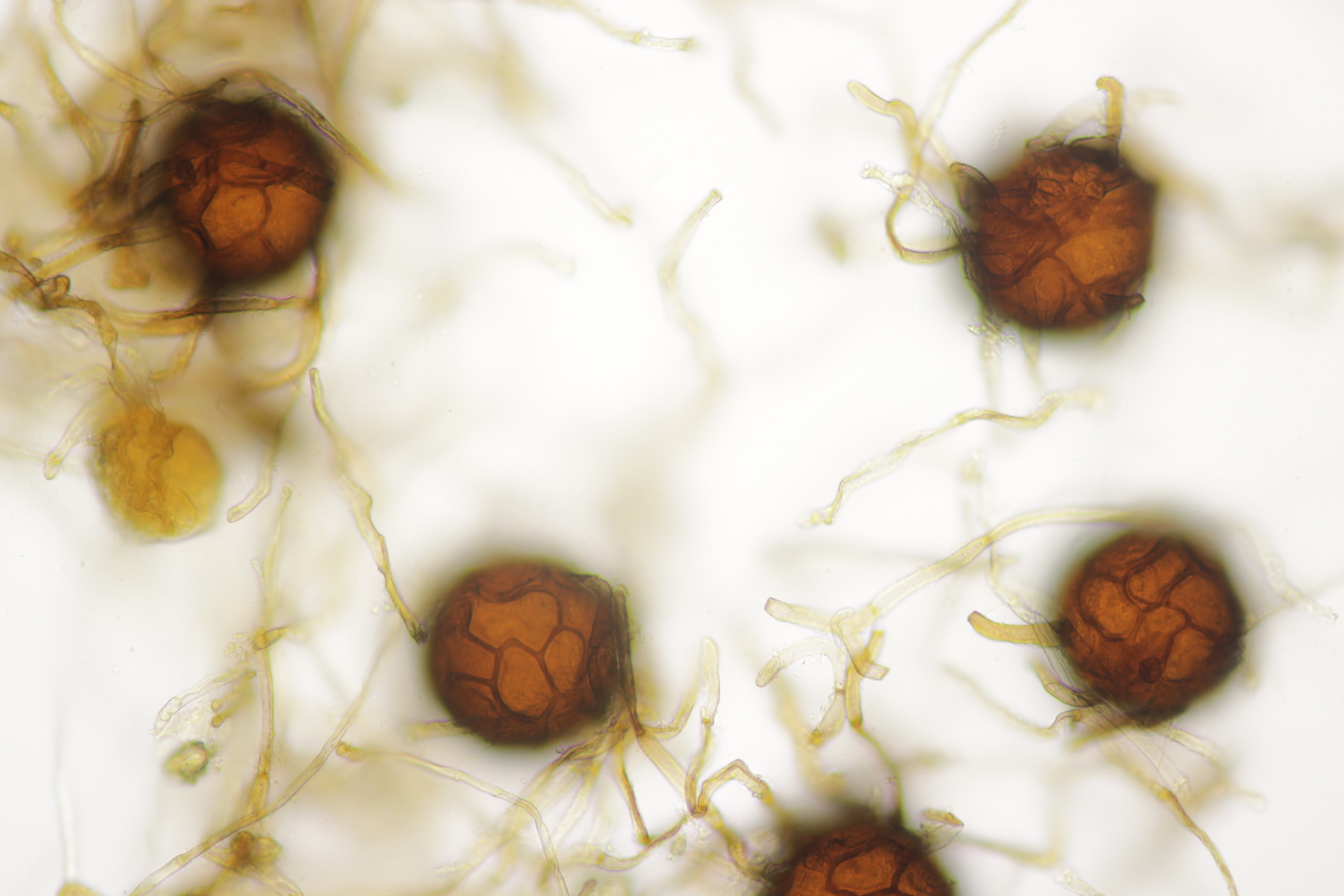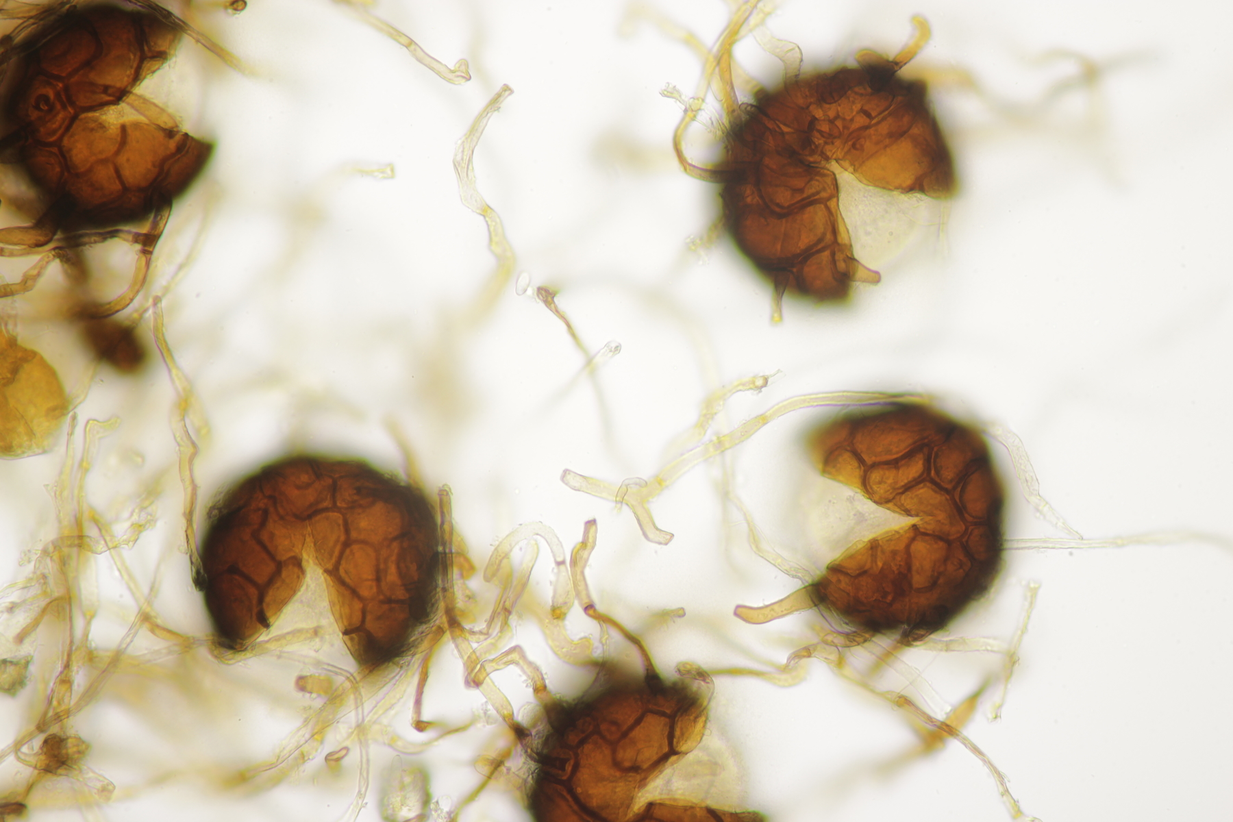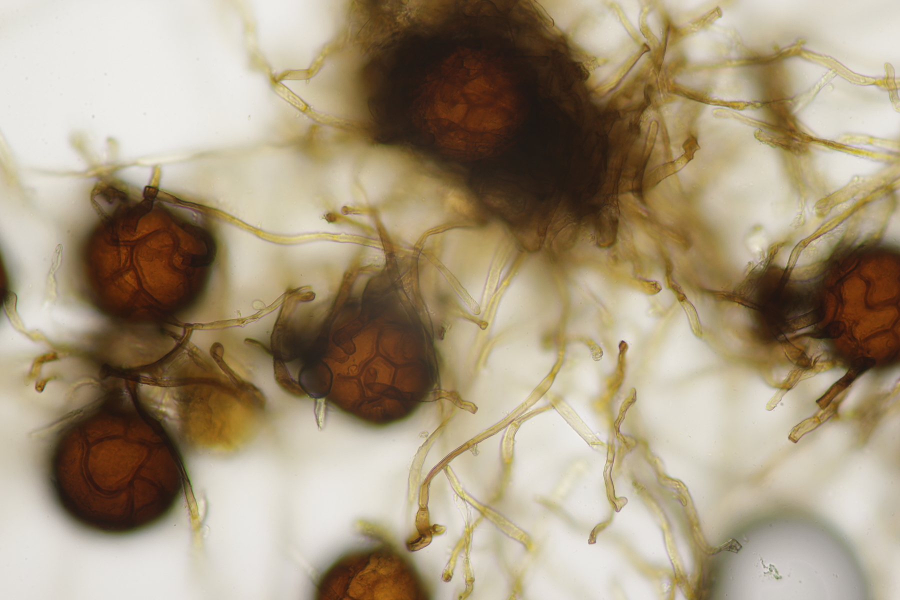 18. Dann gab es da noch kleine Bovisten mit einem Durchmesser von <1 cm. Im Feld hatte ich gehofft, daß das Bovista pusilla würde. Aber da paßt das Capillitium nicht, das vom Lycoperdon-Typ ist, keine Septen hat und viele Poren aufweist. Die Sporen messen 4.0-5.2 µm, im Mittel 4.4 µm, sind schwach warzig und haben kein Pedicel. Da bleiben dann nicht mehr viele Bovista-Arten im Rennen: B. paludosa und Bryoperdon acuminatum sind habitatsmäßig raus. B. aestivalis s.l. sollte kleinere Sporen und eine Subgleba haben und B. furfuracea sollte vereinzelt Septen im Capillitium haben. Hat da jemand eine Idee zu?