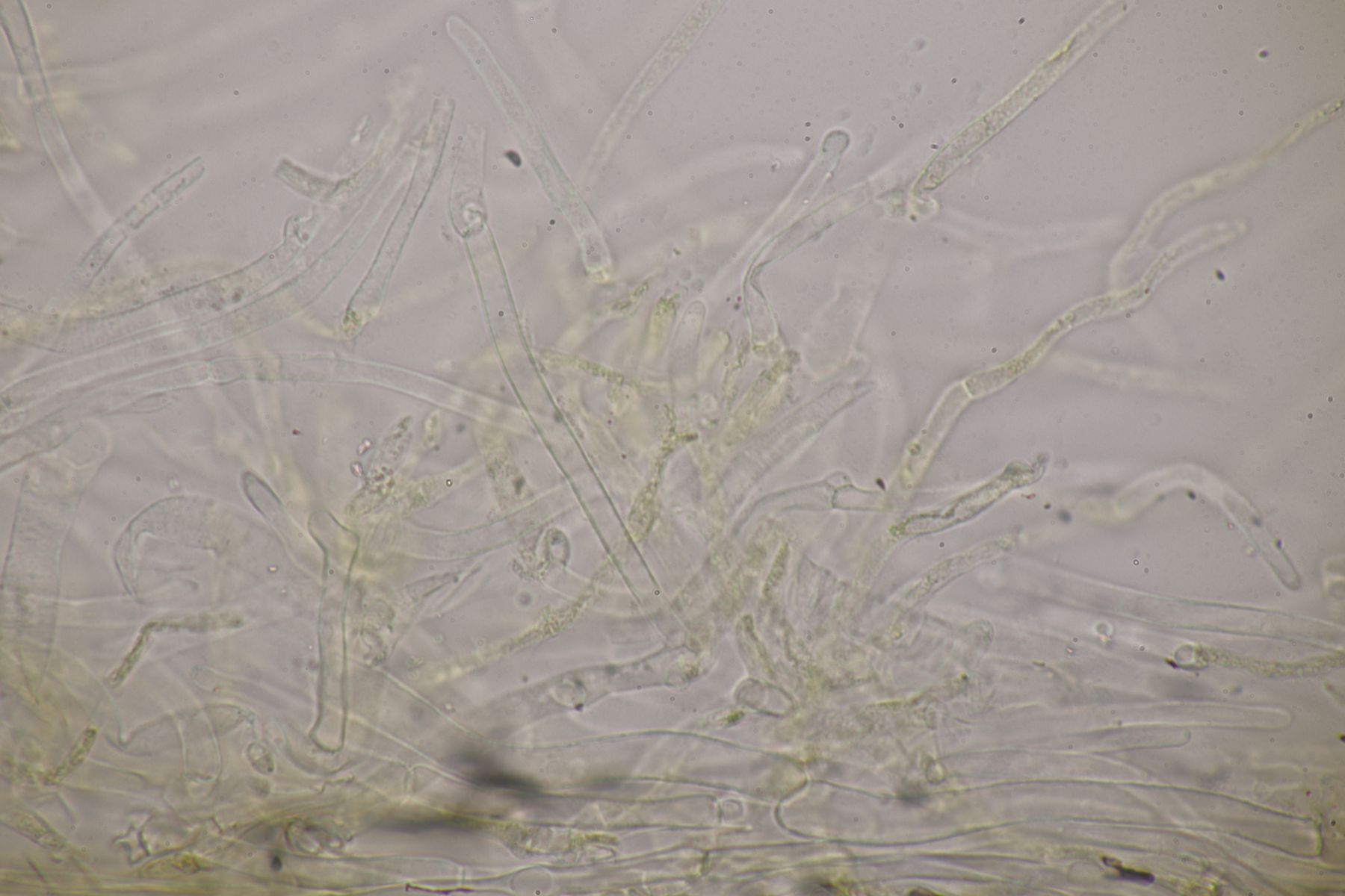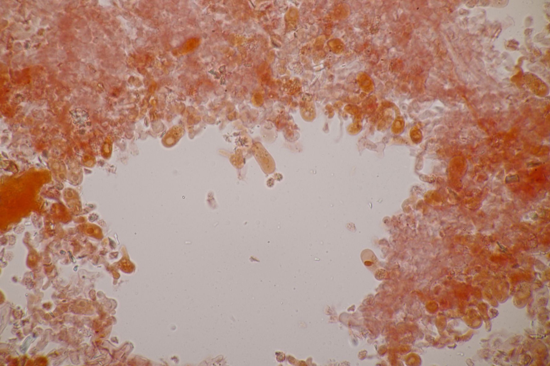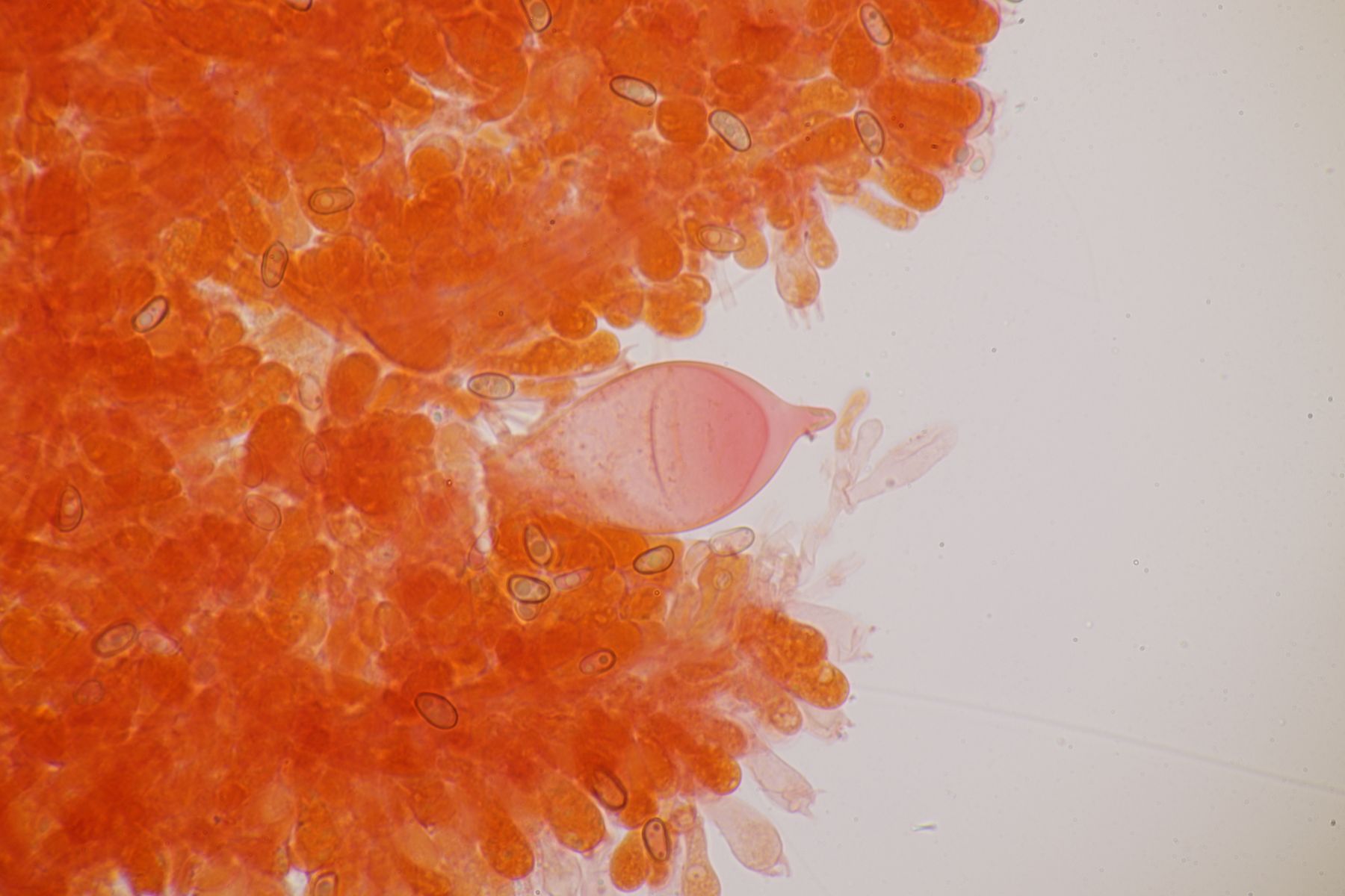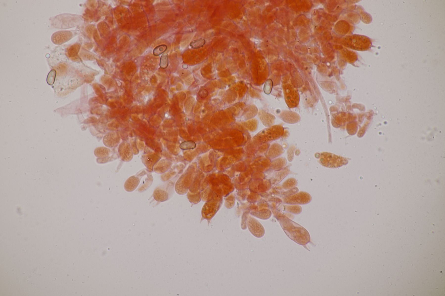 8. Eine Cyanula, die auf der Fläche eines ehemaligen Fischteichs wächst. Die Fläche ist jetzt nur noch im Frühling überflutet und den Rest des Jahres trockengefallen. Der Boden ist hier nicht super mager, da sich auf dem Sandboden im Laufe der Zeit auch etwas Teichschlamm abgelagert hat. Sporen messen 10,4±0,8 µm × 7,9±0,5 µm, Q=1,3±0,1; 9,1-11,6 µm × 6,8-8,8 µm, Q=1,1-1,4. Die Lamellenschneide ist fertil, eventuell sind dort einige sehr schmale Cheilozystiden - das könnten aber auch einfach Basidiolen sein.