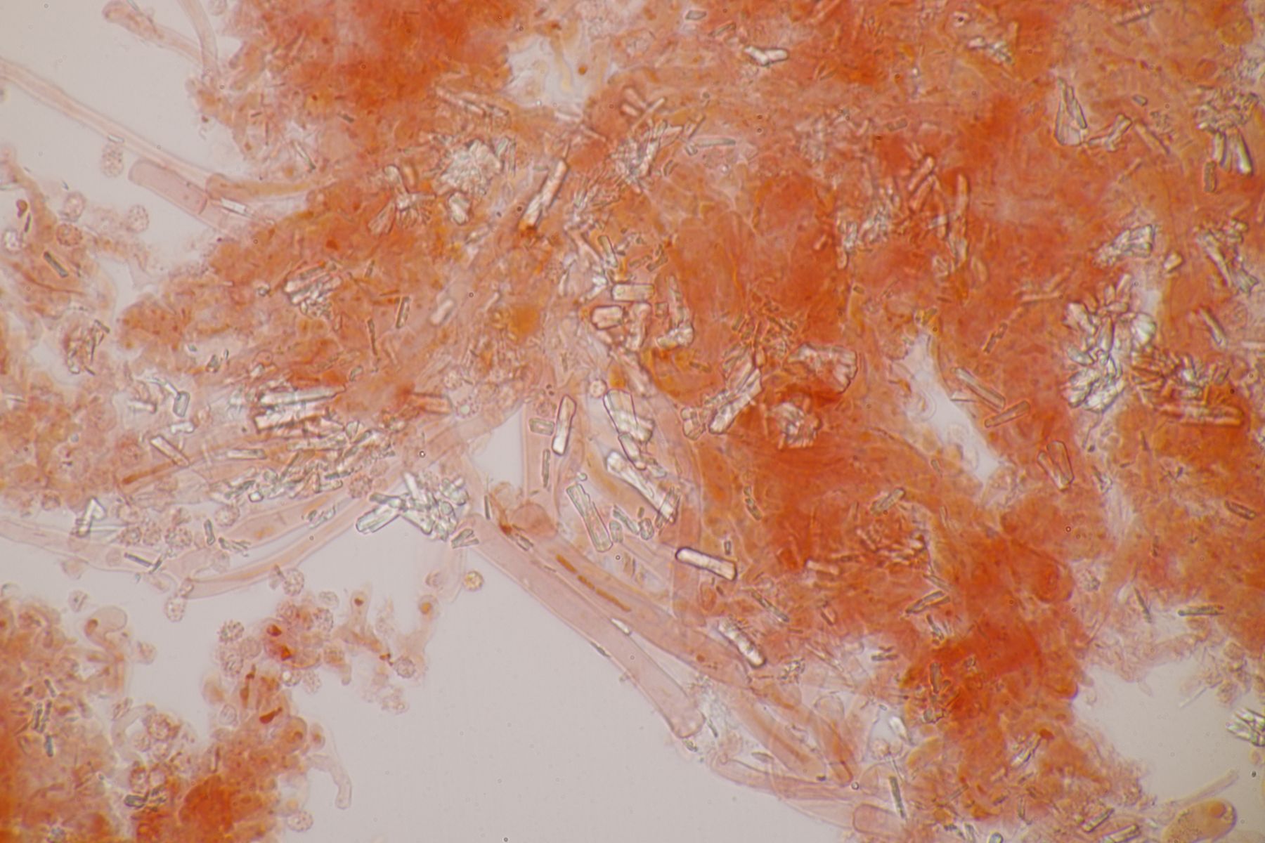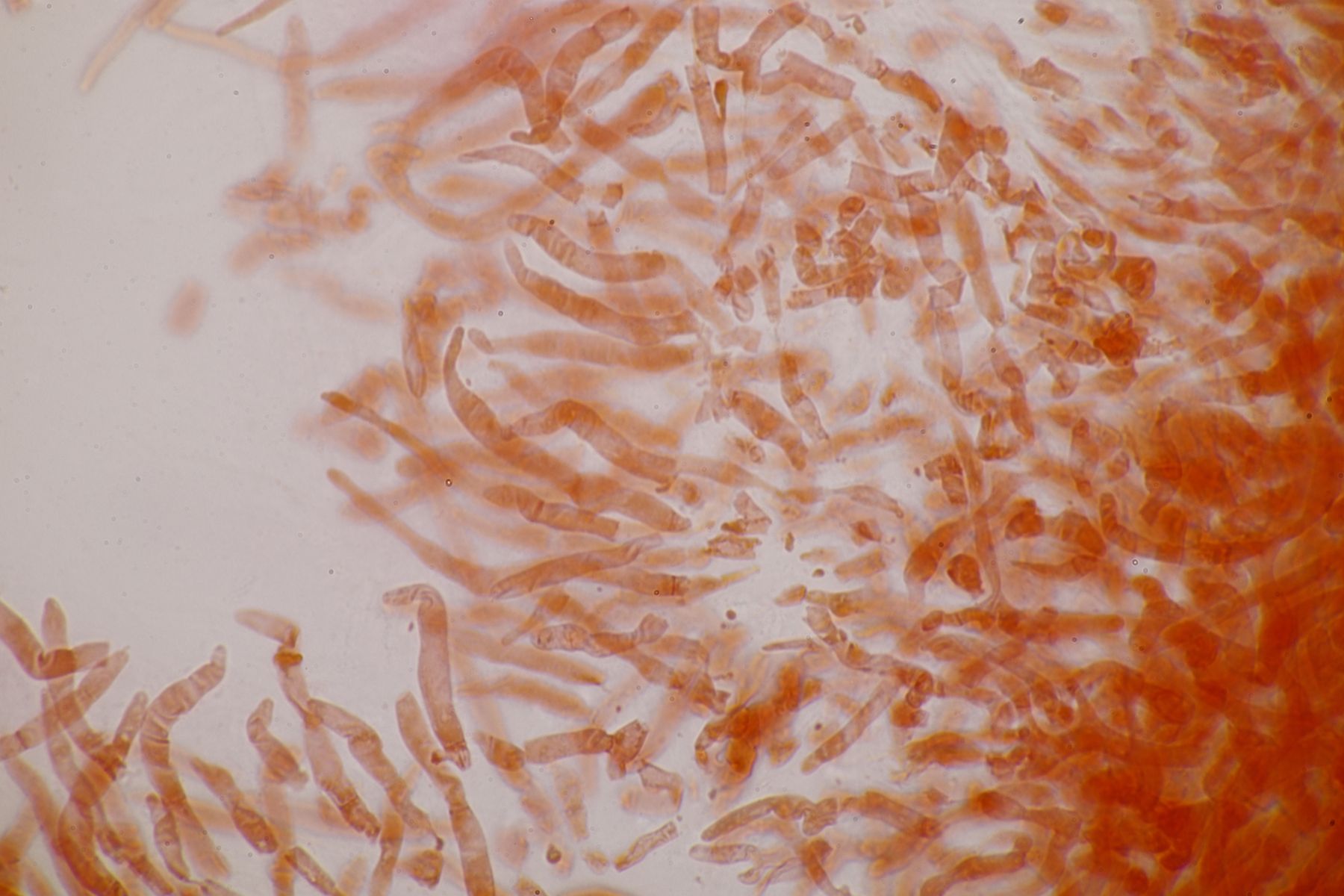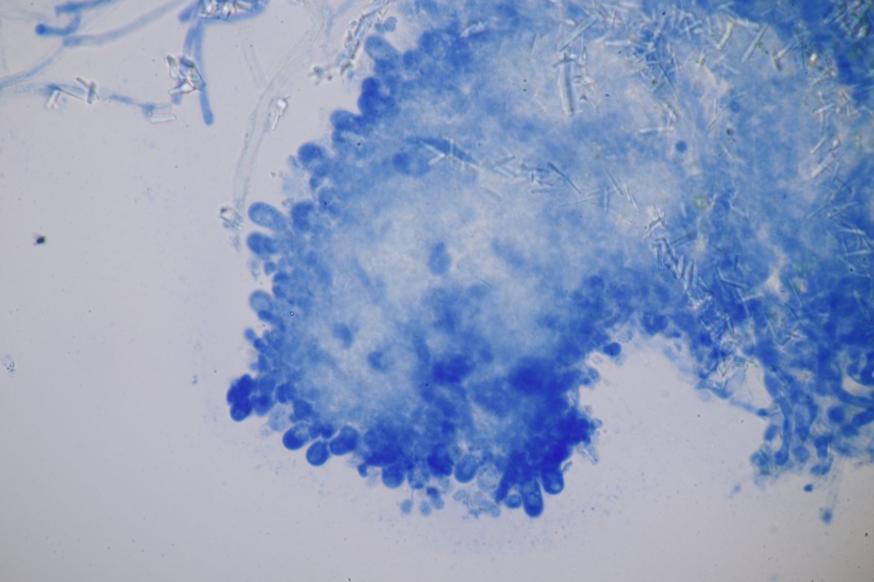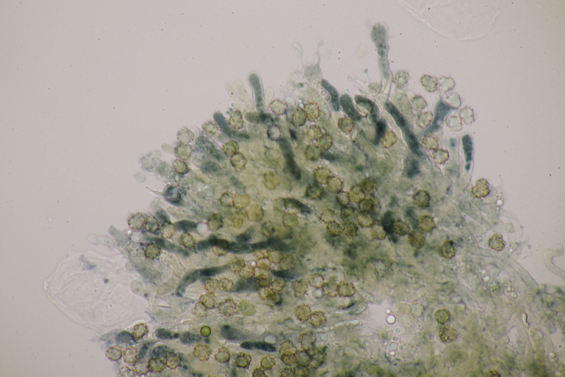 8. Eine Cyanula, die auf der Fläche eines ehemaligen Fischteichs wächst. Die Fläche ist jetzt nur noch im Frühling überflutet und den Rest des Jahres trockengefallen. Der Boden ist hier nicht super mager, da sich auf dem Sandboden im Laufe der Zeit auch etwas Teichschlamm abgelagert hat. Sporen messen 10,4±0,8 µm × 7,9±0,5 µm, Q=1,3±0,1; 9,1-11,6 µm × 6,8-8,8 µm, Q=1,1-1,4. Die Lamellenschneide ist fertil, eventuell sind dort einige sehr schmale Cheilozystiden - das könnten aber auch einfach Basidiolen sein.