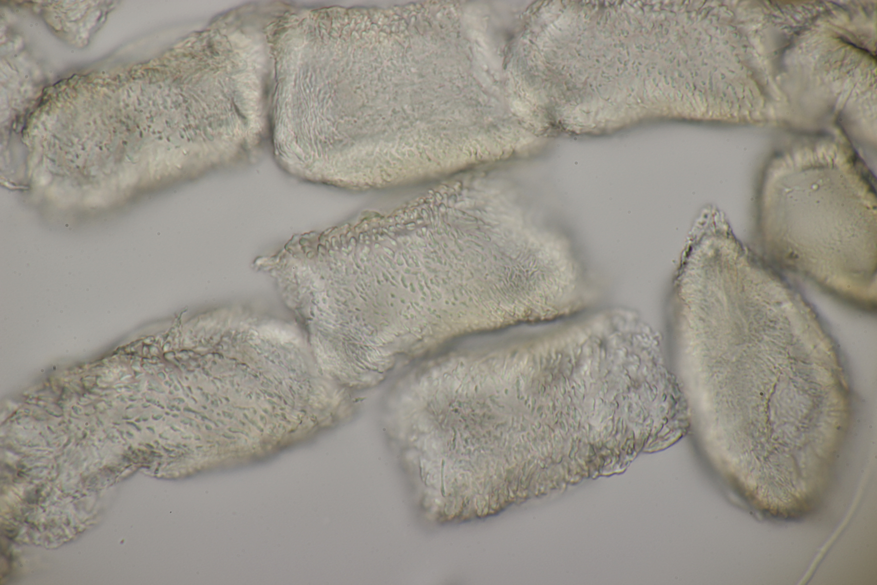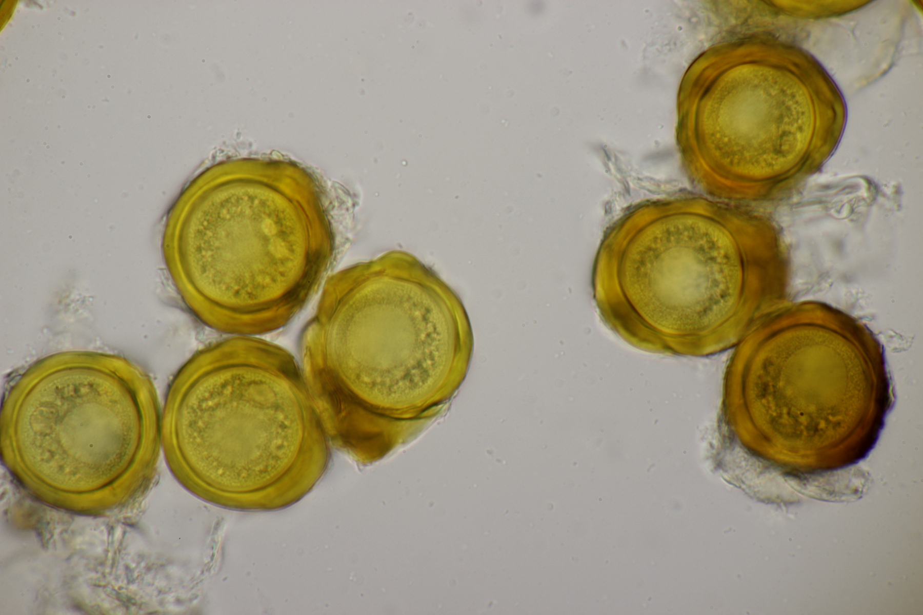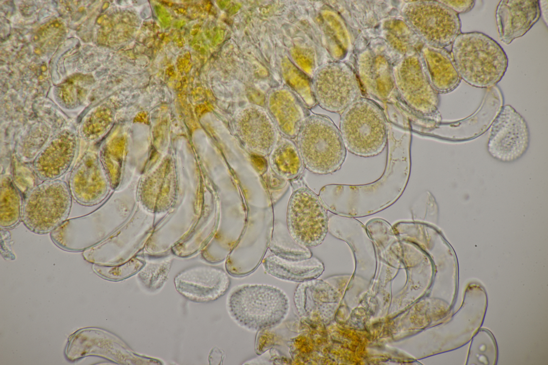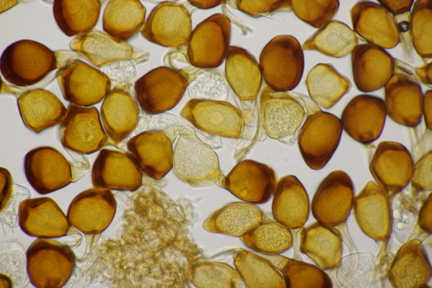 ich war da auch schwer beeindruckt von. Leider war der Sporenabwurf nicht sehr ergiebig (das ist bei Telephorales ja sonst nie ein Problem an Sporen zu kommen), sonst hätte man das sicher auch noch besser ablichten können. Denn die Sporen waren natürlich fast alle so orientiert, daß der Keimporus nicht seitlich oder auf der Oberseite war...