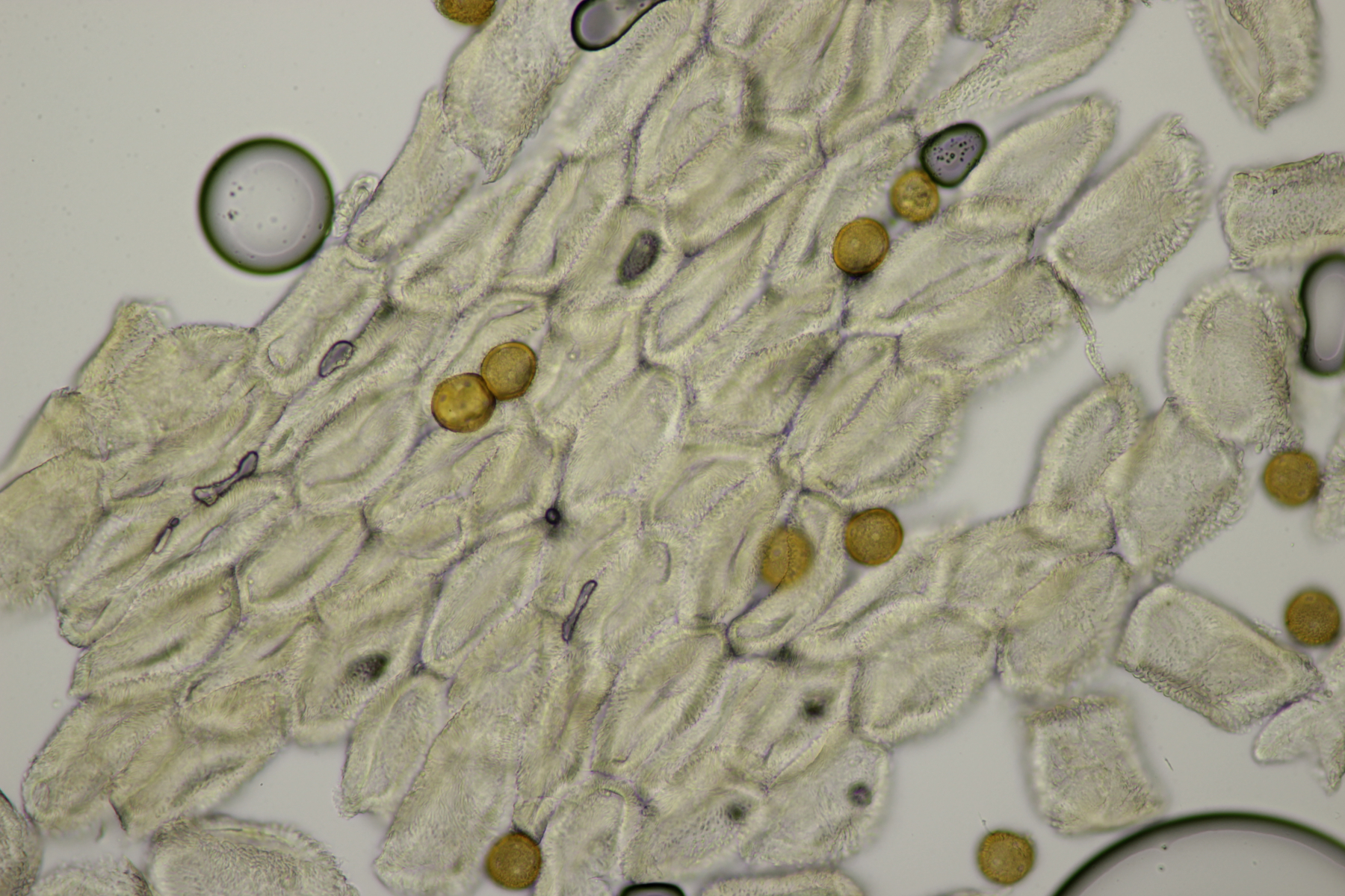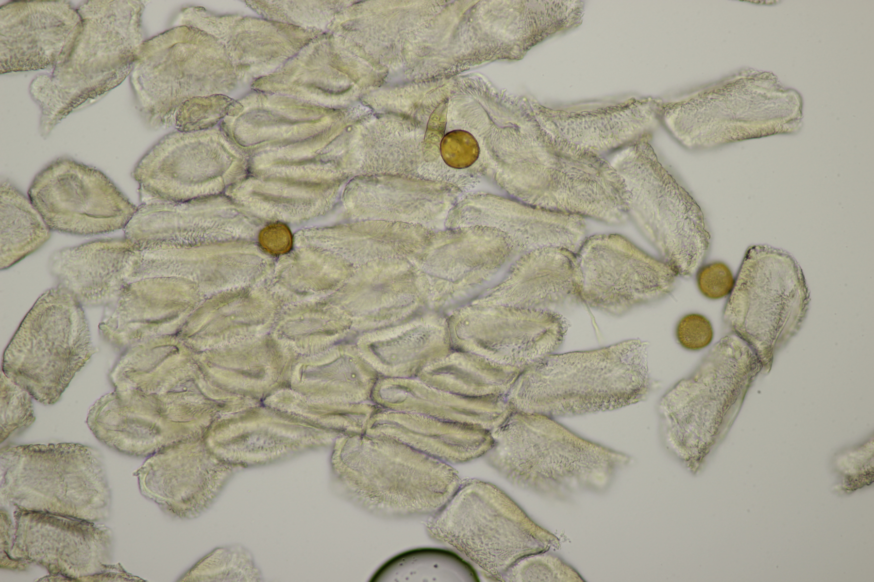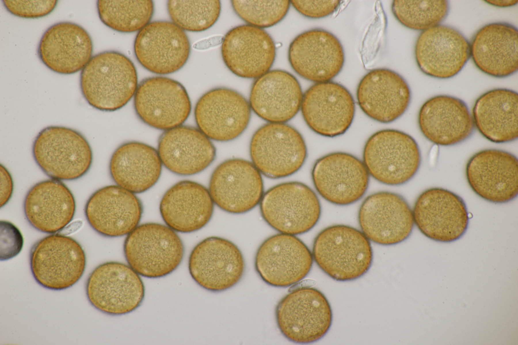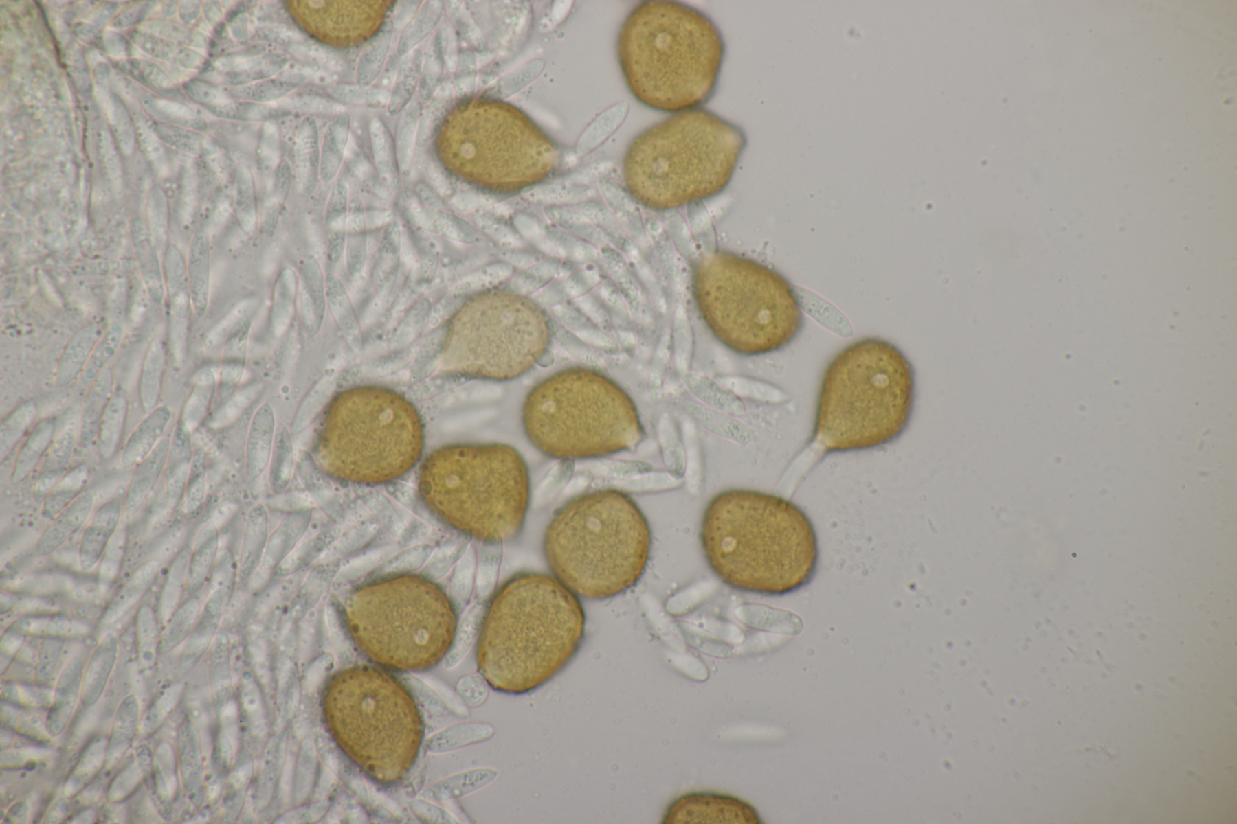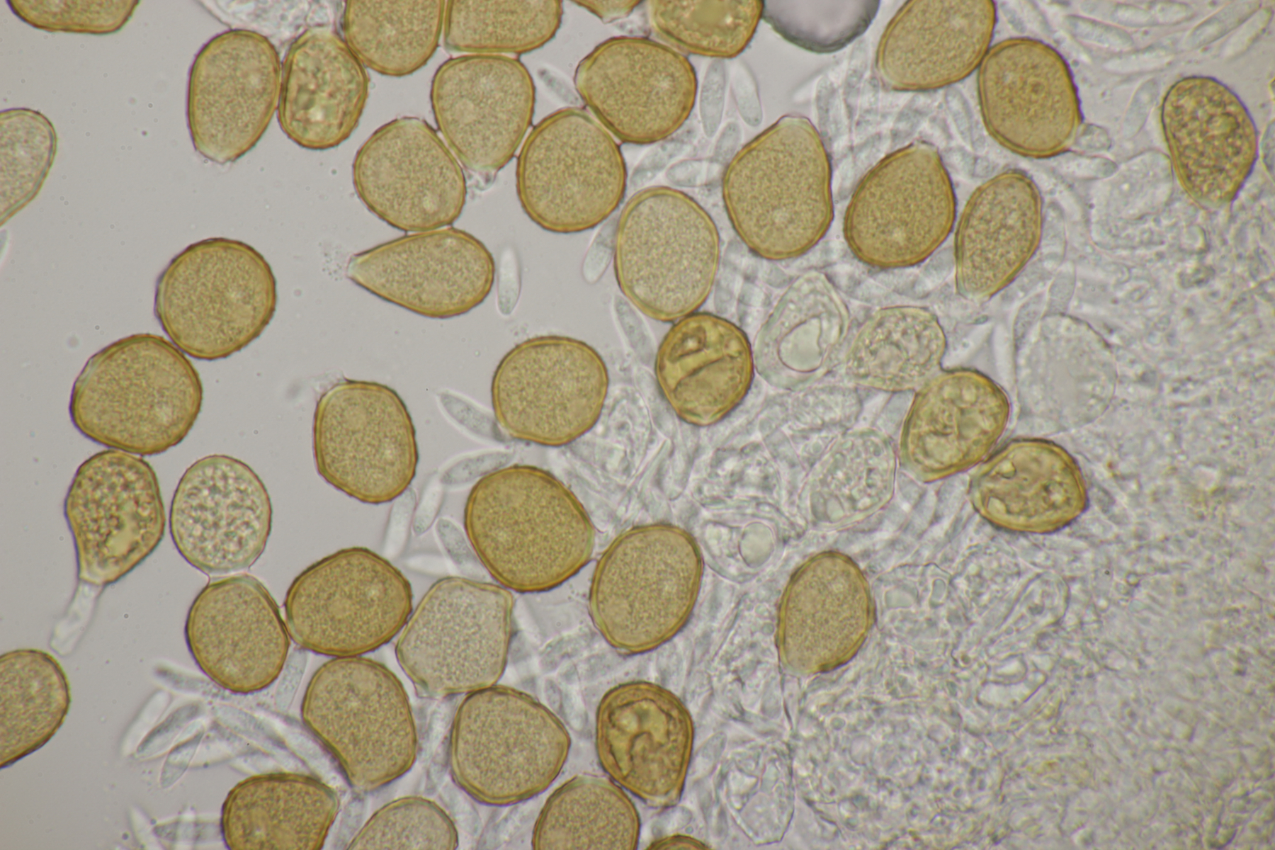 4. Und dann noch ein Unbekannter. Im Feld hatten wir erstmal auf eine Cystoderma getippt. Aber dazu passen weder die Huthaut noch die dextrinoiden Sporen. Zu einer Lepiota scheinen die Runden Sporen von (4.8+-0.4) µm x (4.4+-0.2) µm, Q=1.1, (4.0-5.6) µm x (4.0-4.9) µm, Q=1.0-1.2 nicht. Aber was ist es dann?