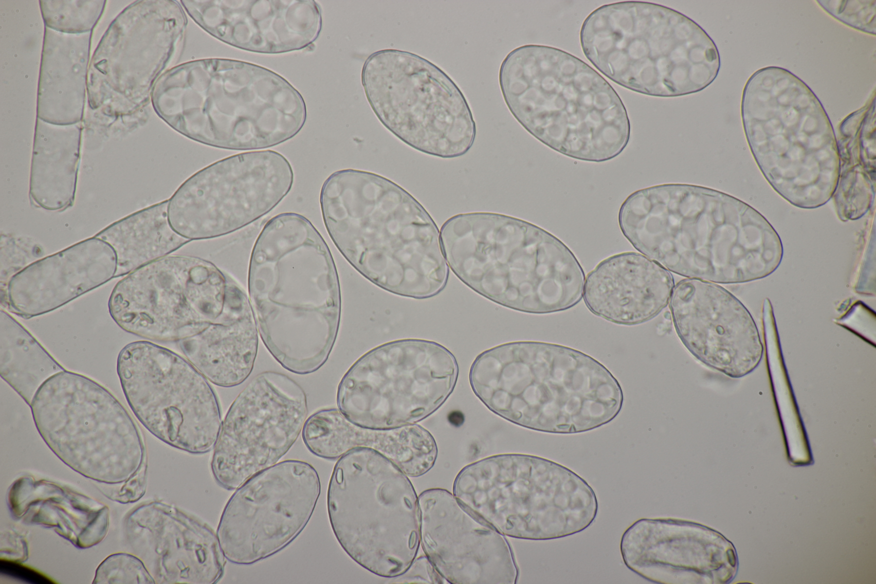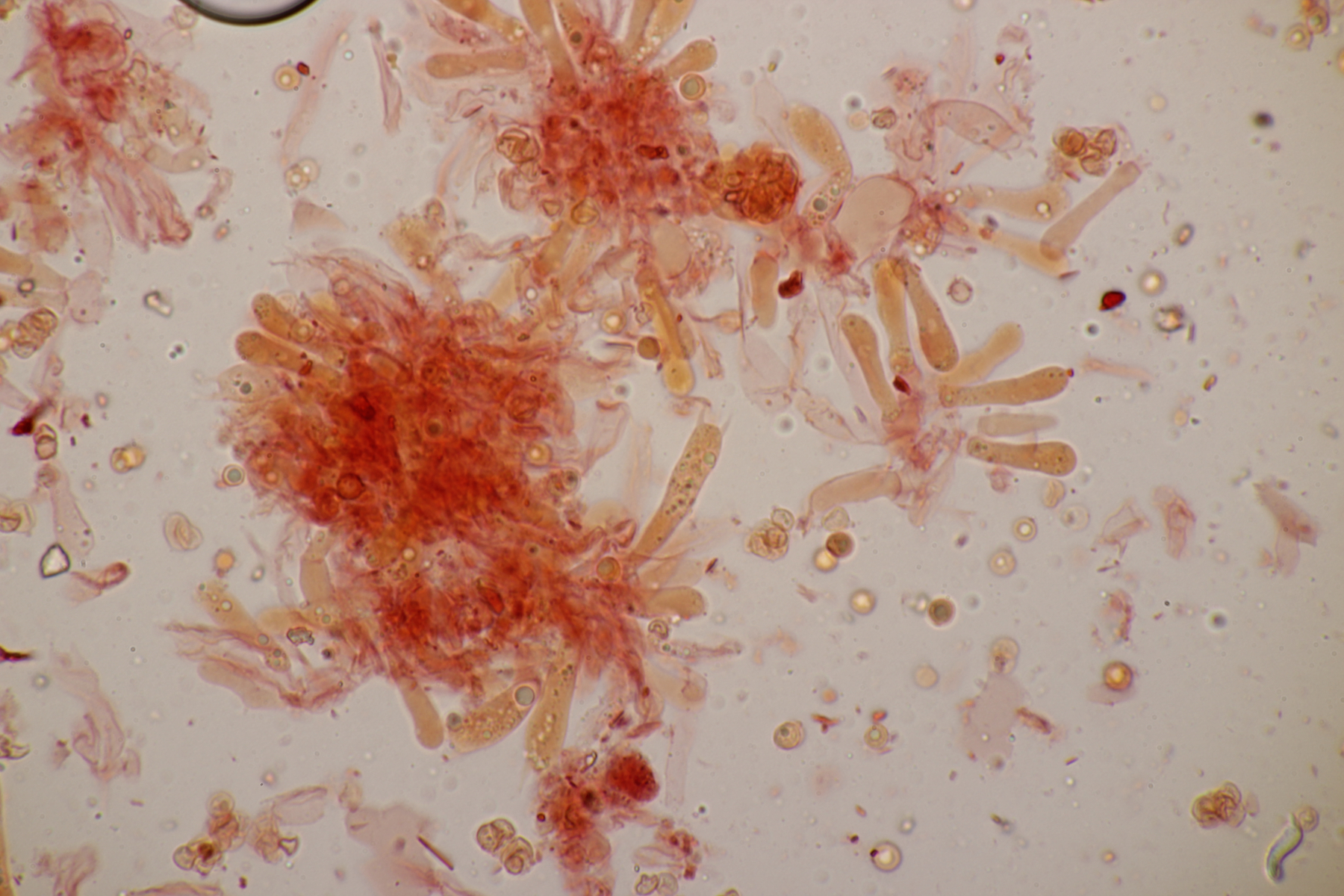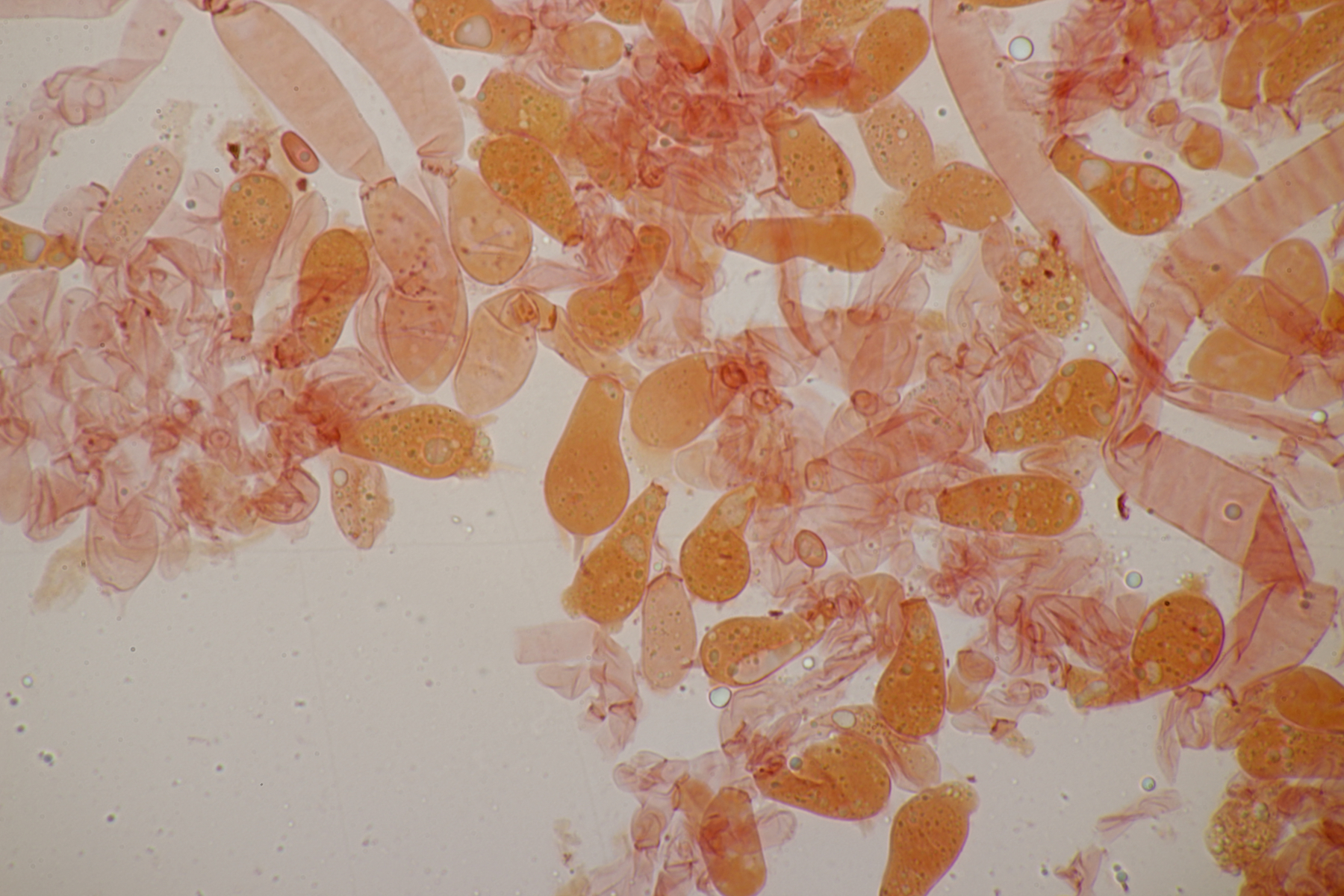Bei den Russulas hilft es glaube ich, daß ich so langsam weiß, wodrauf man bei der Huthaut zu achten hat. Wenn ich es dann noch schaffe, wirklich nur winzige Mengen Huthaut und Sporen zu mikroskopieren, dann gelingen mitunter auch halbwegs passable Bilder.