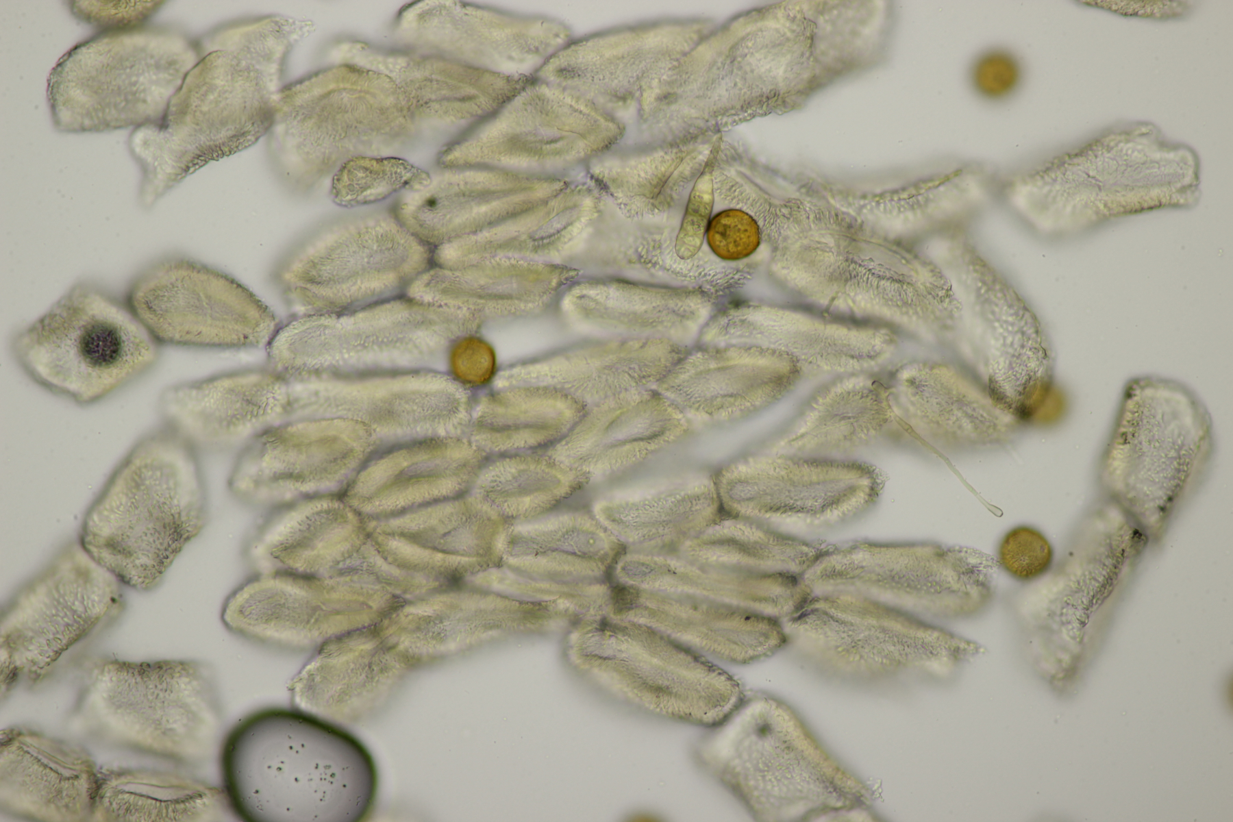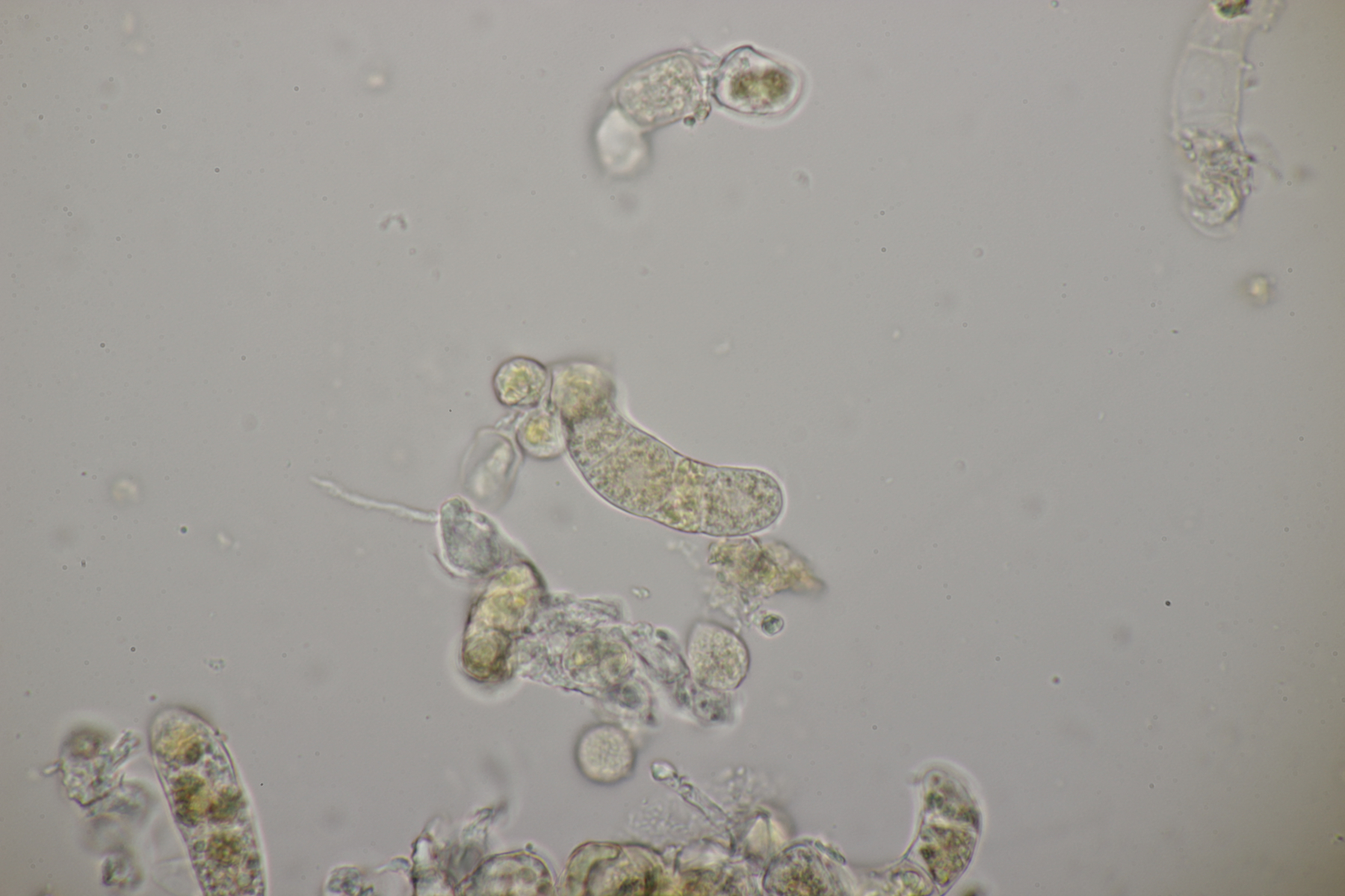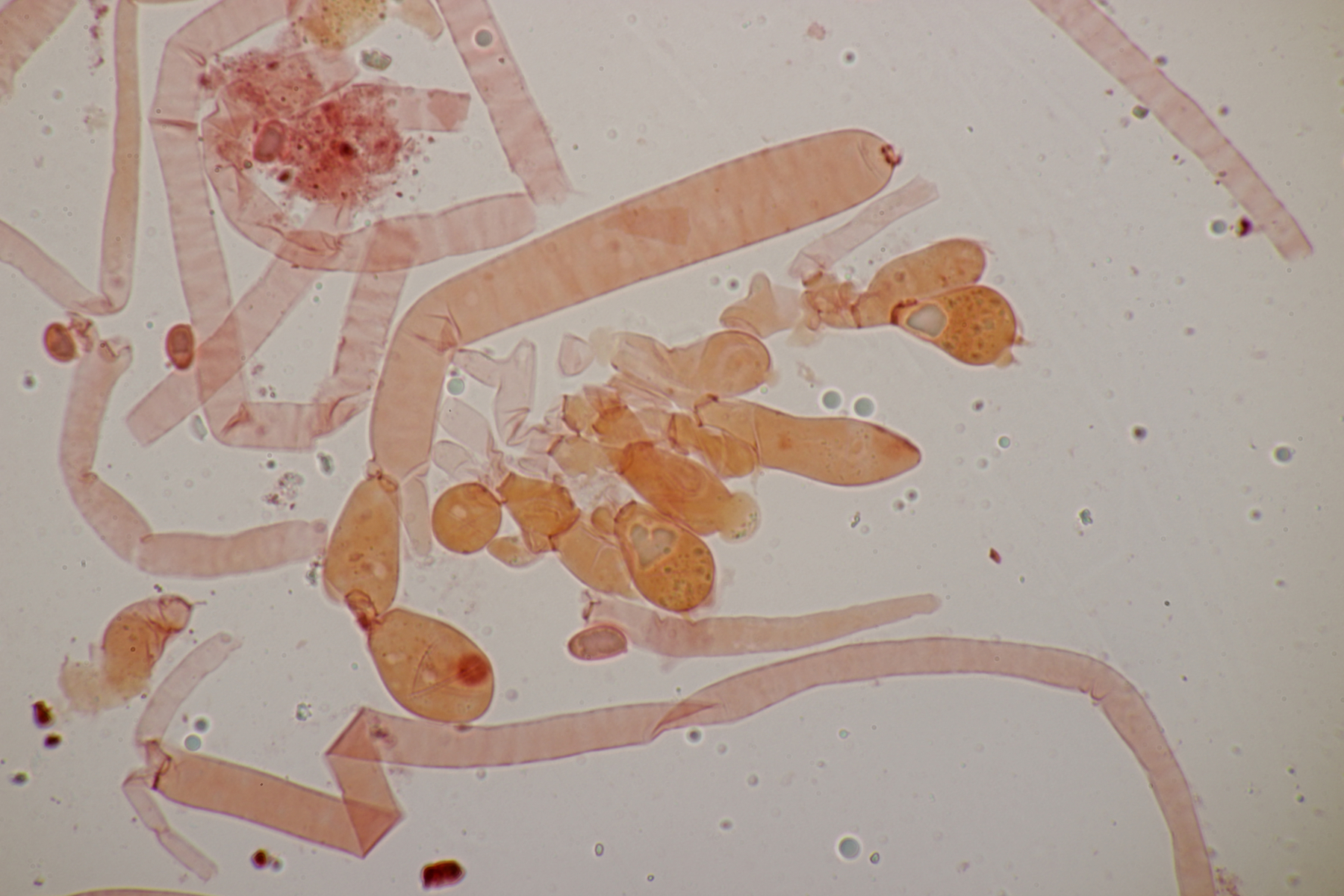 Bei den Russulas hilft es glaube ich, daß ich so langsam weiß, wodrauf man bei der Huthaut zu achten hat. Wenn ich es dann noch schaffe, wirklich nur winzige Mengen Huthaut und Sporen zu mikroskopieren, dann gelingen mitunter auch halbwegs passable Bilder.