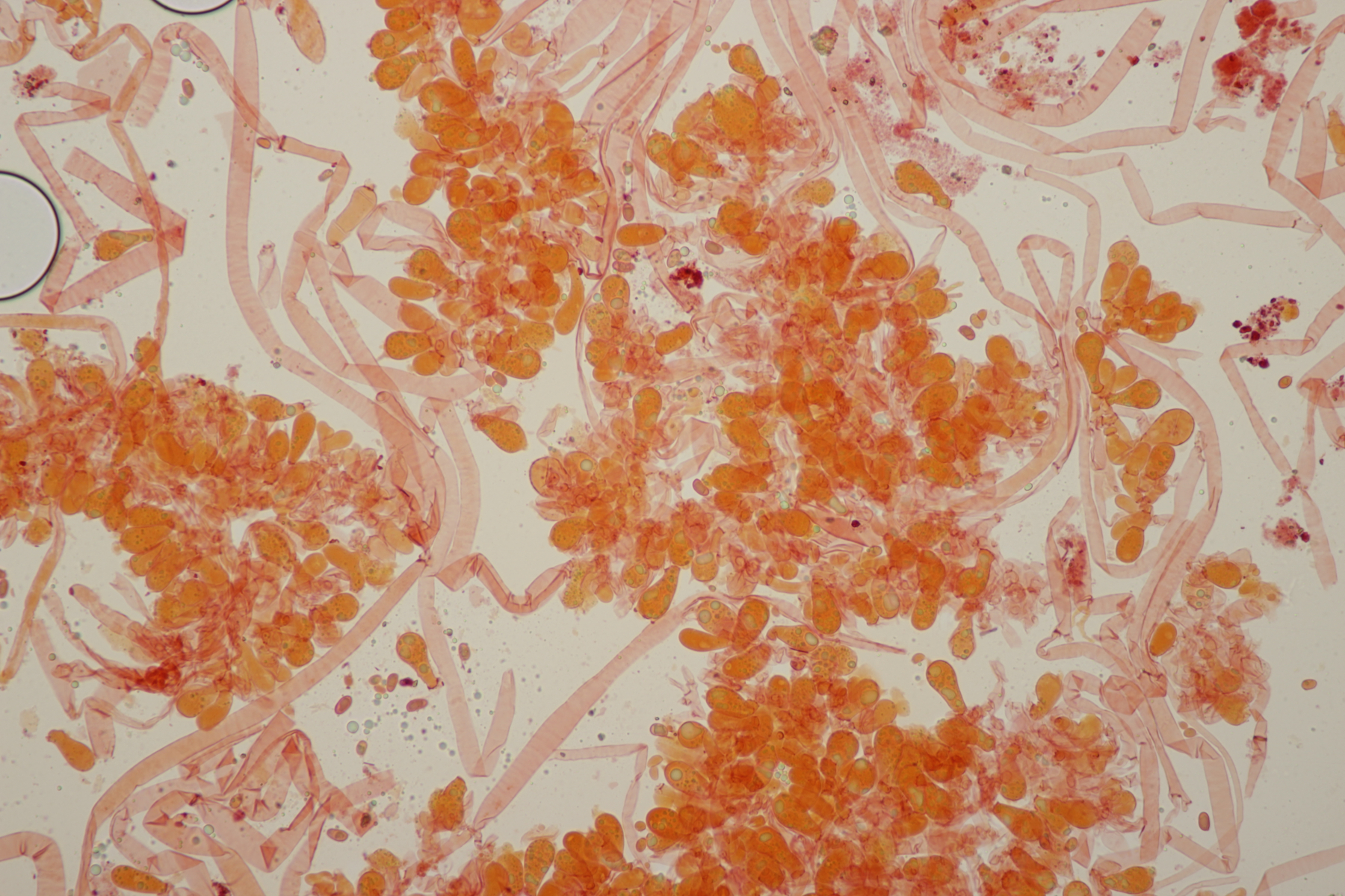 2. Im Wald dann schon wieder eine Tomentella mit leuchtenden Orange-Tönen. Die Sporen sind unregelmäßig gelappt und messen (6.5-7.6) µm x (5.5-6.8) µm, Schnallen sind vorhanden, Zystiden gibt es keine, die Subhymenialhyphen erscheinen regelmäßig. Beim Mikroskopieren in KOH fällt auf, daß sich eine gelb-grüne Substanz löst. Beim Mikroskopieren in Wasser war an den Basidiolen außen teilweise eine amorphe Substanz an der Spitze befindet. Soweit ich es beurteilen kann, ist das Hymenium nicht cyanescent. Rhizomorphen sind vorhanden. Wenn ich durch Franks Schlüssel gehe, lande ich dann am Ende bei T. umbrinospora. Die hatte ich letztes Jahr in Krefeld und sah dann aber mikroskopisch doch etwas anders aus. Bin ich also irgendwo falsch abgebogen?