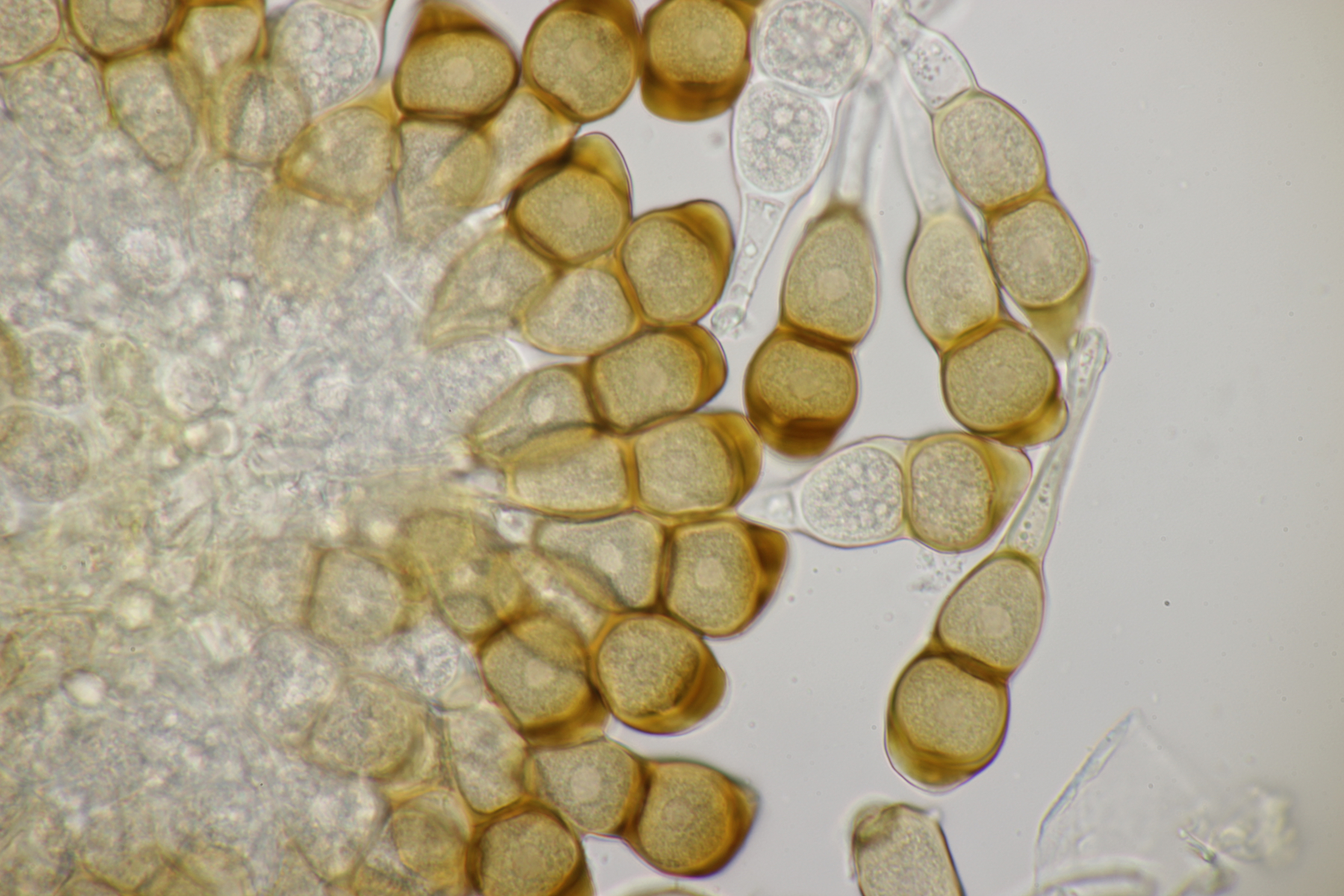12. Diese gelben Becher hatten im Feld meine Aufmerksamkeit erregt. Ich hatte ja zunächst auf eine Ramsbottomia gehofft, aber die Sporen brachten Ernüchterung: Pulvinula. Sporenmaße von 13.5-14 µm passen erstmal nicht zu P. constellatio, aber vllt müssen die Fruchtkörper auch einfach noch etwas nachreifen. Die Art scheint es nämlich durchaus auch in gelb statt dem üblichen zinnoberrot zu geben.