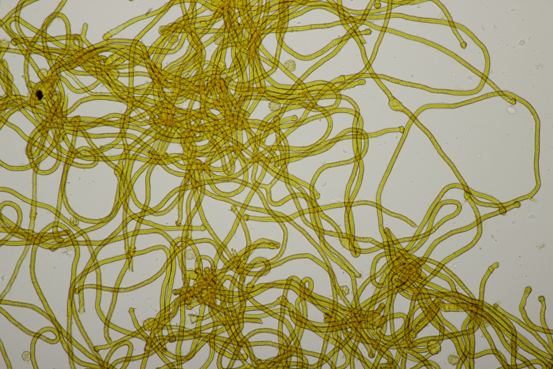 Und dann gibt es da schon seit über eine Woche immer wieder eine Podospora. Die Perithecien sind richtig dicke Kugeln, oben am Hals mit dünnen, hyphenartigen Haaren. Leider waren bis jetzt alle Fruchtkörper, die ich geerntet habe, nicht reif. So ganz gar waren die Funde von gestern dann auch noch nicht, aber vielleicht gelingt es ja mit dem Nobi-Joker trotzdem, einen Namen zu vergeben. Die Sporen messen (31.5-39.4) µm x (22.3-26.5) µm, das Pedicel (30-35) µm x (4.5-5.5) µm. Oben am Sporenkopf waren mehrere Anhängsel zu erkennen, unten am Stiel des Pedicels waren auch welche. Da tue ich mich aber immer schwer mir, weil die Anhängsel ohne Tinte ja nur schwer sichtbar sind und die Tinte leider oft nicht da hin will, wo die Sporen sind. Ich äußere mal eine vorsichtige Tendenz zu Podospora communis.