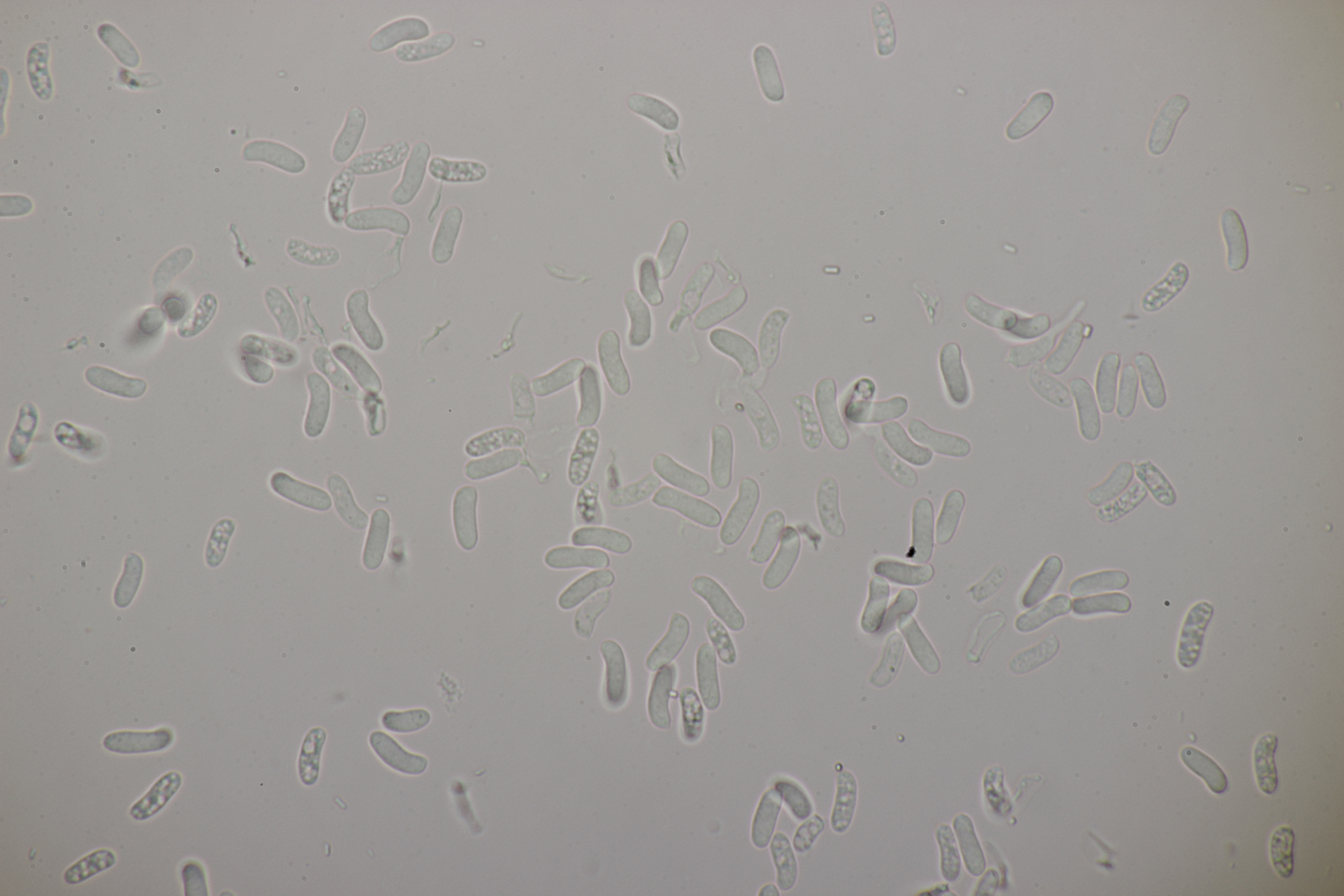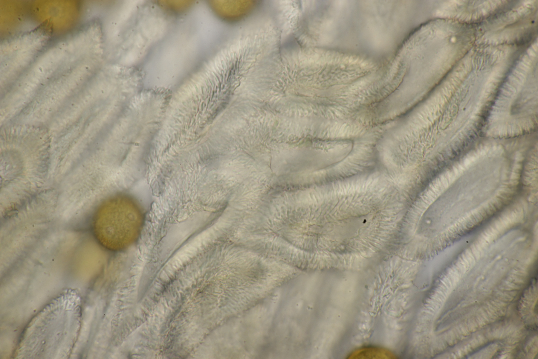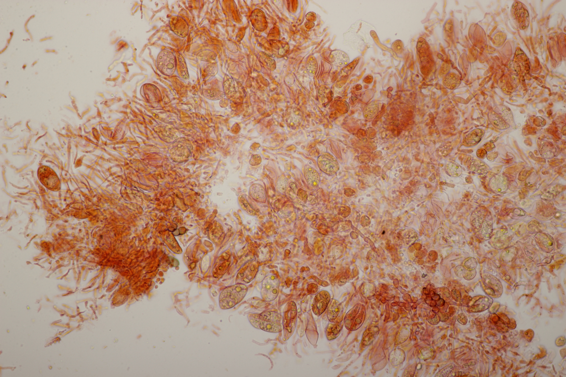 1. Phlebia subochracea. So leuchtend gelb, mit langen Zystiden und Schnallen war das mal ein einfacher Rindenpilz. Sporengröße (4.9+-0.3) µm x (3.1+-0.2) µm, Q=1.6+-0.1