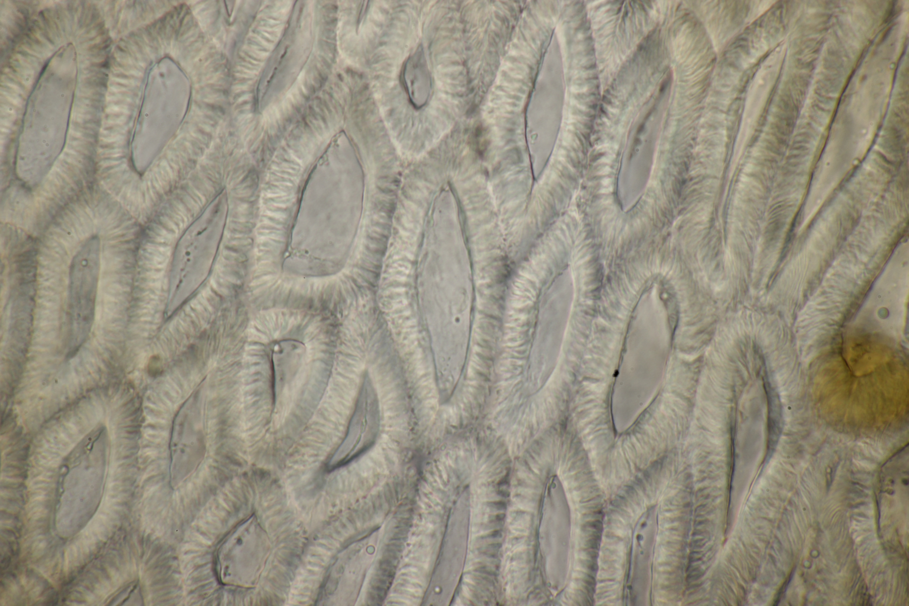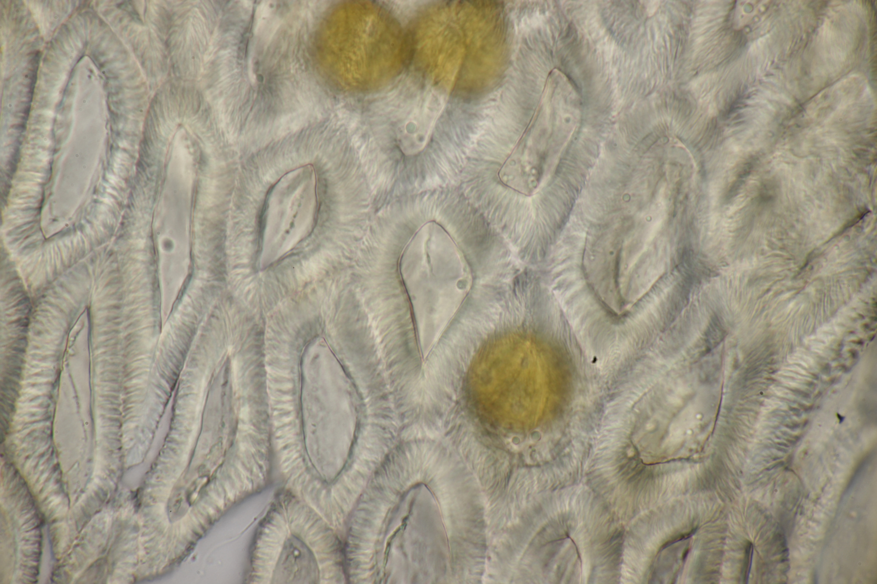 2. Direkt neben den Hemileccinums aus Teil 1 lag ein kleiner Ast mit dem Cythus striatus von oben. Da Karl mir am Vortag schrieb, außer den drei Röhrlingen gäbe es im Stadtwald aktuell keine Großpilze, wollte ich natürlich das Gegenteil beweisen und nahm den Ast um ihn etwas besser ins Licht zu rücken. Dabei fiel mir dann auf der Unterseite ein freudig orange-farbener Belag auf. Der erste Gedanke an eine Tomentella hat sich dann auch mikroskopisch bestätigt. Sporengröße (7.8+-0.5) µm x (6.0+-0.5) µm, Sporen unregelmäßig gelappt, Hyphen mit Schnallen, dünnwandig, schmal. Alle Mikrobilder in KOH, d.h. keine cyanescenten Elemente vorhanden. Eventuell Tomentella umbrinospora?