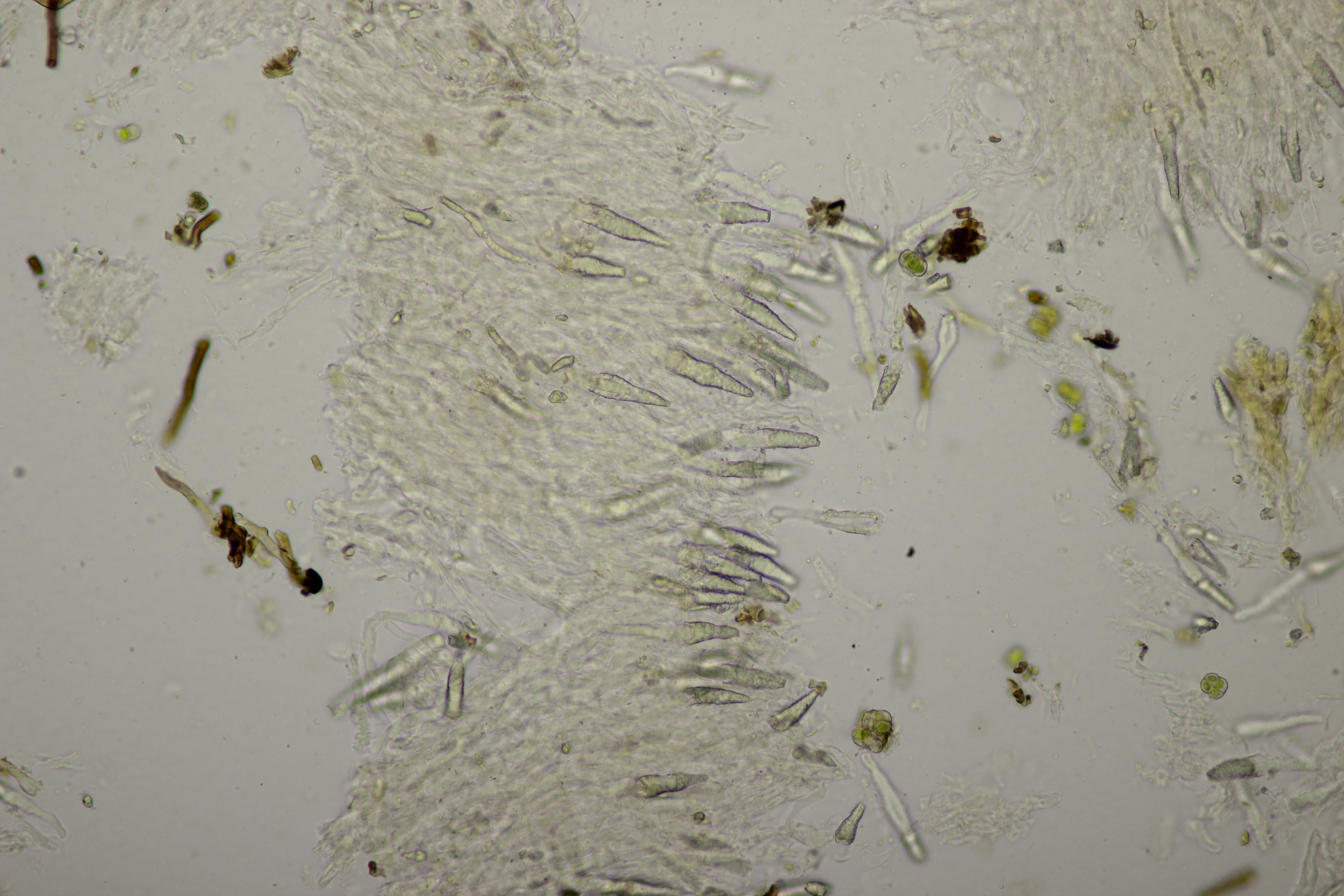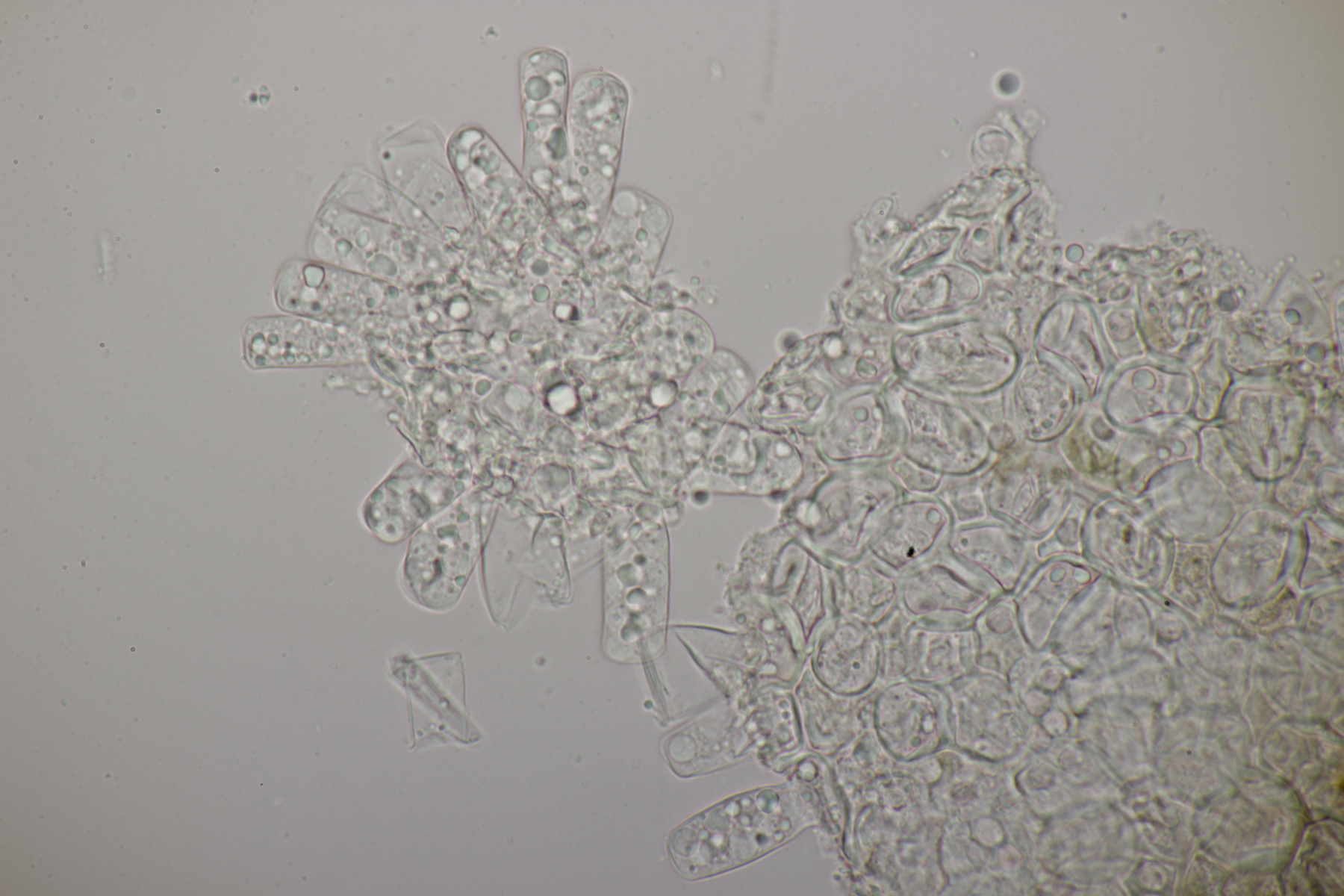 ich habe in der Zwischenzeit noch mal bei Nr. 6 reingeschaut. Da war mir nämlich auch schon aufgefallen, daß es so aussieht, als säßen da zwei Tomentellas übereinander. Die oben gezeigten Mikrobilder stammen von dem dunkelbraunem Fruchtkörper. Interessanterweise sahen die hellen Partien dann im Mikroskop auch genau gleich aus. Insbesondere gab es auch da wieder die kurzzelligen, dickwandigen Hyphen. Es kann natürlich sein, daß ich da Pech hatte und unten drunter noch die dunkelbraune Tomentella saß. Aber dann weiß ich ehrlich gesagt nicht, wie ich die beiden auseinanderdröseln soll...