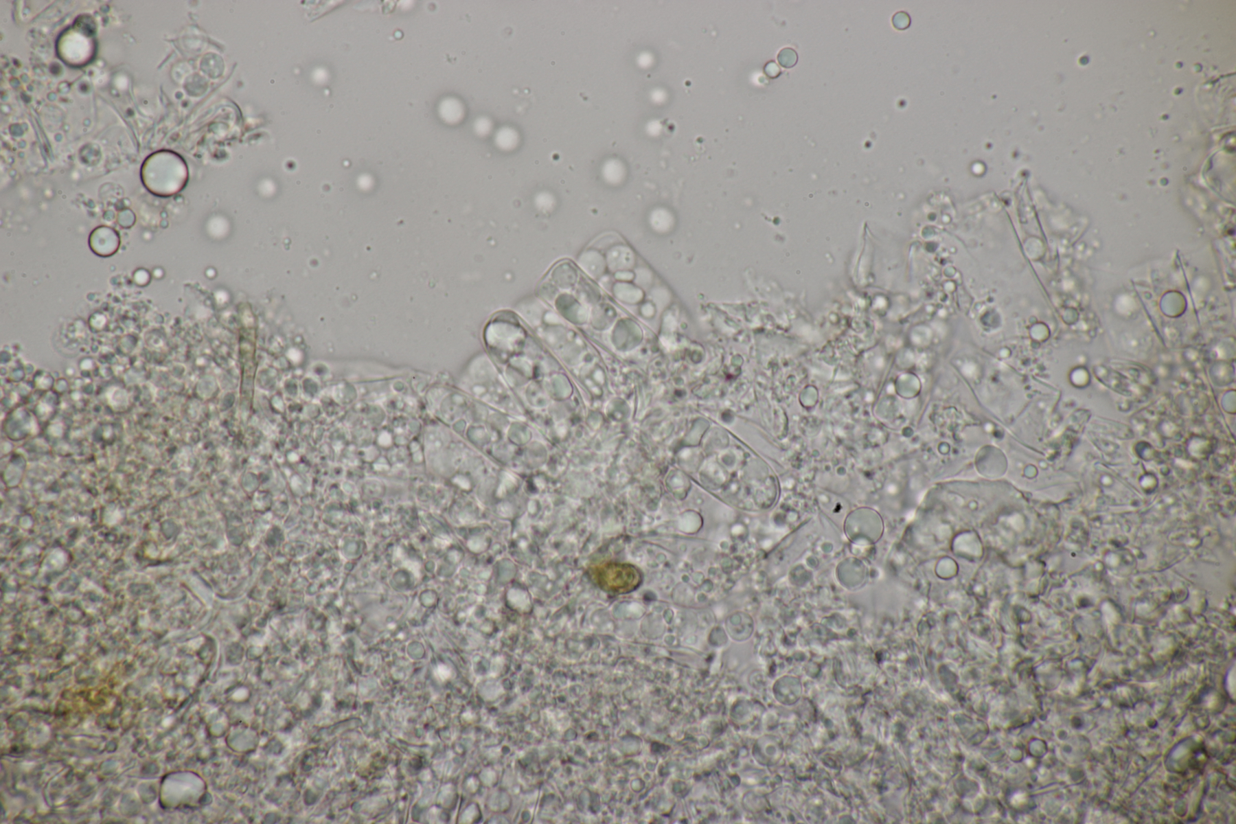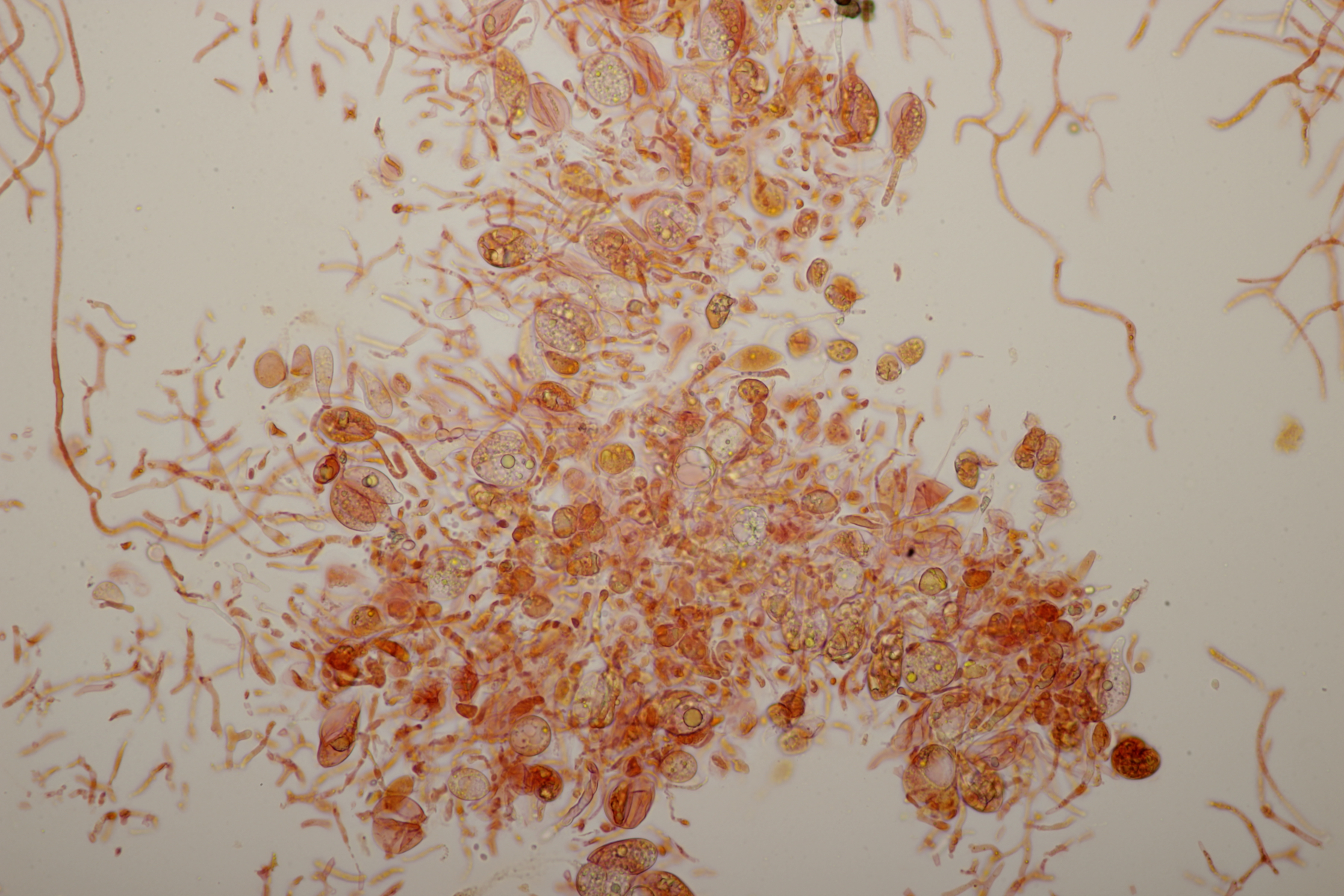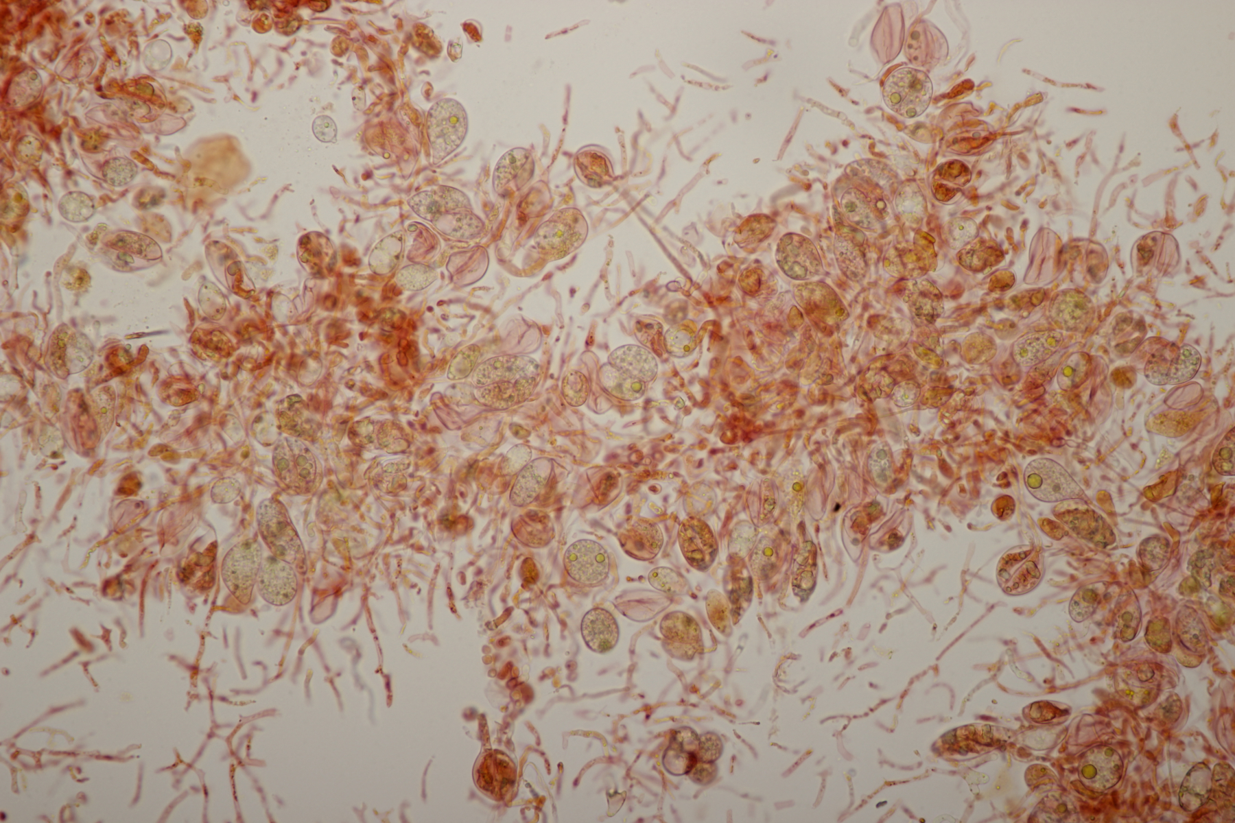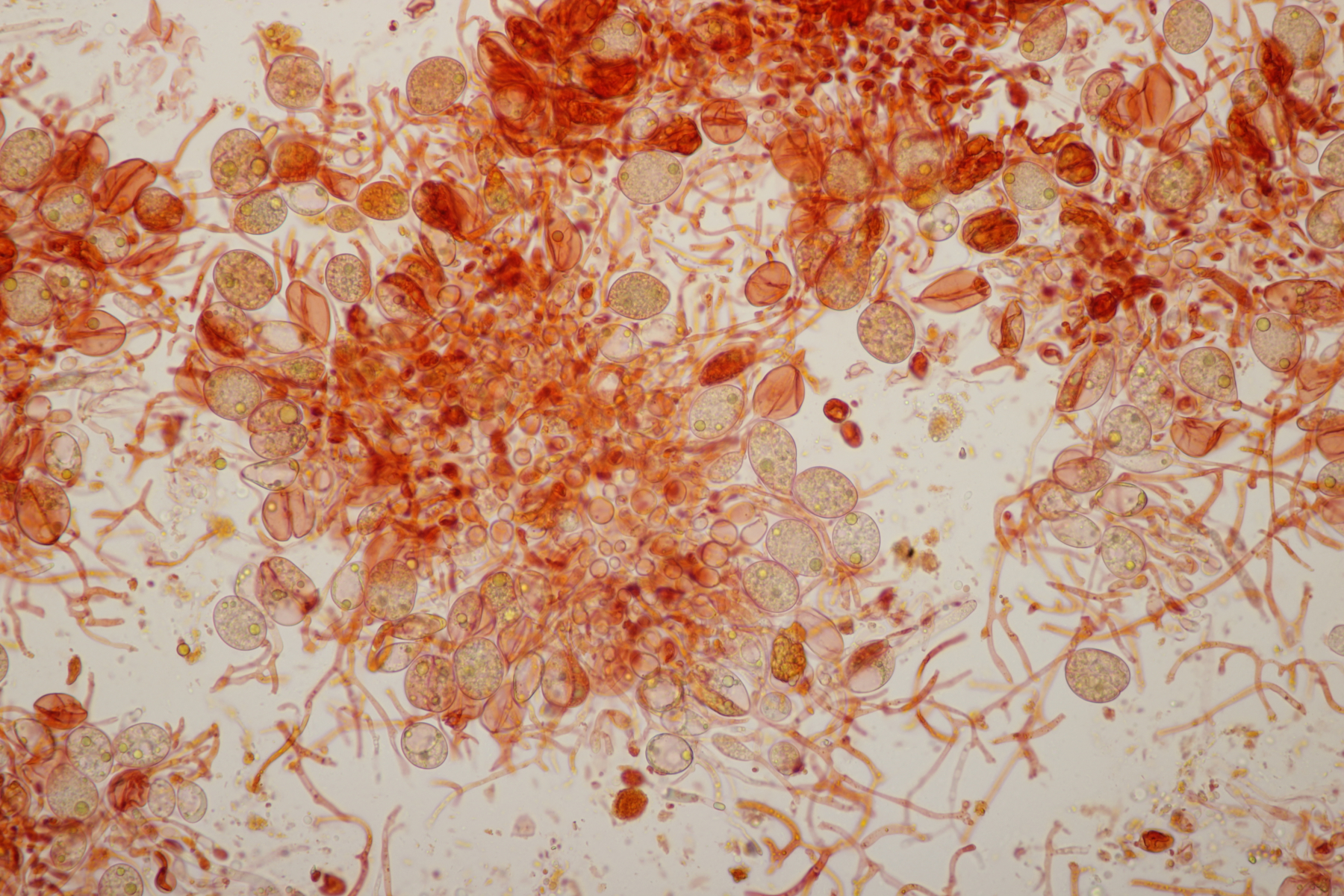 3. Wenn man sich beim Erstellen der Mikropräparate ziemlich nah mit der Nase an den Satansröhrling geklebt hat und dabei den Geruch einer vollen Babywindel wahrnimmt, ist man froh, wenn man anschließend diesen Pilz hier unters Mikro legt. Der Iodgeruch wirkt da direkt angenehm und klinisch rein. Was nicht ganz so angenehm war: Ich hatte mir fürs Mikro eine Hälfte des Pilzes mitgenommen, den Karl schon am Vortag für sein Foto zerschnitten hat. Da war dann bei der Ankunft zu Hause schon einiges an Leben drin erwacht...