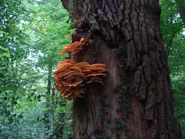 So sehen die Schwefelporlinge im Herbst aus. Eine Aufnahme die ich im Bentheimer-Urwald gemacht habe. Dein Porling wuchs auf einer Pappel in der Aue. Wenn der Pilz vielleicht nicht zu den großen Seltenheiten zu zählen ist, so könnte es sich jedoch bei der Pappel um die Schwarzpappel (Populus nigra) handeln. Eine Besonderheit! Bei dieser Pappel ist die Borke grob und wie Zöpfe verflochten, die Äste sind nicht so aufsteigend wie bei der Hybrid-Pappel, sie sind mehr ausladend.