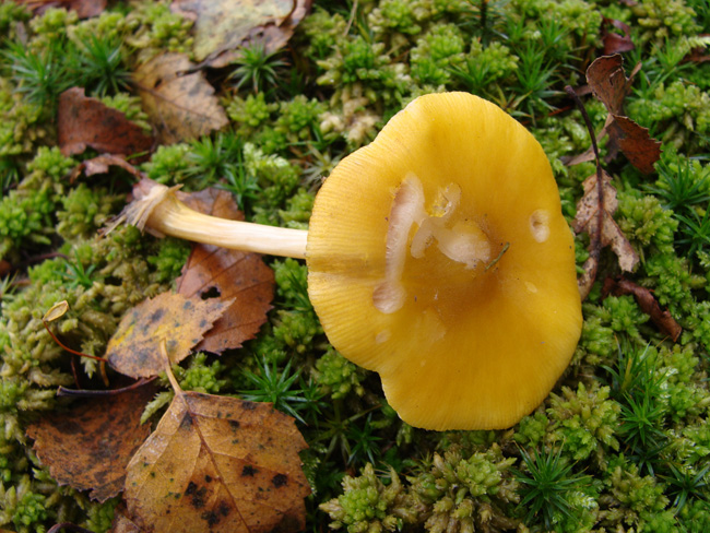 Bei deinem ersten Bild dürfte es sich um einen Gelbmilchenden Helmling (Mycena crocata) Handeln.