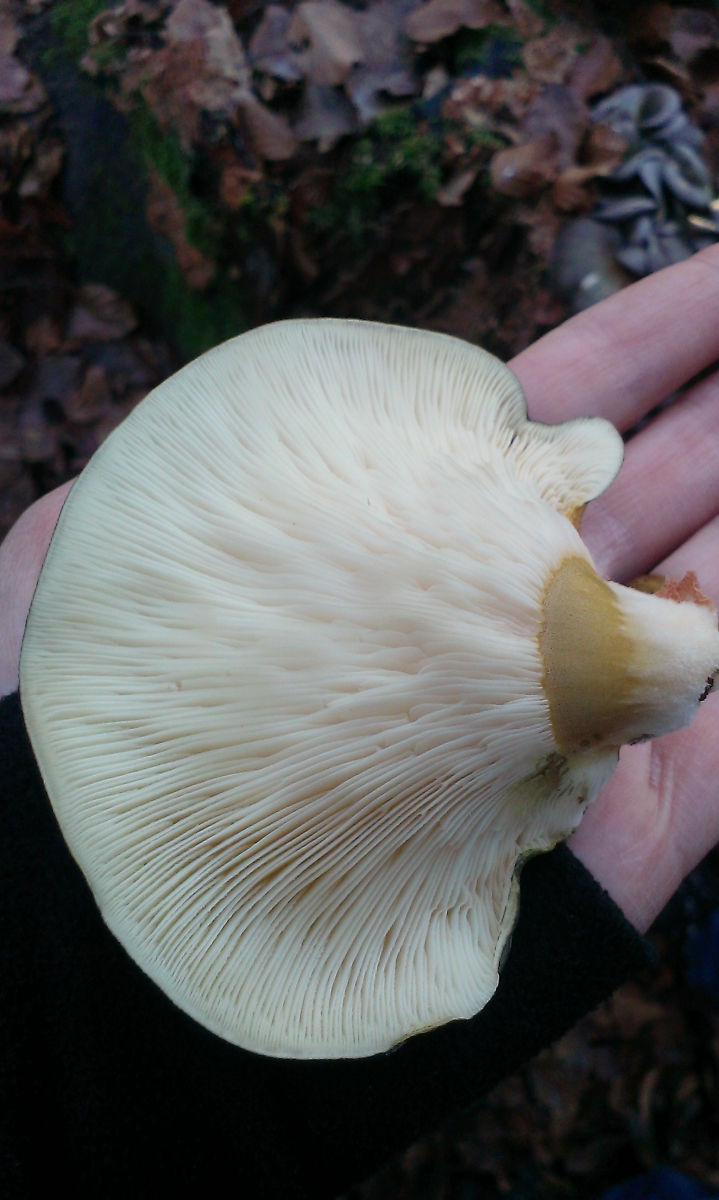 Lamellen: cremefarben, dicht, enden zusammenlaufend an gleicher Stielhöhe