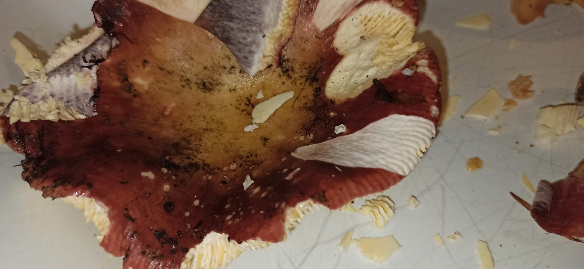 Und zu guter letzt ein Täubling... mitte ausgeblasst, Rand dunkel lila-rötlich.. unter der Huthaus ist er rötlich, schmeckt mild.. habe mir einen nussigen Geschmack eingebildet. Beim Jungen dachte ich an einen Wieseltäubling, aber kein Nadelbaum in der Nähe, sondern Eichen und Lindenbäume. Die Lamellen sind gelblich. Auch das Sporenpulver ist ockergelblich. Könnte es ein variabler Goldtäubling sein? Der Stil ist wattig, kein gelblicher Hauch darauf. Lamellen sehr spröde. Was käme da sonst noch in Frage... denn Goldtäubling gefällt (auch) mir nicht...