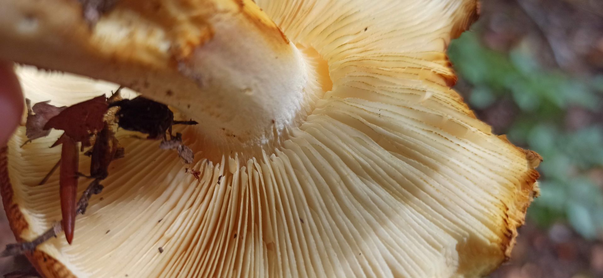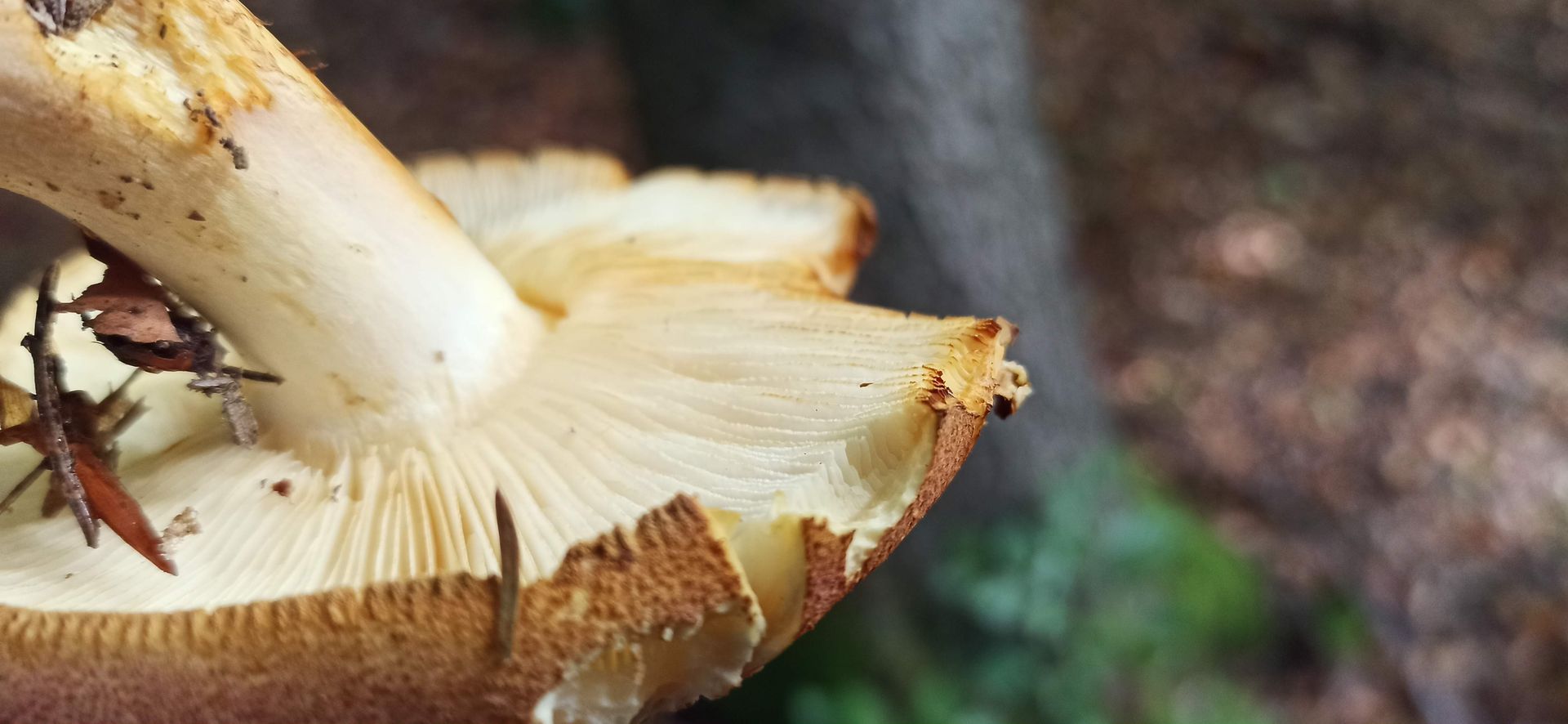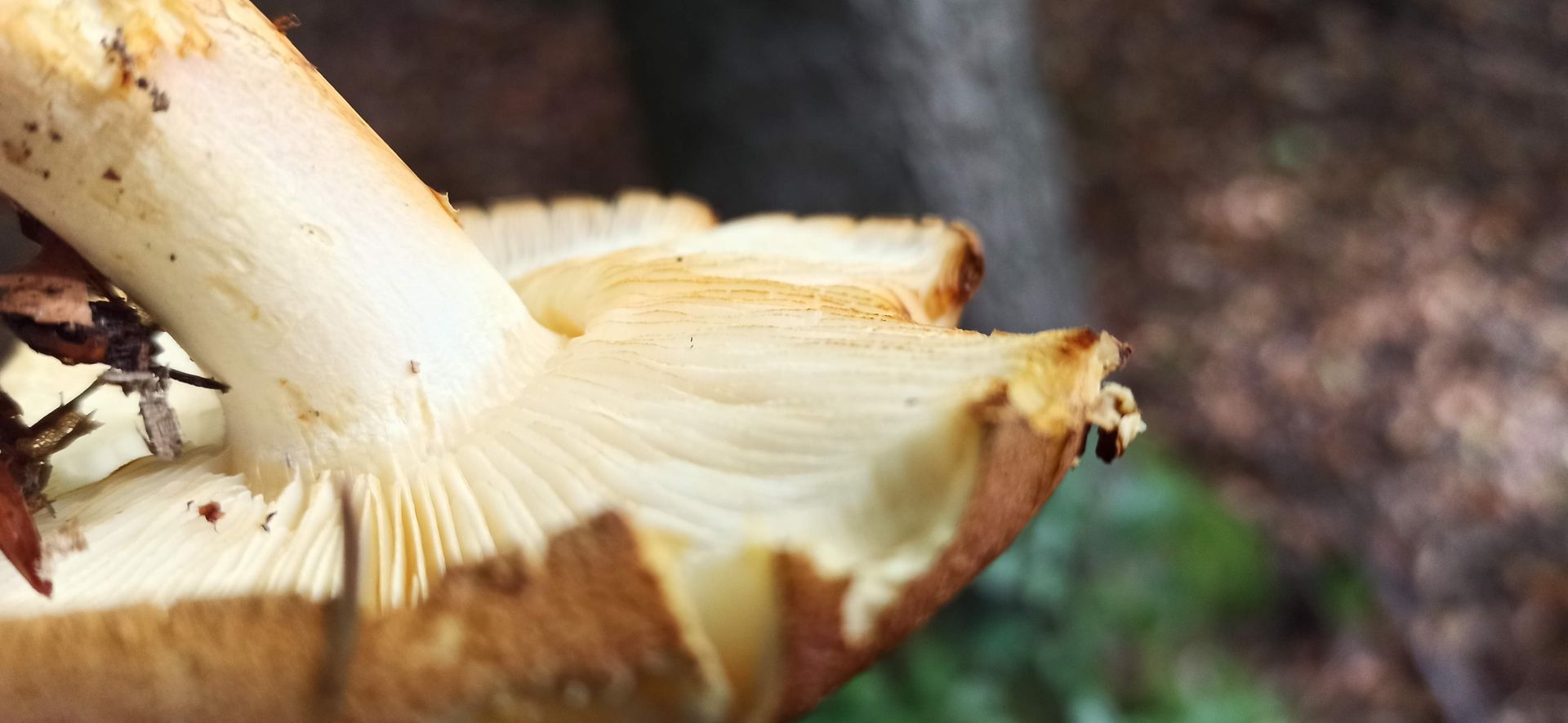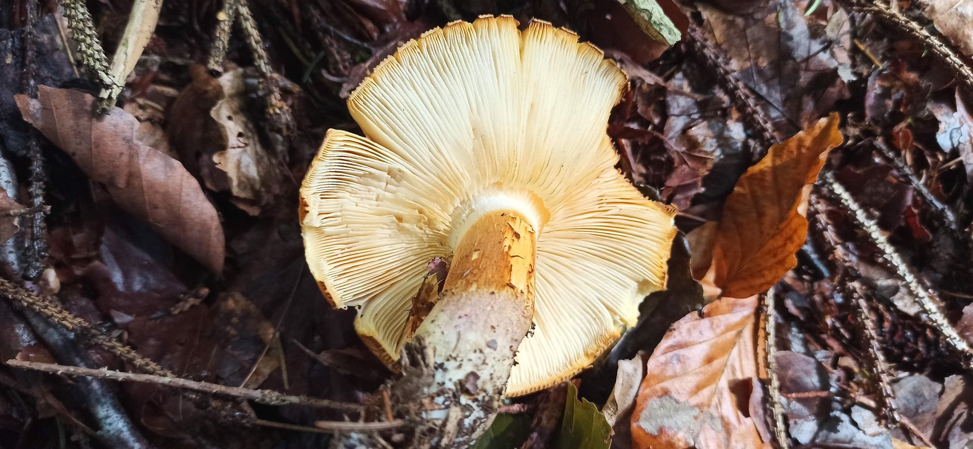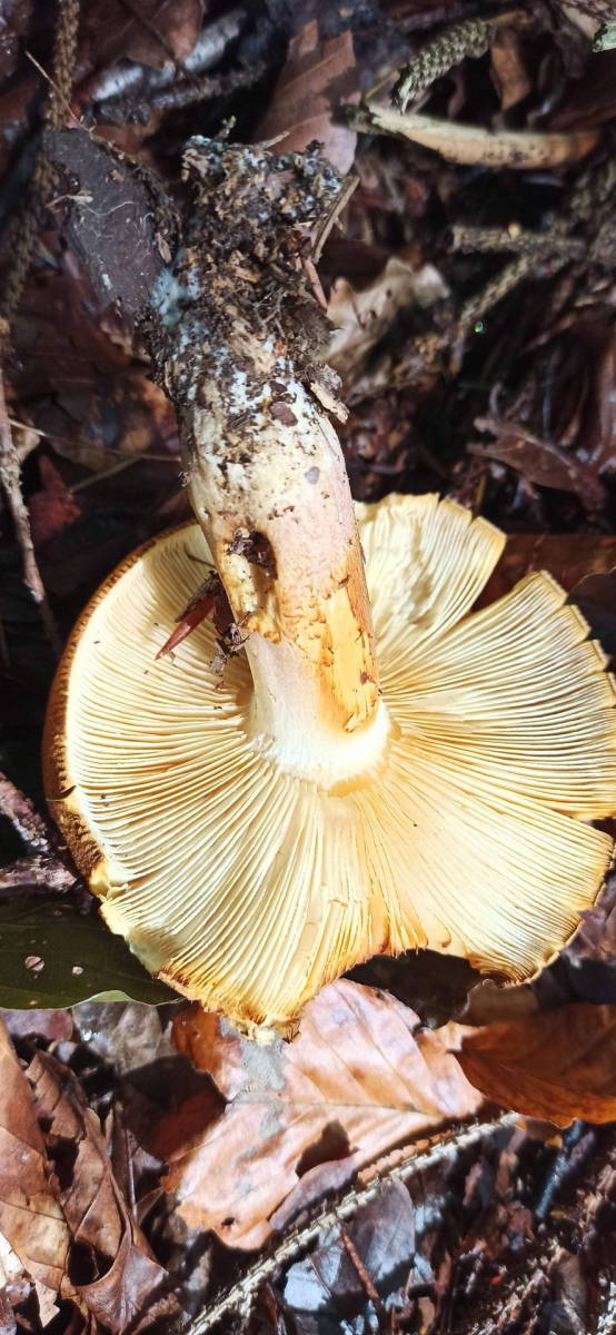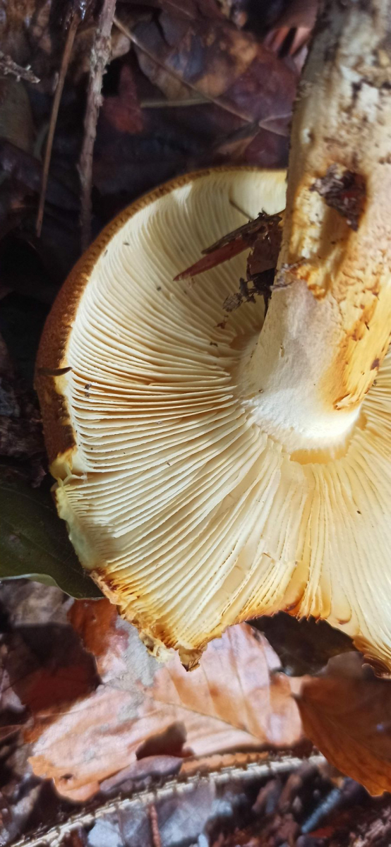 Was mir auffiel: Gesägte Lamellenschneiden, Stielbasis rosalich, auf Hut auch rosa Stellen, Basis erschien mit zugespitzt, die braungelbliche Zone am Stiel, Geruch unangenehm, Mischwald